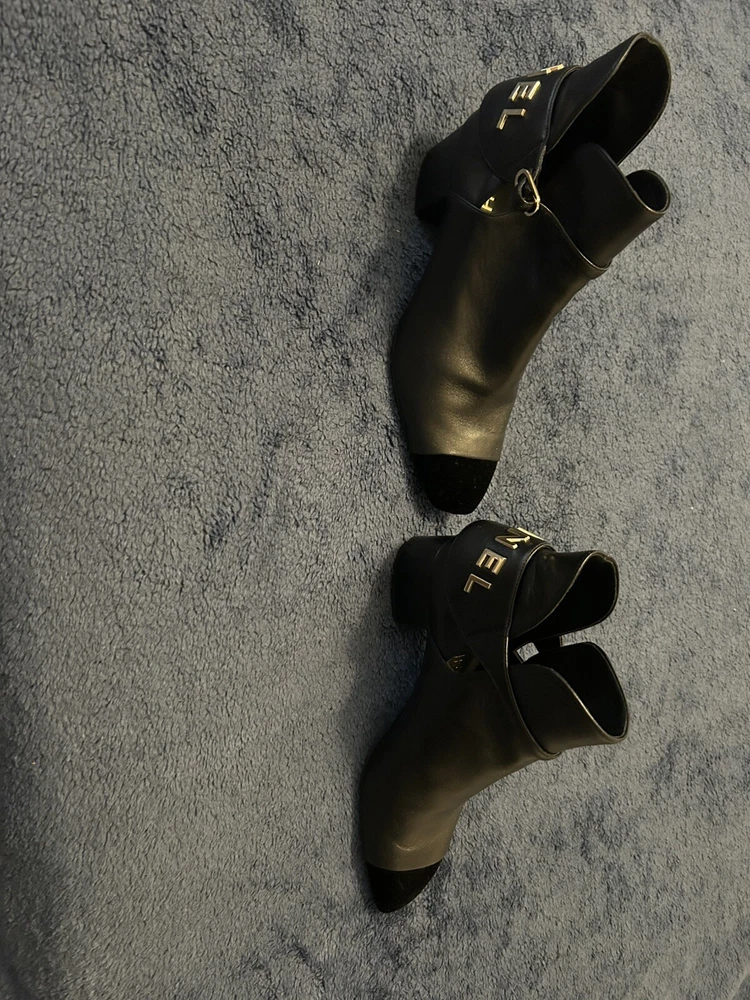 These are CHANEL heels for women in US Size 6.5 and EU Size 37. The shoes are black in color with a solid pattern. They feature a pointed toe design and a mid heel height. The upper material is a combination of leather and suede, and they have a buckle closure.