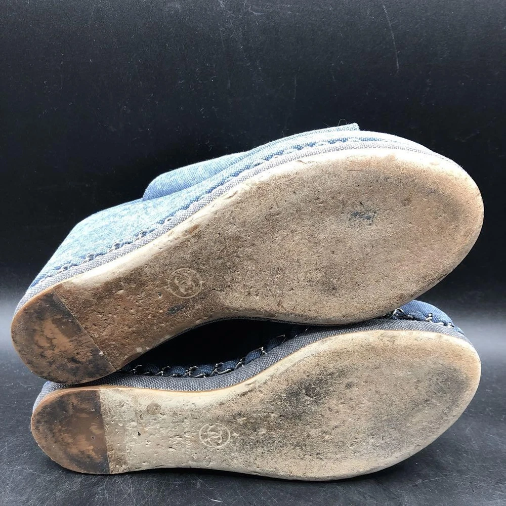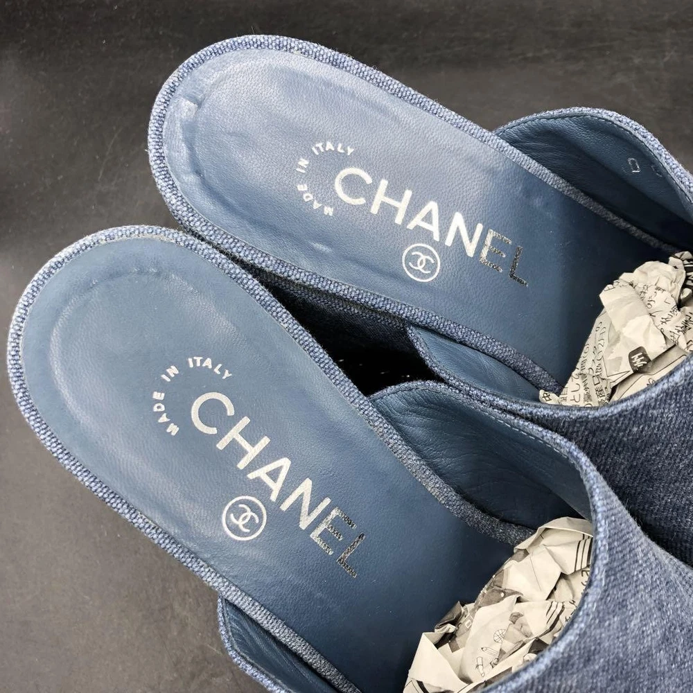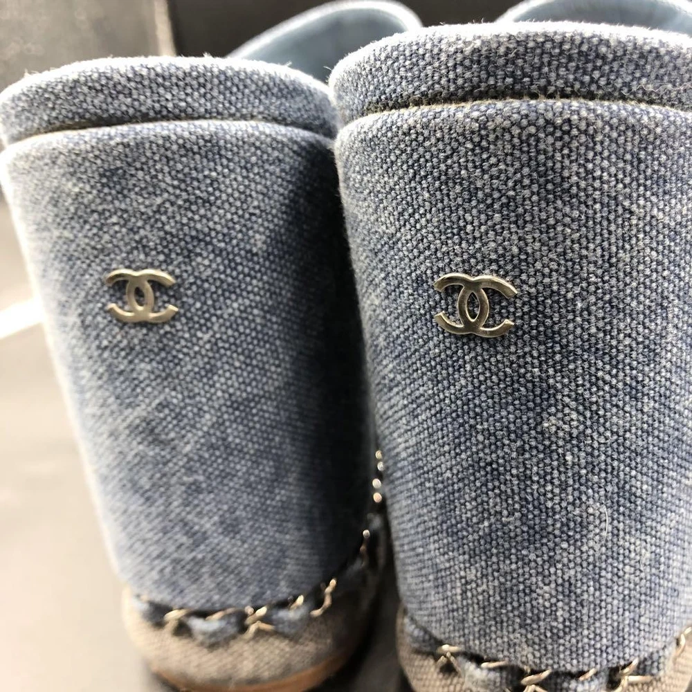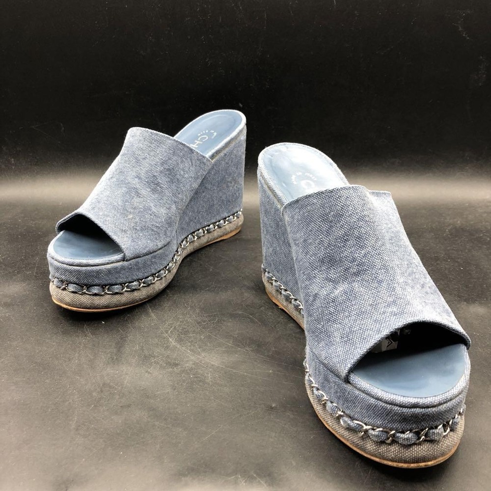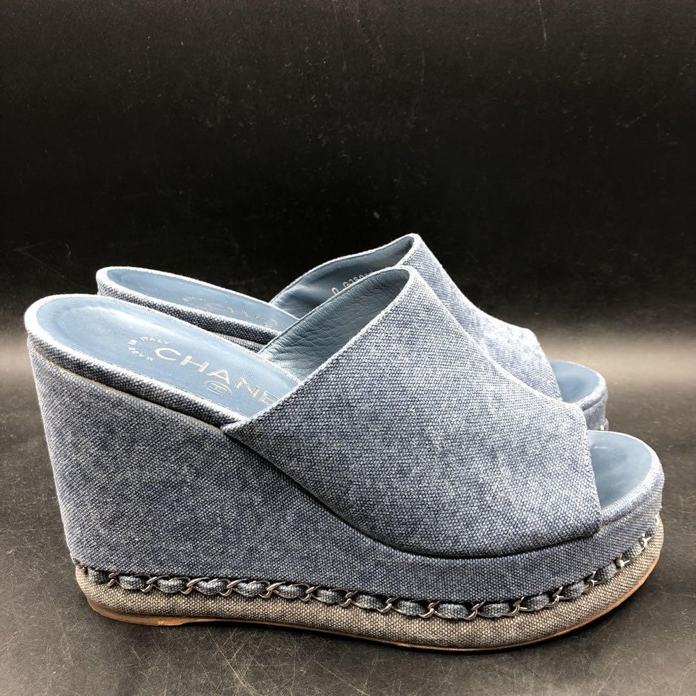 Rare CHANEL CC Logo Denim Wedge Sandals Blue Chain Trim Women's Size 36.5 Description * Brand: CHANEL * Size: 36.5 (Approximately 23.0-23.5cm / US 6 / UK 3.5) * Color: Blue Denim * Condition: Gently Used (AB) * Material: Denim, Chain Trim * Heel Height: 11.5cm (Approximately 4.5 inches) Thank you very much for visiting my auction. Language: Japanese Please judge with a photograph. Please have a question I want to do a good deal Payment I accept PAYPAL Payoneer Please make the payment within 5 days after the end of auction. Shipping Worldwide Shipping: Economy shipping, Japan Post, with tracking number EMS+20$ (insurance &tracking number 3-7 days to USA.) Terms of Sale If you would like to know more about this item, please contact me before bidding. Items will be sent out within 4 business days after the payment received. When there is a different problem from the indicated contents, please tell me about it within two week. I accept returns only if items did not match the description. Buyer pays return shipping. About Us Return is accepted if only the item is different from item's description. Thank you for looking!!! International Buyers - Please Note: ・Import duties, taxes and charges are not included in the item price or shipping charges. These charges are the buyer’s responsibility. ・Please check with your country’s customs office to determine what these additional costs will be prior to bidding/buying. ・These charges are normally collected by the delivering freight (shipping) company or when you pick the item up - do not confuse them for additional shipping charges. ・We do not mark merchandise values below value or mark items as “gifts” - US and International government regulations prohibit such behavior.