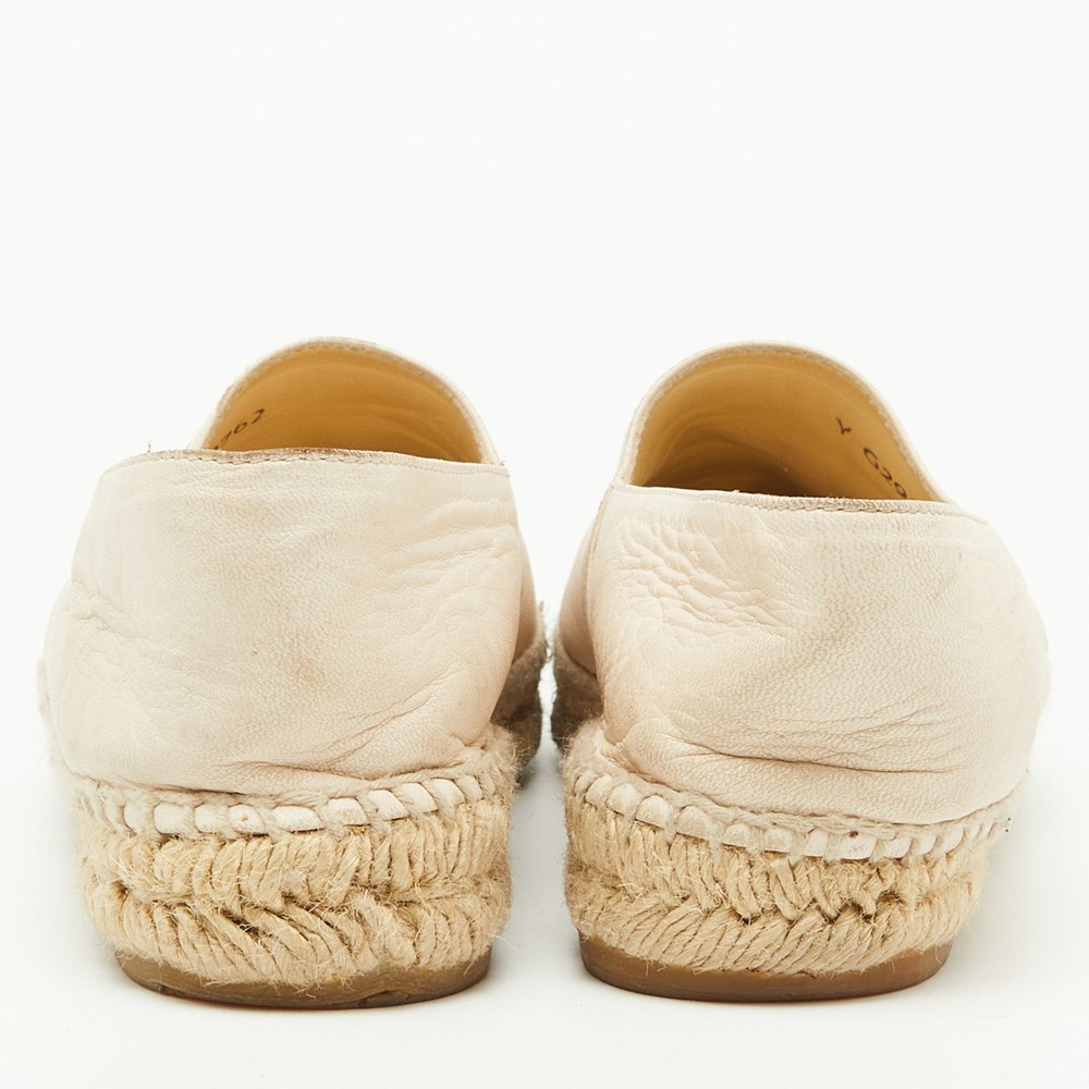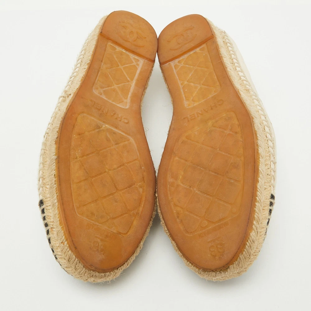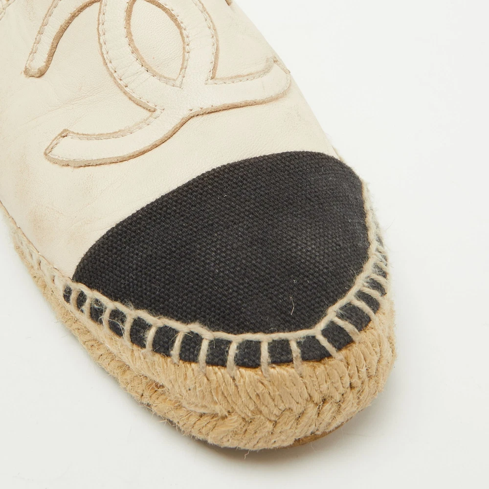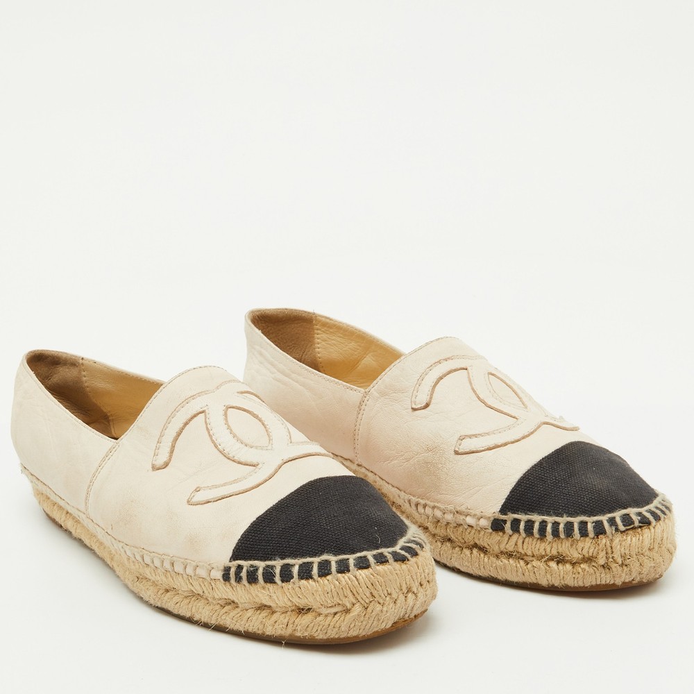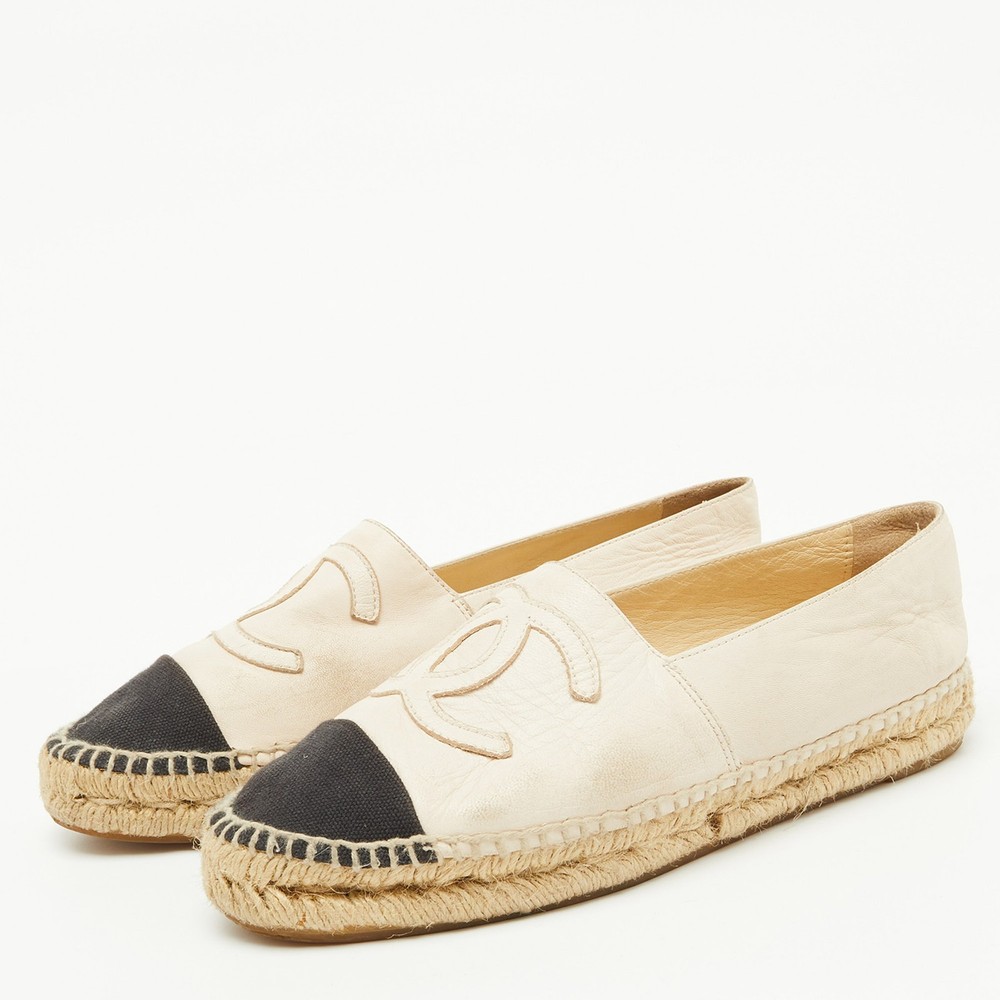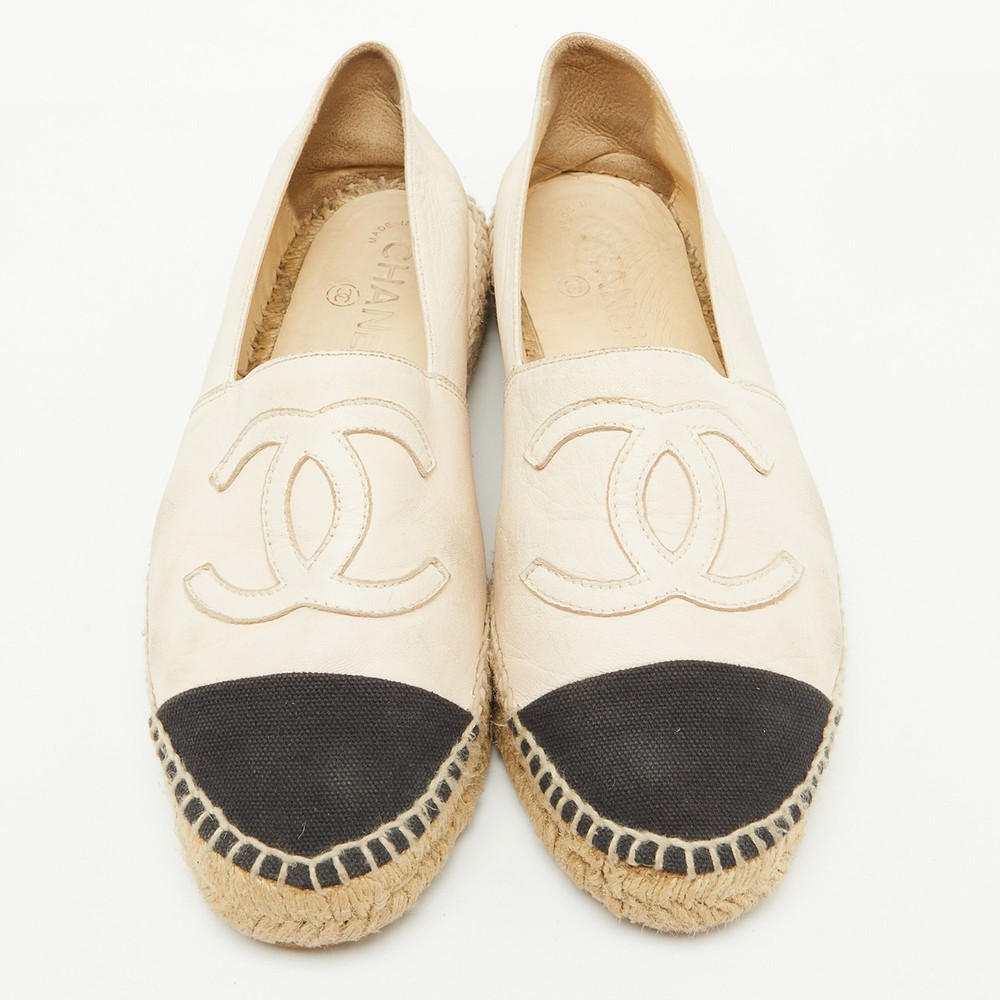 Chanel shoes are known for their unique designs that emanate the labels feminine verve and immaculate craftsmanship that makes their creations last season after season. Crafted from canvas and leather, these espadrille flats are a great combination of style and comfort. They are finished off with the CC logos on the uppers.Certified by The Luxury Closet - This item has gone through a detailed authentication process overseen by our experts. We offer a lifetime guarantee of authenticity on all our items. Import duties, taxes and charges are not included in the item price. These charges are the buyers responsibility. Please check with your country’s customs office to determine what these additional cost will be prior to buying. Our eBay Store About Us Contact Us Add to Favorite Sellers Chanel Off White/Black Leather and Canvas CC Cap Toe Espadrille Flats Size 38 $303.6 Chanel shoes are known for their unique designs that emanate the labels feminine verve and immaculate craftsmanship that makes their creations last season after season. Crafted from canvas and leather, these espadrille flats are a great combination of style and comfort. They are finished off with the CC logos on the uppers. Product Details Brand Color White Dimensions Material Leather Size 38 Outsole Width 8 cm Outsole Length 25 cm Heel Height Includes The Luxury Closet Packaging Certified by The Luxury Closet This item has gone through a detailed authentication process overseen by our experts. We offer a lifetime guarantee of authenticity on all our items. How We Check The in-house team of experts at The Luxury Closet is highly trained to verify the authenticity and the condition of the luxury products. They ensure that only 100% authentic items are put on sale.The evaluation process is unique with its own mix of assessment criteria and differs according to the category. Each item is evaluated based on the following combination of hallmarks, hardware, stitching, symmetry, material, craftsmanship, stamping, codes, hologram stickers, and packaging. Our authenticators also check if the items have been modified or amended (e.g., aftermarket diamonds, replaced batteries, repaired bags, etc.) International Buyers Import duties, taxes and charges are not included in the item price. These charges are the buyers responsibility. Please check with your country’s customs office to determine what these additional cost will be prior to buying.