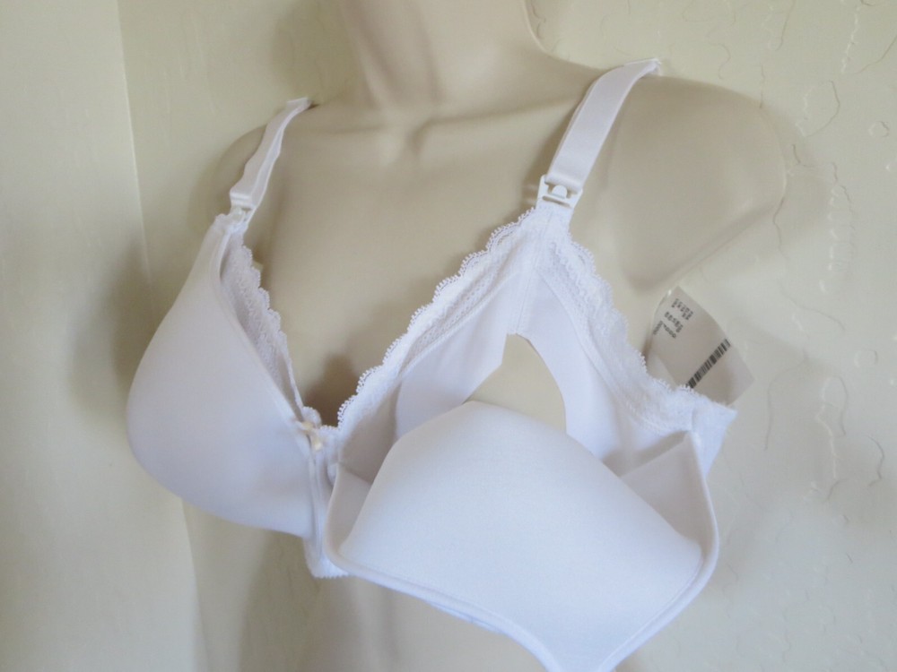 CHANTELLE BRA CONDITION: NEW WITH TAG STYLE #: 1871 SIZE: US 40 DDDD, FR 105G, EUR 90G, UK 40F HOOKS: 4 ROW AND 4 COLUMNS COLOR : WHITE ... AS SHOWN DESCRIPTION: ACTUAL ITEM AS SHOWN EXCEPT NUDE ON MODEL. FROM SMOKE FREE HOME Chantelle UNDERWIRE SPACER NURSING BRA MSRP $74 The soft, light cups and flexible underwires on this nursing bra mean comfort for you and your baby. Spacer foam adds light padding that's breathable. Made of polyester, polyamide and elastane. Underwire cup with light, firm stretch spacer foam is breathable and comfortable. Underwire stops before top of band for comfort. Encapsulated cup will not collapse during nursing. Full inner support slings are trimmed with lace and help position breast for added support while nursing. Plastic nursing clips are easy to snap open with one hand. Center panel - tall and arched to give high tummies extra room. Tall, smoothing sides and back have sewn-on elastic edges. Wide-set elastic straps fully adjust in front with coated metal hardware. Coated metal back hook-and-eye closure. Leotard back. Designed in France. LET US RESOLVE ANY PROBLEM BEFORE LEAVING NEGATIVE/ NEUTRAL FEEDBACK. THANK YOU