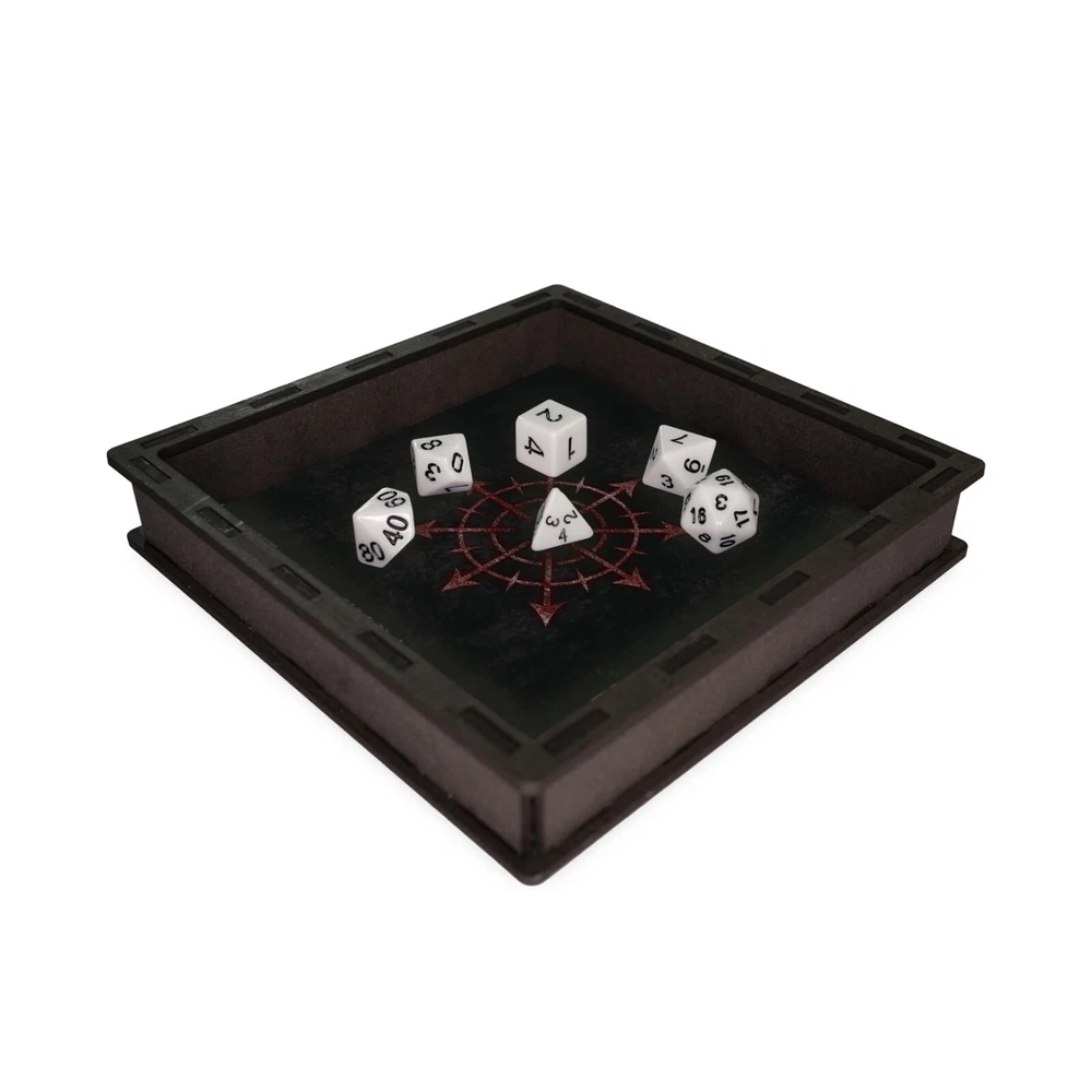 Wooden Dice Tray Inlay on printed neoprene Tray for rolling dice / tabletop games External Size - 17cm x 17cm x 3cm; Internal Size - 15cm x 15cm x 2.5cm Dice NOT included Made and hand finished from laser cut black MDF with printed neoprene inlay for a statement tray with an even rolling surface. Prevents lost dice, crawling around on the floor for that elusive D20, chasing the dog for a die they've picked up, arguing over a strategically placed corner die wedged in the carpet etc. I offer safe and secure worldwide shipping, and can combine shipping at only 50p per additional item (highest base rate applies). If you like what you see please check out my other listings, follow me on Pinterest, or favourite my shop for updates on new items! Please note all my items are made to order in the UK and dispatched within the stated time frame. Not quite what you're looking for? Please check out my other items here- https://www.ebay.co.uk/sch/finch_rock_123/m.html