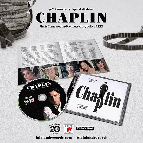 La-La Land Records, StudioCanal and Sony Classical celebrate the 30 th Anniversary of the 1992 big-screen biographical drama CHAPLIN with a newly remastered, deluxe presentation of the film’s original motion picture score by legendary composer John Barry. Barry’s notable and elegant orchestral score, considered one of late composer’s last great works for the cinema, is an integral part of this creative and thoughtful chronicling of the career of the great Charlie Chaplin starring Robert Downey, Jr. and directed by Richard Attenborough. Romantic, dramatic, comedic and more, Barry’s diverse and thematically rich original score, recorded at Abbey Road with the English Chamber Orchestra, also interpolates a number of Chaplin’s own music compositions such as “Smile” and his scores to CITY LIGHTS and LIMELIGHT. Produced by Neil S. Bulk and mastered by Doug Schwartz, this special limited edition CD presentation is expanded with previously unreleased material and includes exclusive liner notes by journalist/author Jon Burlingame. This release is limited to 3000 units and features art design by Scott Saslow. TRACK LISTING: 1. Chaplin-Main Theme 3:08 2. Hannah’s Hope† / Workhouse Chase / Mudflats 3:00 3. To The Asylum :57 4. Charlie On Riverbank 1:10 5. Charlie Proposes 3:01 6. Charlie Goes To The U.S. 2:57 7. In The Cutting Room 2:15 8. Discovering The Tramp / The Wedding Chase 4:03 9. Funny With A Hose / This Is My Work 1:26 10. News Of Hetty 1:01 11. Chaplin’s Studio Opening 1:58 12. The Roll Dance 2:34 13. To Salt Lake City 1:07 14. Salt Lake City Episode* 2:11 15. Tea For Four† 1:14 16. Hetty’s Dead / Smile** 2:43 17. Remembering Hetty 2:58 18. I Had No Home :31 19. From London To L.A. 3:21 20. The Hungry People / Smile** 1:50 21. Farewell Sweet Prince** 1:25 22. Joan Out Of Control :58 23. Joan Barry Trouble / Oona Arrives 2:15 24. Premiere Fanfare :43 25. It’s All Over / Guilty 1:20 26. Theme From “Limelight”* :48 27. They’ve Thrown You Out 1:14 28. Madness, Charlie? 1:00 29. Smile** 2:05 30. The Roll Dance 1:48 31. Chaplin-Main Theme / Smile* 4:47 32. Smile** 3:37 TOTAL SCORE TIME 66:25 ORIGINAL ALBUM SUITES 33. Early Days In London† 4:18 34. To California / The Cutting Room 3:44 35. News Of Hetty’s Death / Smile** 3:43 TOTAL SUITES TIME 11:48 TOTAL ALBUM TIME 78:13 *Composed by Charles Chaplin **Contains “Smile” composed by Charles Chaplin † Contains “The Honeysuckle and the Bee” by William Penn and Albert H. Fitz This is a CD format release.
