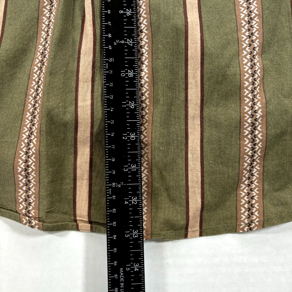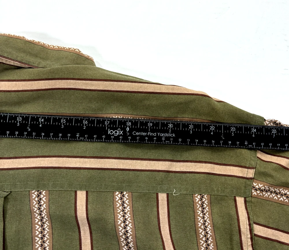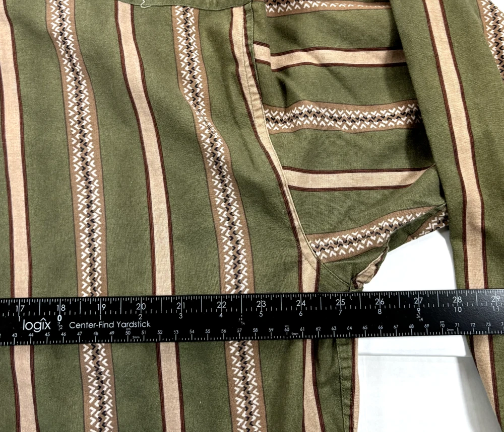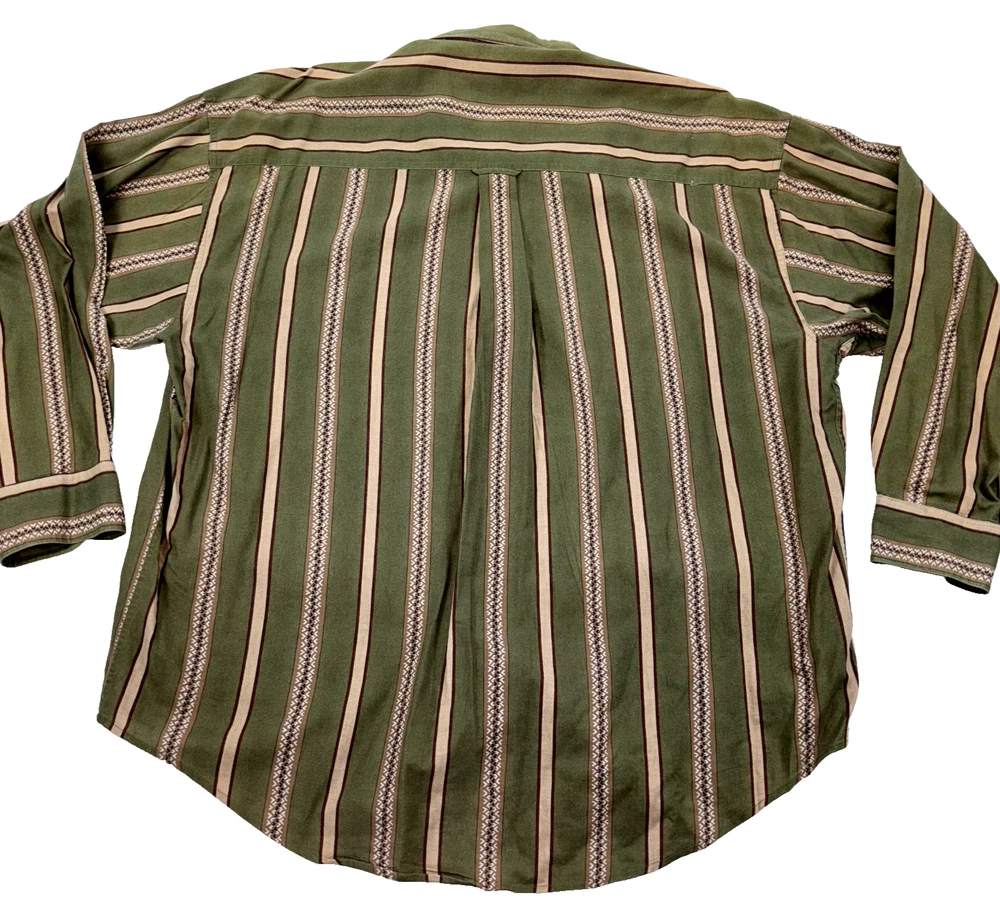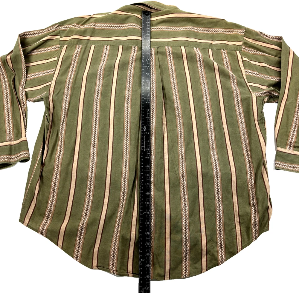Chaps Ralph Lauren Shirt Green Geometric Striped Long Sleeve Pocket Button Up XL Please refer to photos for the most accurate measurements, description, and estimation of the item's condition. We’re happy to answer any questions or provide additional photos before purchase if requested! All items are sold as is and we try our very best to note any issues with condition in both our description and close up photos. Please remember that colors can look different across different devices and monitors. Condition: Please see photos for measurements. Any further measurements needed? Just ask! EUC Pre-Owned: shows minimal to no signs of wear, as expected with typical well cared for use such as slight fading of colors with age. Please make sure to double check measurements for the best representation of fit, as brands can vary in sizing. Comes without sales tags, dust bag, or brand box. Will it Fit Check? Please reference the listed measurements (in photos and/or text) before purchasing. Fit check tip: Grab your favorite similar style item at home, lay the garment on a flat surface, and measure shoulder to shoulder, the width (armpit to armpit), and length (top to bottom). Then compare your measurements to those in our listing! If you need any further measurements not noted in the listing, please feel free to request, we will get back to you asap. FAST SHIPPING! Orders are usually shipped within 24 hours M-F Friday orders will ship Monday morning at the latest, unless there is a postal holiday. Feel free to send us a message before purchase if you?d like a certain delivery service or combined shipping offers. Still got Questions? Send us a message! We do our best to accurately and thoroughly represent each item in images and condition description, but, if there's any further information you'd like before purchasing or have a shipping request, please don't hesitate to ask and we'll get back to you asap. RETURN POLICY: Please reach out prior to purchase with any questions or shipping requests. Returns are accepted within 30 days, buyer pays return shipping. Refund issued upon receipt of item in original condition. Full refund (minus original shipping) will be issued once we receive the item assuming it is in the exact same condition as it was shipped.(Clean, unaltered, tags still attached if item was new with tags, etc.) We request that you select "Item does not fit" when returning an item that does not fit. Thank you for shopping small and supporting our lil' Rodeo!