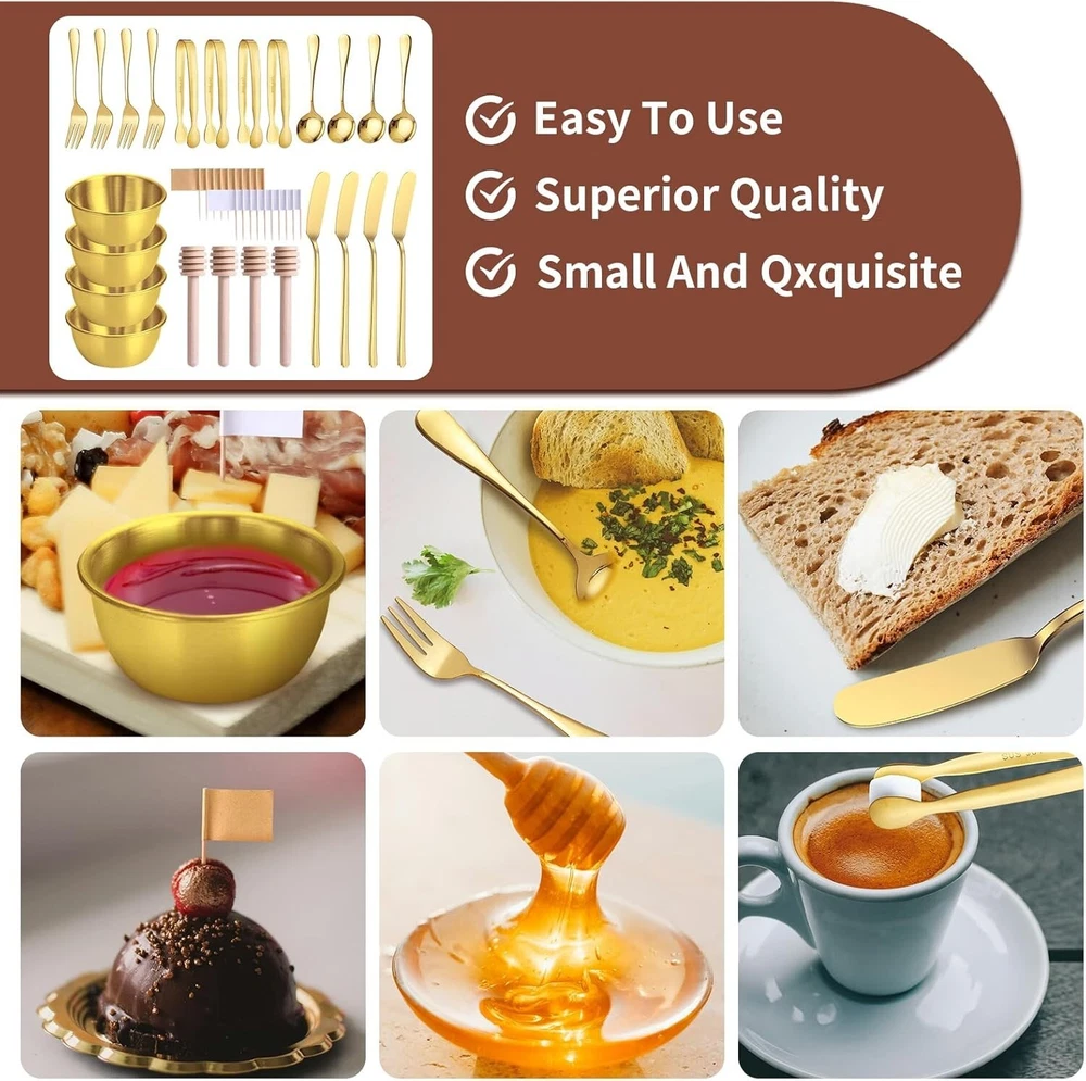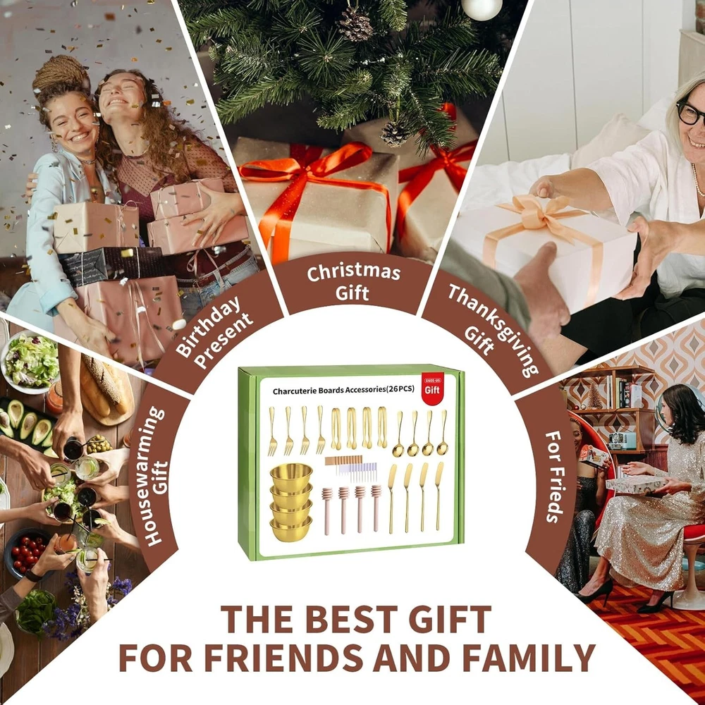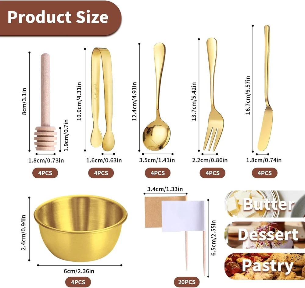 Charcuterie Boards Accessories, Gift Box Packaging Charcuterie Utensils, Stai... Description : 【Charcuterie Boards Accessories Gift Box Packaging】The set includes 4 butter knives, 4 charcuterie bowls, 4 mini forks, 4 small spoons, 4 mini pliers, 4 wooden honey spoons, and 20 toothpick flags. They are excellent with charcuterie board, very suitable for daily life, picnic, barbecue party and so on 【Exquisite Gift Box Packaging】Our charterie boards accessories set features an exquisite gift box design, making it an ideal choice for Christmas, anniversaries, and other special events. This is the perfect gift for friends and family. 【Materials】This butter knives set features premium stainless steel blades for a comfortable grip. The smooth blades make slicing and spreading effortless. With durable 304 stainless steel spoons, forks, and mini tongs, this set resists bending, oxidation, and rust—perfect for any kitchen style! Enjoy functionality and elegance in your culinary adventures 【Wide Applications】These charcuterie accessories are perfect for any gathering! The versatile spoons, forks, and tongs are ideal for serving coffee, desserts, yogurt, ice cream, appetizers, sauces, condiments, sugars, and more. They are excellent with charcuterie board, very suitable for daily life, picnic, barbecue party and so on. 【Complete Charcuterie Utensils Set】The butter knife features seamless integrated technology for a smooth, safe, and comfortable grip. The mini serving tongs, crafted from premium 304 stainless steel, are sturdy and easy to handle. The mini spork is perfect for both children and adults. Use the mini dipping bowls for condiments, jams, honey, and desserts. Plus, toothpick flags serve as cheese and butter labels for easy identification! 【Easy to Use】Featuring an ergonomic handle and lightweight design, these cheese knives are perfectly sized with rounded grips for effortless handling. Enjoy a comfortable cutting experience every time!