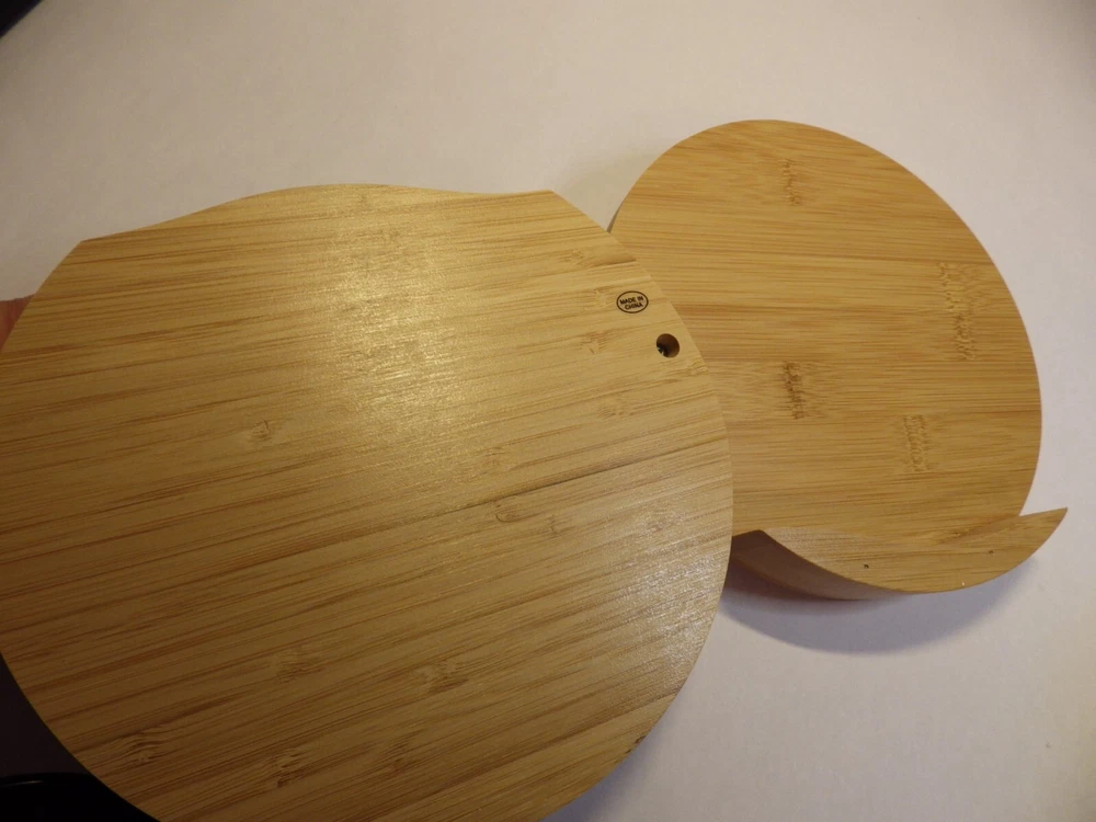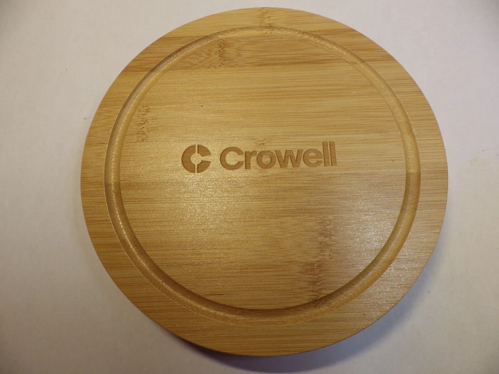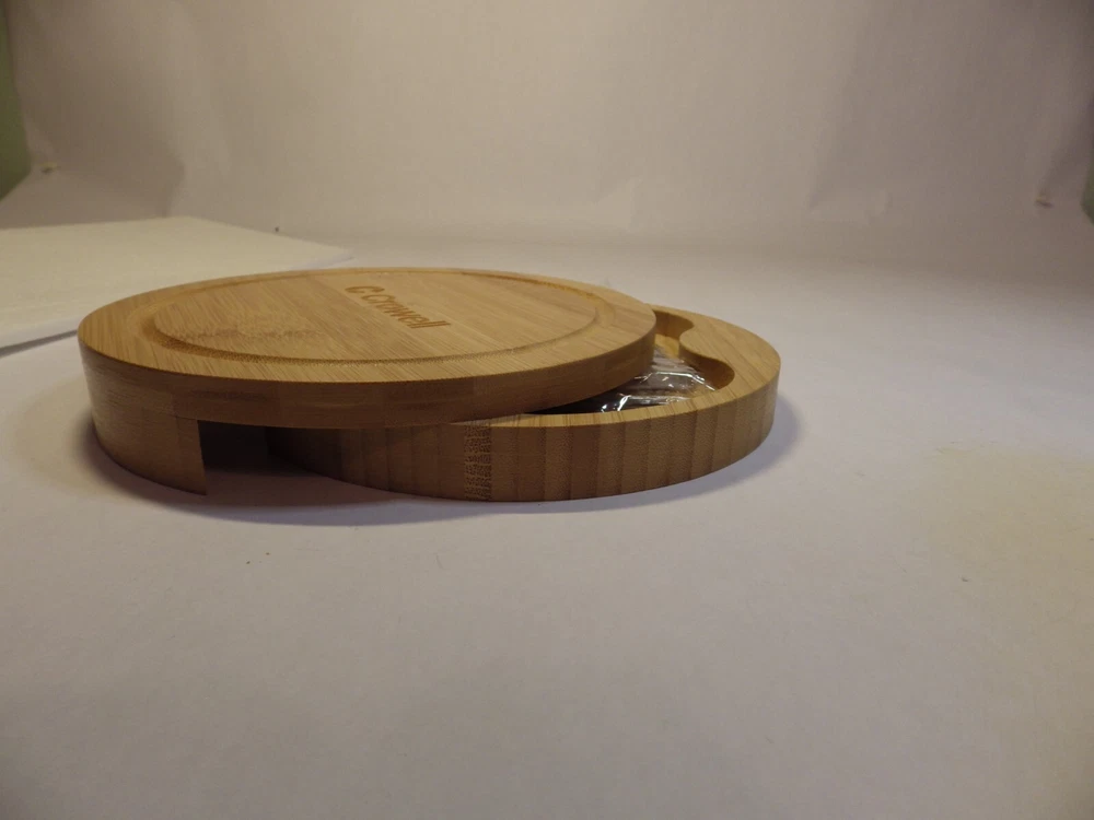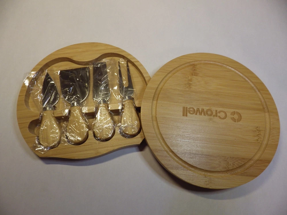 Cheese knife Serving Set with Bamboo box Set includes: Plane knife - for soft cheese Spatula - for cutting and shaving cheese Semi heart - for hard cheese Cheese fork Bamboo board style box Beautiful knife set with sustainable bamboo handles. Perfect for serving the family, guest or yourself! Great as a gift! Round storage box is 8 inches in diameter **I believe this may be a promotional item. At first I thought Crowell was the maker, but my research could not support that. Thank you, BBHM