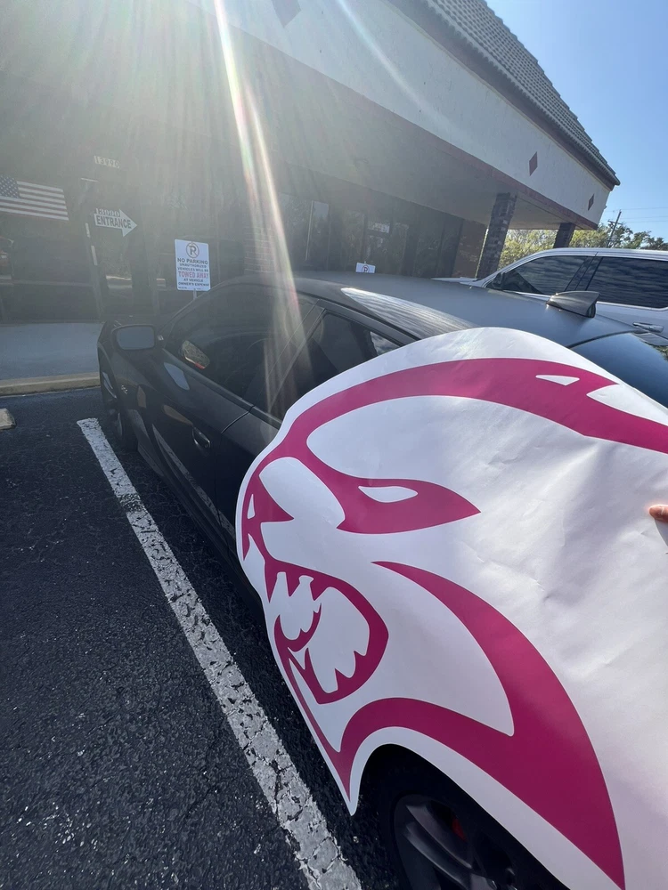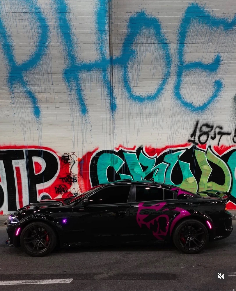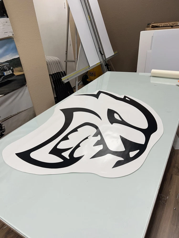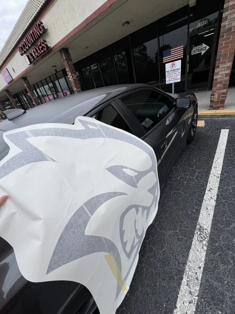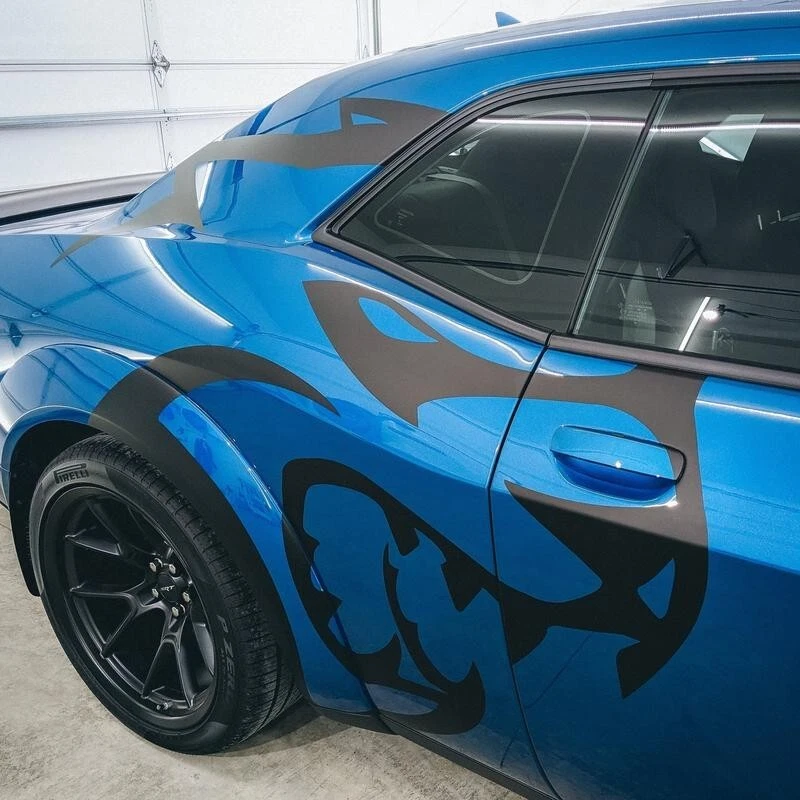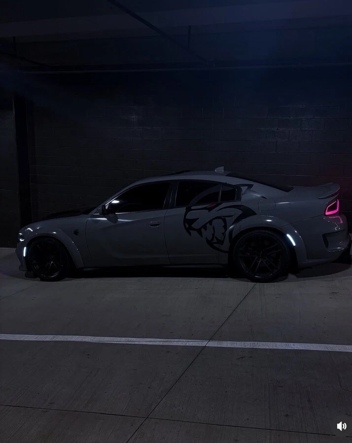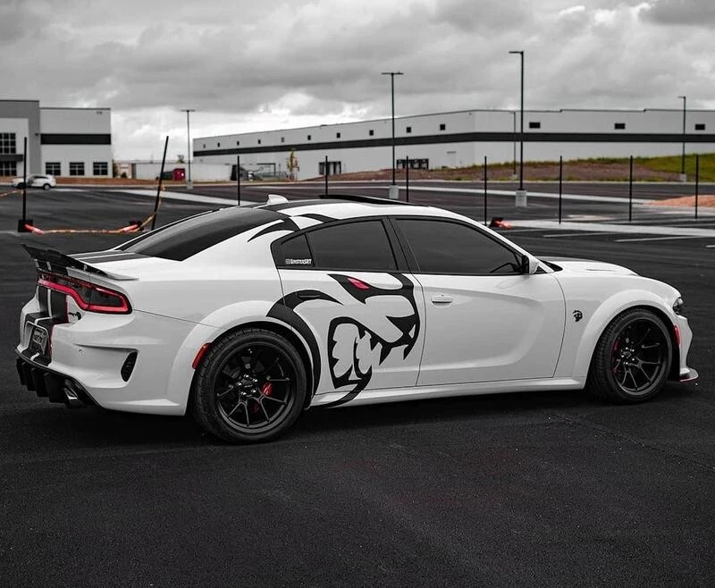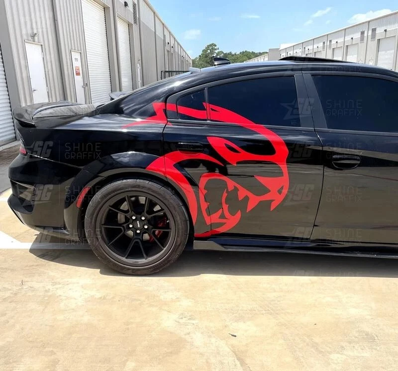 The product is a set of Charger/Challenger XL Rear Side Hellcat Decals designed for vehicles, particularly Chargers and Challengers. These decals are made of vinyl and are intended to be placed on the rear side of the vehicle. The design features a Hellcat motif on both sides, adding a graphic element to the vehicle's exterior. Perfect for those looking to customize their car with a sleek and unique touch.