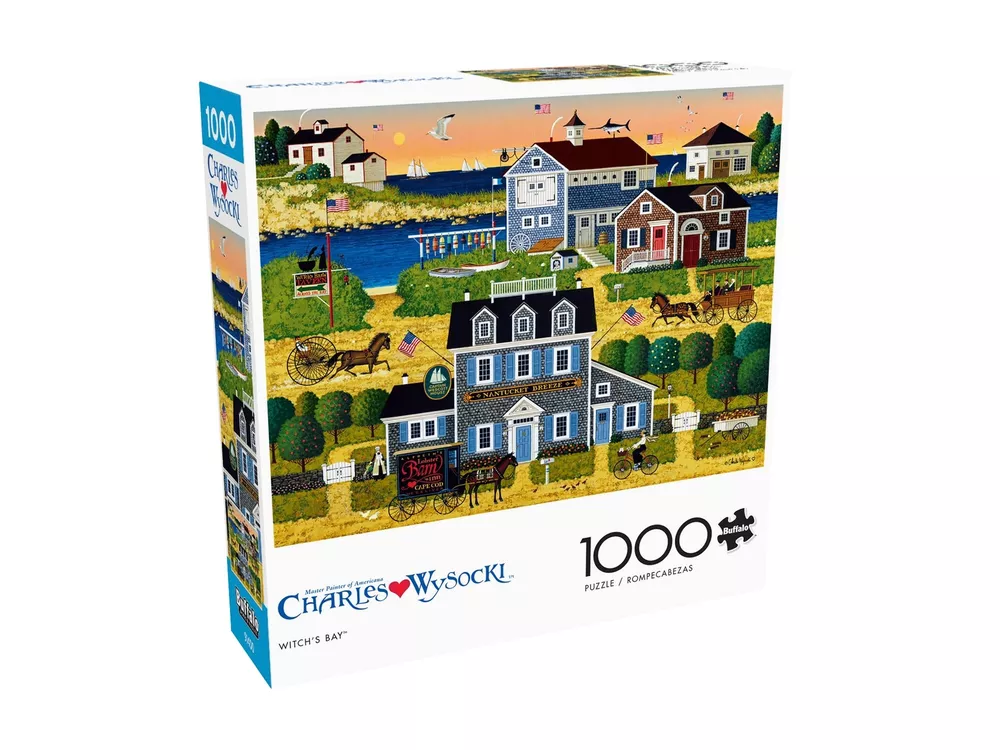 This 1000-piece jigsaw puzzle titled “Witch’s Bay” is based on the artwork of Charles Wysocki. The detailed coastal landscape in this scene boasts a grand "Nantucket Breeze" house, acting as a focal point amidst quaint homes, and rustic carriages traveling along the roads. In the distance, sailboats drift lazily in the bay, while seagulls soar in the golden sky. For more than 40 years Charles Wysocki enjoyed his love affair with life and Americana, and through his imaginative and colorful artwork, touched the hearts of millions worldwide. "Chuck" felt a special kinship with puzzlers who share in the creative process by building his paintings piece at a time. Every jigsaw puzzle is manufactured from recycled puzzle board. A precision cutting technique guarantees that every piece will fit soundly with the company's signature Perfect Snap™. A bonus puzzle poster is also included so that you have a handy reference of what the completed puzzle should look like while you put yours together. 1000 PIECE JIGSAW PUZZLE – This 1000-piece jigsaw puzzle is the perfect level of challenge. Measuring 7.94in. x 7.94in., this puzzle is a great single evening activity for the entire family, friend group or yourself. For adults ages 14 and up. HIGHEST QUALITY MATERIALS – The puzzle pieces are thick and sturdy. Our puzzles are cut with premium dies for laser precision. APEX PUZZLE IMAGERY - Relax and enjoy the puzzling process while “traveling” to some of the most beautiful, bucket-list places, Or join in the fun with our portfolio of licensees, or finish in style with world renown artists. FULL COLOR BONUS POSTER - Every puzzle includes a full color poster to reference while assembling your puzzle. Or, for a real challenge, try to solve without the poster in hand! PERFECT GIFT - Puzzles are not only great gifts for any and all occasions including birthdays, holidays, housewarming parties or even just a fun night in with friends.