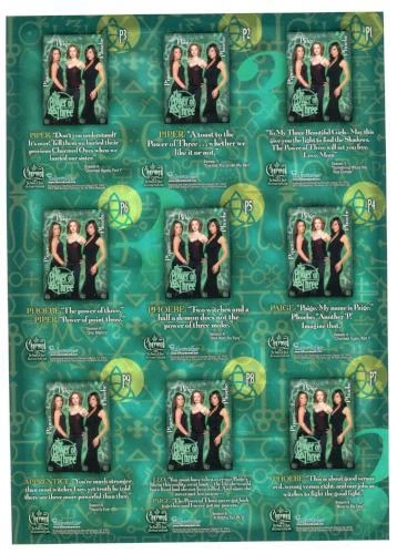 Description: Charmed The Power of Three Uncut Mini Press Sheet Contents: Limited Edition uncut mini press sheet featuring the foil "The Power of Three" Puzzle Chase Cards, P1 through P9 #113 of 500. Manufacturer: Inkworks, 2003. Condition: Mint/Near Mint. Opened cardboard envelope. Comes in protective covering sleeve.