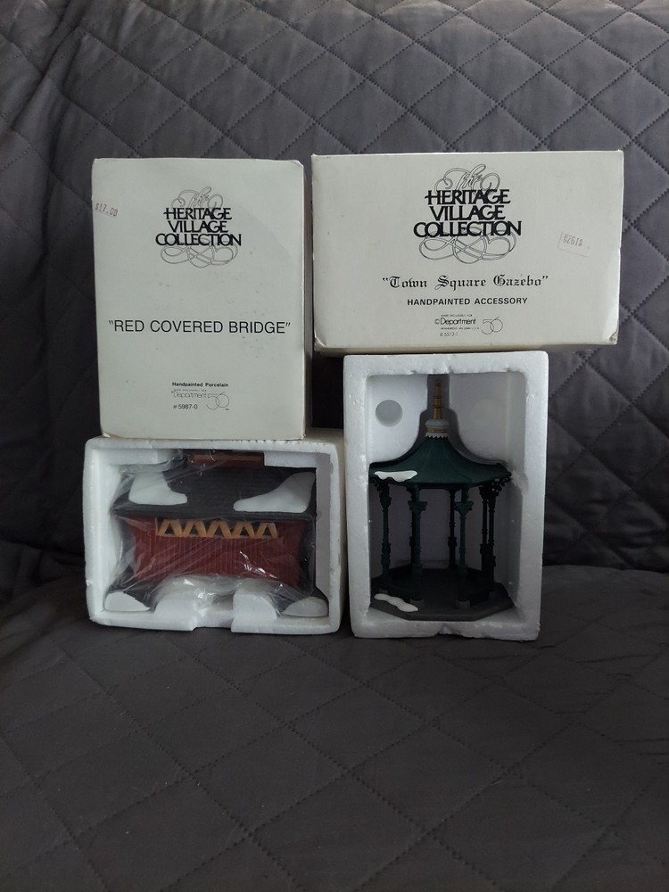 Charming Dept 56 Red Covered Bridge with Town Square Gazebo