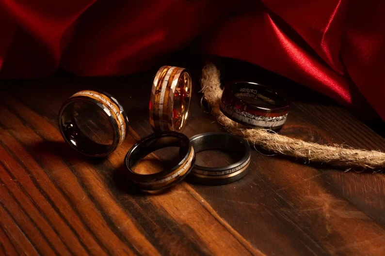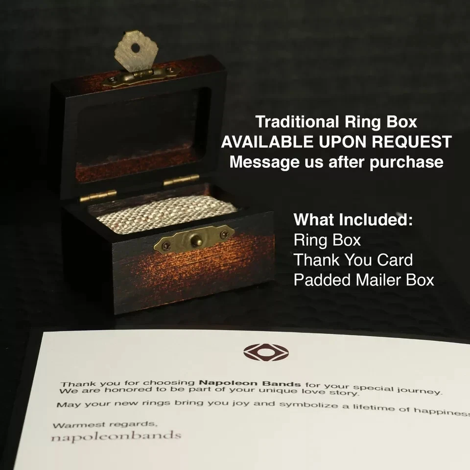 Deer Antler & Charred Whiskey Barrel Wood Ring, Rose Gold Tungsten, 8mm Comfort Fit Celebrate nature and craftsmanship with this striking wedding band, blending rugged charm and refined elegance. The hammered rose gold tungsten shell frames a unique inlay of naturally shed deer antler and charred whiskey barrel wood, creating a ring as distinctive as your love story. Handcrafted for durability and comfort, each ring is one of a kind — a perfect symbol of lasting commitment. To complete the experience, each Napoleonbands ring is elegantly presented in a premium, artisan-crafted wooden box , complete with personalized laser engraving : https://www.ebay.com/itm/405600082986 For those seeking an elevated presentation, you can upgrade upon request to our luxurious, handcrafted koa wooden ring box — a true statement of craftsmanship and distinction: https://www.ebay.com/itm/405948705902 Product Details: Material: Genuine Tungsten Carbide Inlay: Deer Antler & Charred Whiskey Barrel Wood Finish: Hammered Texture Color: Rose Gold Tungsten Fit: Comfort Fit Band Width: 8mm Sizing: True to Size Shipping: We offer free shipping within the U.S. Returns: If your ring is not engraved, you’re welcome to return or exchange it—just reach out to us. If your ring is engraved, we’re unable to accept returns. However, if there’s an error on our part with the engraving, we’ll make it right. Why Choose This Ring: Naturally Unique: The use of genuine antler and wood means no two rings are alike — each piece tells its own story. Built to Endure: Crafted from ultra-durable tungsten carbide, this band is scratch-resistant and perfect for everyday wear. Comfortable All-Day Wear: The comfort-fit design ensures a smooth, easy feel, whether you’re at work or celebrating a special occasion. Hypoallergenic & Skin-Safe: Ideal for sensitive skin, so you can wear it worry-free. Premium Presentation: Every ring comes in a handcrafted antiqued rosewood box, ready for gifting. Embrace the wild. Shop now and wear a piece of nature’s beauty every day.