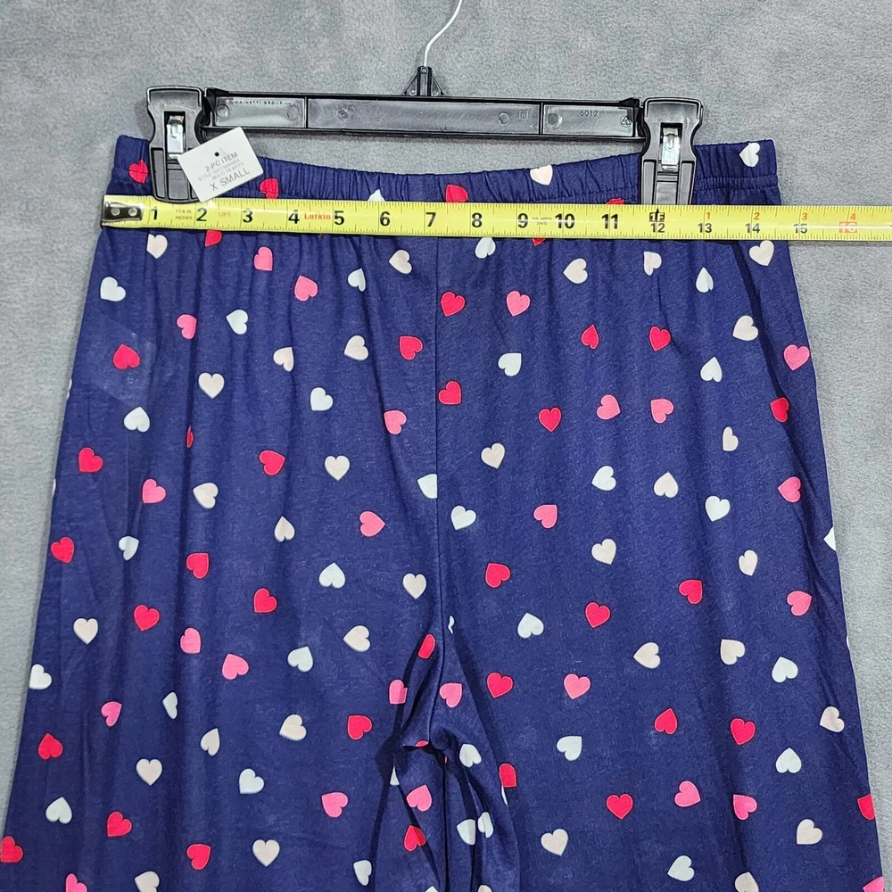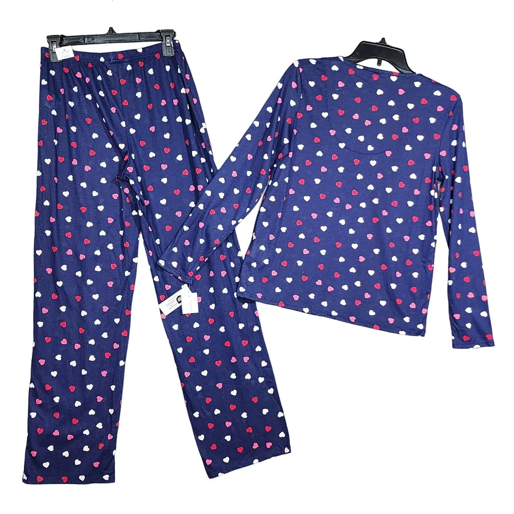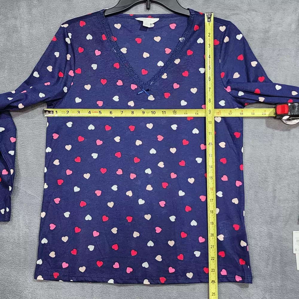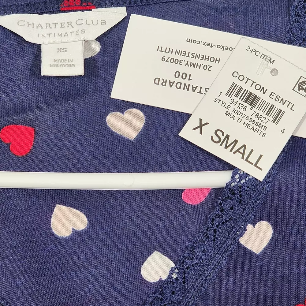 Charter Club Cotton Long Sleeve Lace Trim Pajamas Set XS Navy Blue Multi Hearts V-neck pullover top with long sleeves and lace trim Pull on bottoms with elastic waist band stretchy light weight cotton New with tags. Paper hang tag may be torn or have tape or stickers attached/detached Inv# 09-095