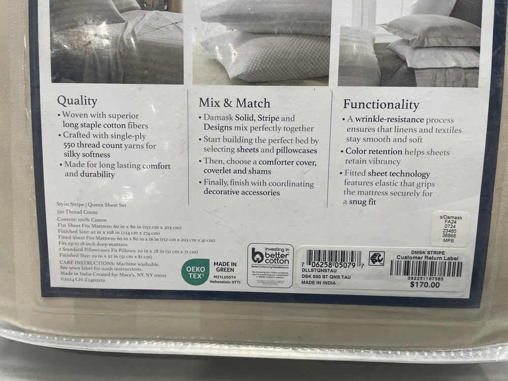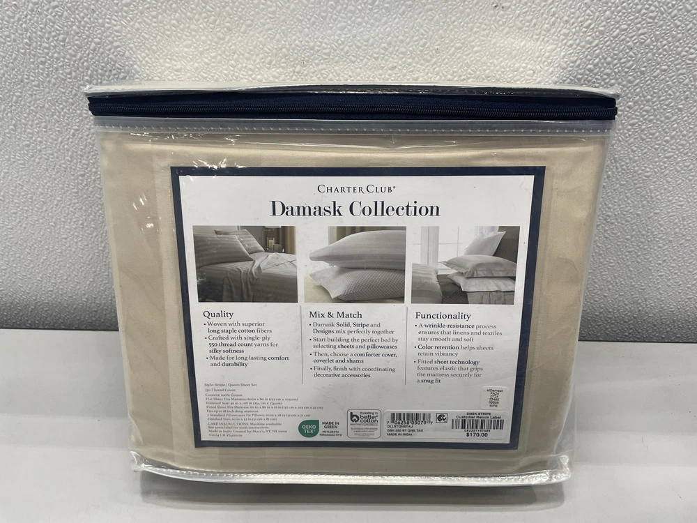 ebay template Charter Club Damask Collection Queen 4-Piece Sheet Set Taupe Stripe DLLSTQNSTAU Item Specifics: Model: DLLSTQNSTAU Size: Queen Color: Taupe Strips UPC: 706258050797 Condition: New Features: Cotton 4 pieces Fitted sheet Flat sheet 2 pillow cases 550 thread count Machine wash Cargo Largo is not sponsored by or affiliated with the brands associated with the products being sold. Packaging Condition: Original distressed packaging All dimensions are approximate Cargo Largo is not sponsored by or affiliated with the brand associated with the product being sold. Contact Seller If you have any questions, please use the “Contact Seller” link in the upper right section of the listing. Our business hours are 8:00 AM - 3:30 PM Monday-Friday (Central Time). Sales completed and emails received after normal business hours may be handled the next business day. Shipping Policy We ONLY ship within the lower 48 United States. We ONLY ship to the address selected by the customer at checkout. Buyers MAY NOT arrange their own shipping. ALL orders with total value of $250 or more WILL require a delivery signature. We DO offer a combined shipping discount on this item and other select items we sell. Each item must qualify for combined shipping and must be paid for on the same order. The discount is $1.00 off for each additional eligible item. You must request an invoice for combined shipping to have the discount applied. Location We offer local pickup for all our eBay auction items. To request local pickup for items you have won, please send us a message asking for “pick up” and we will send you an eBay invoice with your total. All local pickup orders MUST be paid within 4 DAYS after the listing ended per eBay policy. The payment total will include Missouri sales tax AND a $4 handling fee per item. Non-Missouri residents will need to pay IN PERSON (credit/debit cards only) within 4 days after the listing ended. Buy It Now items are NOT eligible for local pickup. Paid items must be picked up within 10 DAYS after the end of the listing. If not, your order will be cancelled and refunded. Social distancing policies WILL be enforced during pickups. Local Pickup Location 7460 Stadium Drive Kansas City, MO 64129 Pickup Hours SUNDAY MONDAY TUESDAY WEDNESDAY THURSDAY FRIDAY SATURDAY CLOSED 11am-6pm 7:30am-4pm CLOSED 7:30am-4pm 7:30am-6pm CLOSED Return Policy We are not an authorized dealer of this product and any warranty included with the product may not be honored by the manufacturer. If you believe that the item purchased from us does not match the item description, or if your item was damaged during transit, please contact us to discuss return and refund options. In order to initiate the refund process, buyer must contact us within 30 Days of receipt of item. All returns will require a return authorization. Please note that we will only pay return shipping if our listing does not accurately reflect the specifications or condition of the item received. If you wish to return an item for any other reason, we will accept a return on MOST items, provided that the item is returned to us in the same condition and within 30 Days. This applies to both the item and retail packaging. Buyer will be responsible for both original and return shipping charges Seller will initiate this transaction and refund the buyer once the item has been received AND agreed to the mutual cancellation. We DO NOT accept any returns on swimsuits, undergarments, stockings, lingerie, or any item marked AS IS for any reason other than a grievous error in the listing. Please bid accordingly on all items listed AS IS. Payments Cargo Largo requires payment within four (4) days. (Please note that this is real-time, beginning when the auction ends.) If payment has not been received by the fourth (4th) day after the auction ends, then Cargo Largo will relist the item. Each month additional states are enacting laws requiring the collection of SALES TAX on online sales by remote sellers. We will abide by all local, state and federal tax codes and buyer should check their state and locality for tax liability. Residents of Missouri and all buyers who pick their item(s) up locally are required to pay Missouri sales tax on all items. Sell Smarter with Kyozou. Inventory and Ecommerce Management