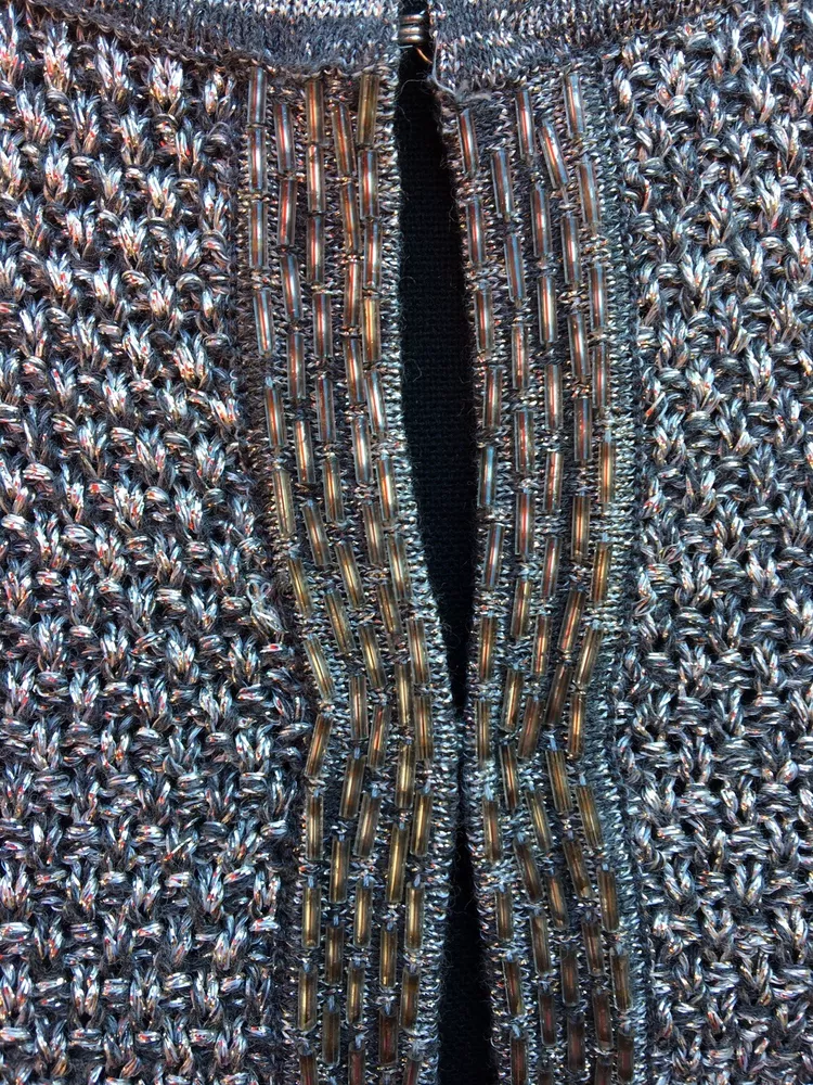 This Charter Club sweater is a stunning addition to any wardrobe, with its metallic silver and gray cotton fabric knit in a solid pattern. The long-sleeve cardigan has a round neckline and hook and eye closure accents. It's perfect for formal occasions, weddings, or cocktail parties, and the reflective material makes it a great choice for all seasons. The sweater fits regularly and is available in size P/P for petites. The brand is well-known for its quality and style, and this sweater is no exception. 51% cotton, 32% polyester and 11% metallic. 34” chest, 31” waist, 22” from shoulder to hem and 24.5” sleeves. Hook and eye closure.
