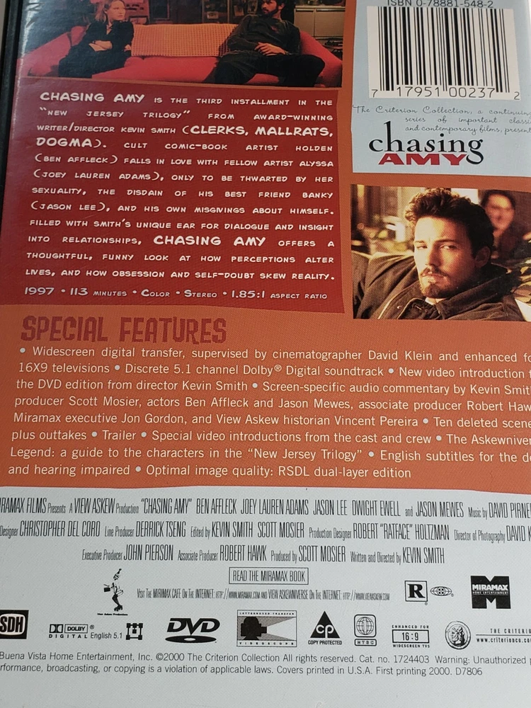 gtin13:Does not applyType:MovieRating:RActor:Ben Affleck, Jason Mewes, Dwight Ewell, Jason Lee, Joey Lauren AdamsDirector:Kevin SmithLanguage:EnglishRelease Year:1997Sub-Genre:ChaseUPC:Does not applyEdition:Widescreen EditionSeason:N/AFeatures:WidescreenStudio:Warner BrosCountry/Region of Manufacture:JerseyFormat:DVDGenre:Comedy, RomanceMovie/TV Title:Chasing Amy