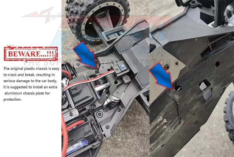Packaging Includes: Chassis plate-1pc Flat head screw 4x25-6pcs Flat head screw 4x30-2pcs Part Location: Below front, center, rear chassis Product major function & usage: Increase the firmness of the chassis, impact-resistant and wear-resistant, and strengthen the body structure The XRT chassis plate is made of aluminum 7075-T6, which is integrally formed by CNC with a thickness of 6.0mm, which improves the chassis rigidity and wear resistance, and strengthens the original chassis. Suitable Model: TRAXXAS-1/6 4WD XRT 8S-78086-4