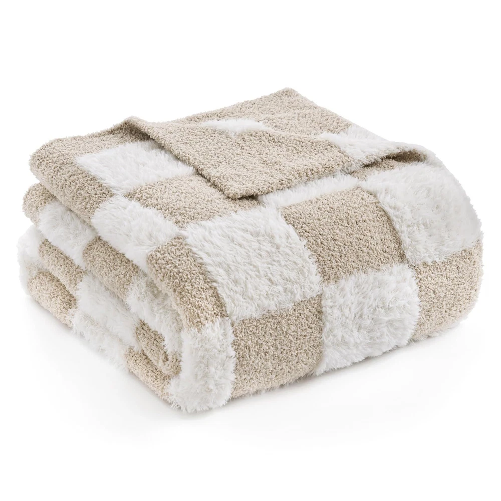 Luxurious Material Blanket- This throw blanket is crafted from a unique blend of rabbit faux fur and feather yarn, offering the luxurious feel of rabbit fur combined with the soft, cozy, and fluffy texture of feather yarn. Elevate your home decor with this elegant and comfortable addition. High-low Checkerboard Blankets- Featuring a timeless checkerboard pattern, different from other normal checkered blankets, this throw blanket combines faux fur and microfiber yarn, thus delivering a unqie high low effect texture value. It's not just a blanket, but a stylish piece that enhances your living space. Lightweight and Fluffy Comfort- Enjoy the perfect balance of lightweight warmth and plush comfort with throw blankets. Ideal for all seasons, this throw blanket provides a cozy touch whether you're relaxing in an air-conditioned room in summer or staying warm and snug in a chilly winter night. Gift Choice with Quality Quaranteed- Our throw blanket is OEKO-TEX STANDARD certified, ensuring that it is safe for humans and pets, free from harmful substances.Each blanket comes beautifully wrapped in a silk ribbon, making it an excellent gift choice for various occasions such as Halloween, birthdays, Christmas, and more. Share the luxury and comfort with your loved ones. Machine Washable- Designed for convenience, this throw blanket is machine washable, ensuring easy maintenance. The Blanket will stay its softness and fluffiness after times of washing.