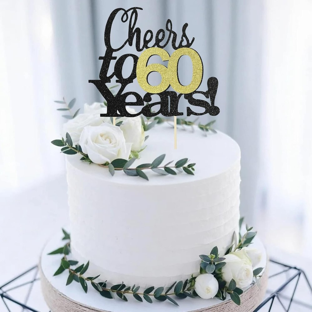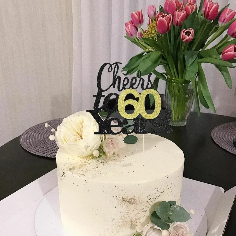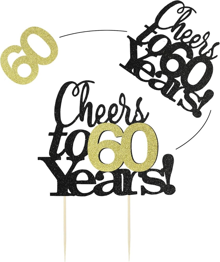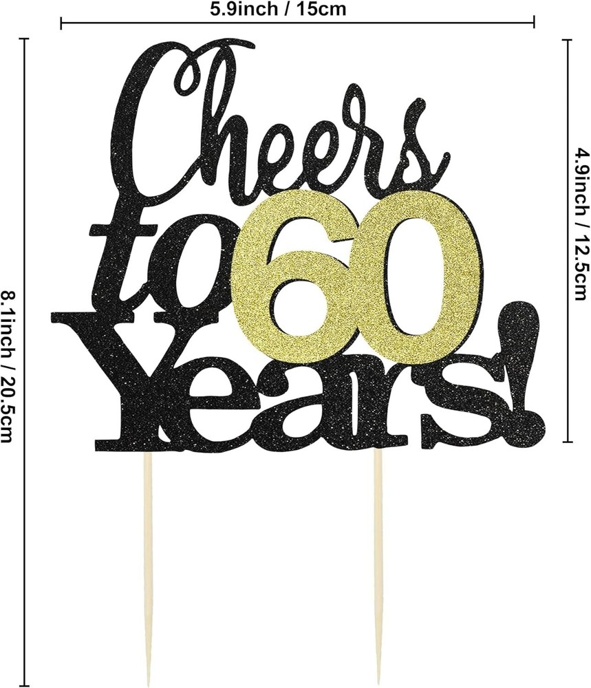 Cheers to 60 s Cake Toppers 60th Birthday Cake Topper Wedding Anniversary Party Decorations Supplies - 1 Pack 【Package】: You will receive 60th birthday cake topper! 【Package】: You will receive 60th birthday cake topper! 【Design】: Made of glitter cardboard and sticks, with glitter on the front and pure white on the back, the gold dust won't fall off. It consists of the words "Cheers to 60 s" and a big heart. 【Suitable for】 inches x inches (including stick). Perfect for cakes (6"-10"). Friendly reminder: DO NOT put in the oven, only for decoration purposes. No DIY required. 【Customer Satisfaction】: We are always striving to improve our products, if you have any problems, you can tell us, we will change it in time! In the same way, we will be stricter with the quality and design of our products to satisfy consumers!