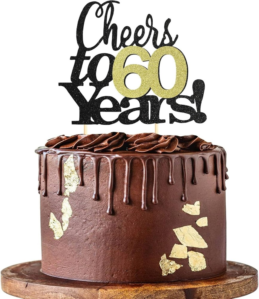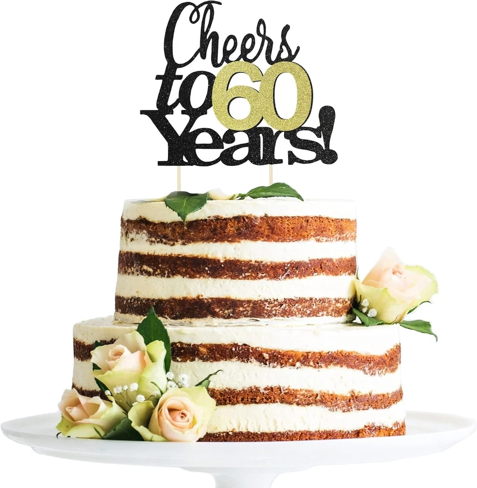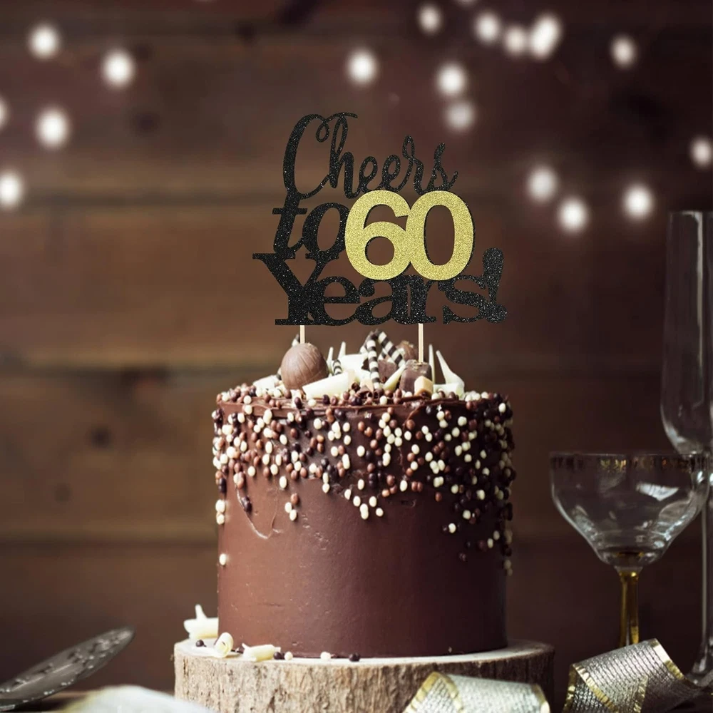 Cheers to 60 s Cake Toppers 60th Birthday Cake Topper Wedding Anniversary Party Decorations Supplies - 1 Pack 【Package】: You will receive 60th birthday cake topper! 【Package】: You will receive 60th birthday cake topper! 【Design】: Made of glitter cardboard and sticks, with glitter on the front and pure white on the back, the gold dust won't fall off. It consists of the words "Cheers to 60 s" and a big heart. 【Suitable for】 inches x inches (including stick). Perfect for cakes (6"-10"). Friendly reminder: DO NOT put in the oven, only for decoration purposes. No DIY required. 【Customer Satisfaction】: We are always striving to improve our products, if you have any problems, you can tell us, we will change it in time! In the same way, we will be stricter with the quality and design of our products to satisfy consumers!
