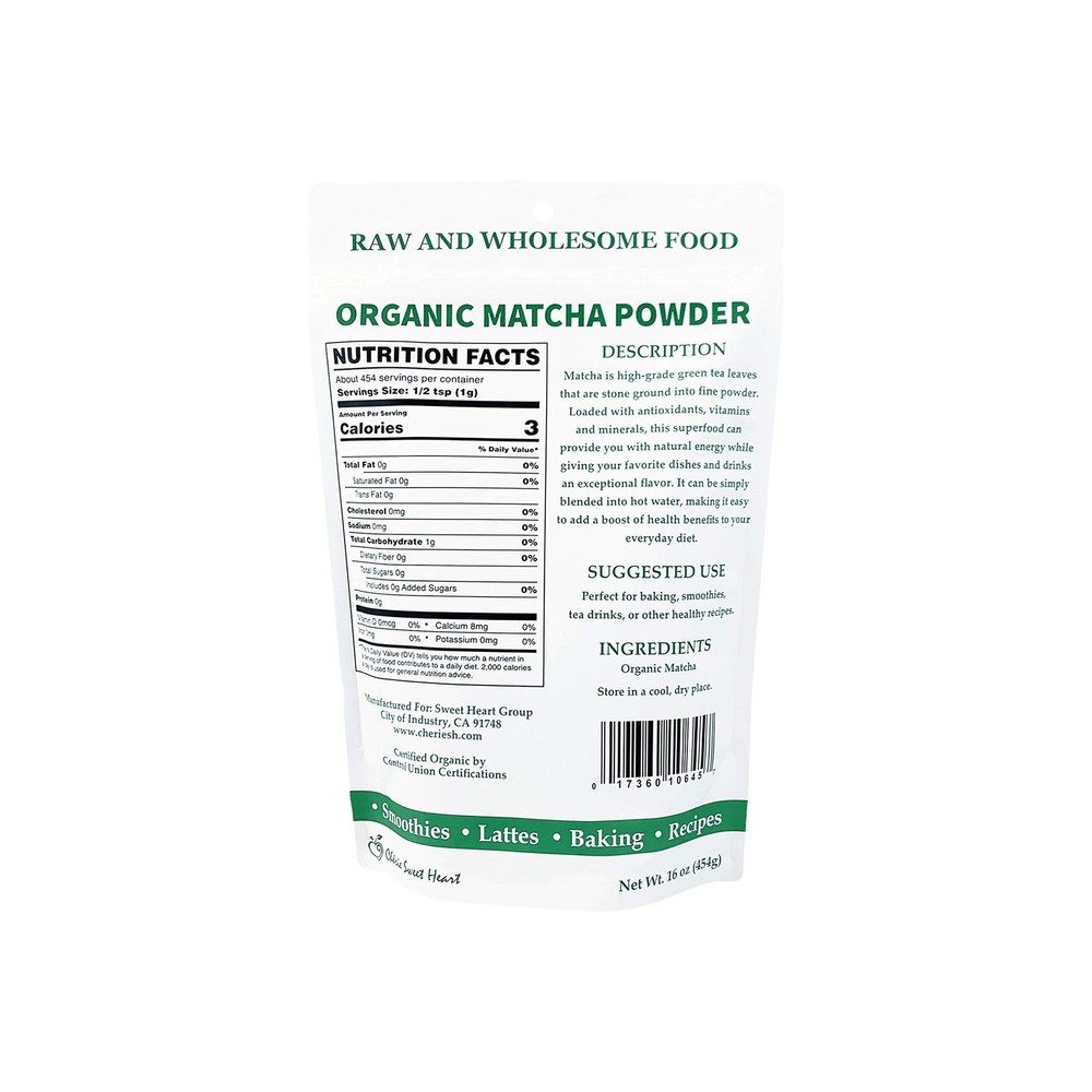 Cherie Sweet Heart Organic Matcha Green Tea Powder - Premium Culinary Grade, Authentic Japanese Origin, Antioxidant-Rich, Gluten-Free, Vegan – Perfect for Lattes, Cooking, Baking & Smoothies – 16oz Resealable Bag Product Details Number of Items: 1 Brand: Chérie Sweet Heart UPC: 850004867167 EAN: 0850004867167 MPN: Does not apply Brand: Chérie Sweet Heart Item Form: Powder Flavor: Matcha Tea Variety: Green Unit Count: 16.0 Ounce Package Dimensions : 10 x 6.89 x 1.65 inches; 1 Pounds UPC : Manufacturer : Chérie Sweet Heart Units : 16.0 Ounce Best Sellers Rank: #15,220 in Grocery & Gourmet Food (See Top 100 in Grocery & Gourmet Food) #101 in Matcha Tea #101 in Matcha Tea Customer Reviews: 4.2 4.2 out of 5 stars 1,858 ratings USDA Organic & Non-GMO Matcha High-quality, organic matcha green tea powder in a 16oz resealable pouch. No artificial flavors, colors, or additivesjust pure, natural matcha. Rich in Antioxidants & Nutrients Packed with antioxidants that support metabolism, heart health, and sustained energy for mental clarity and daily focus. Versatile for Lattes, Smoothies & Baking Perfect for matcha lattes, smoothies, baked goods, or even savory recipes. A nutrient-rich superfood to elevate your routine. Gluten-Free & Vegan Superfood Ideal for plant-based diets. This matcha is gluten-free, vegan, and sourced sustainably to support your health and the planet. Premium Matcha Taste & Quality Sourced from trusted producers, it delivers smooth texture and authentic flavor with superior quality in every scoop.