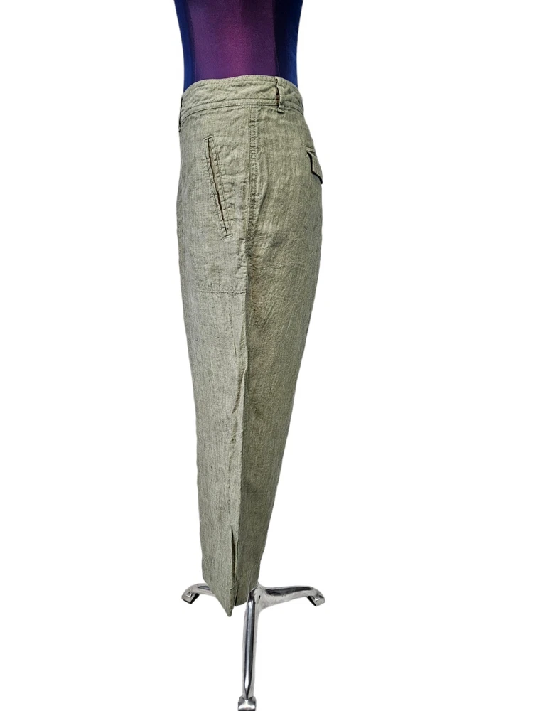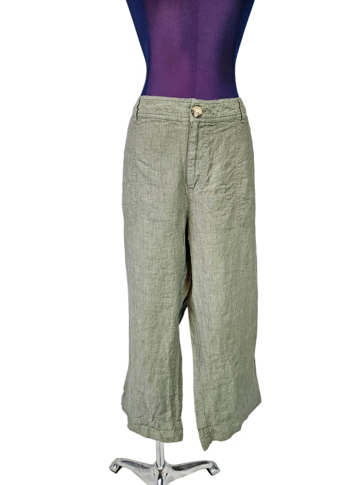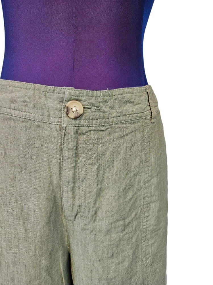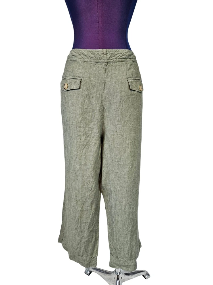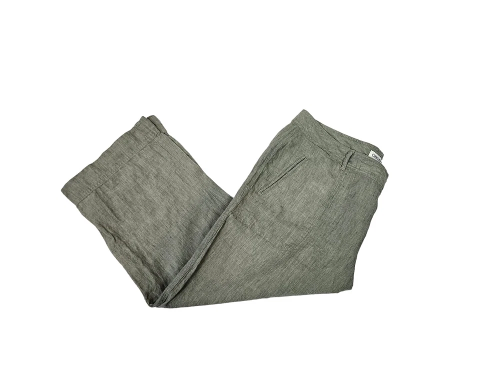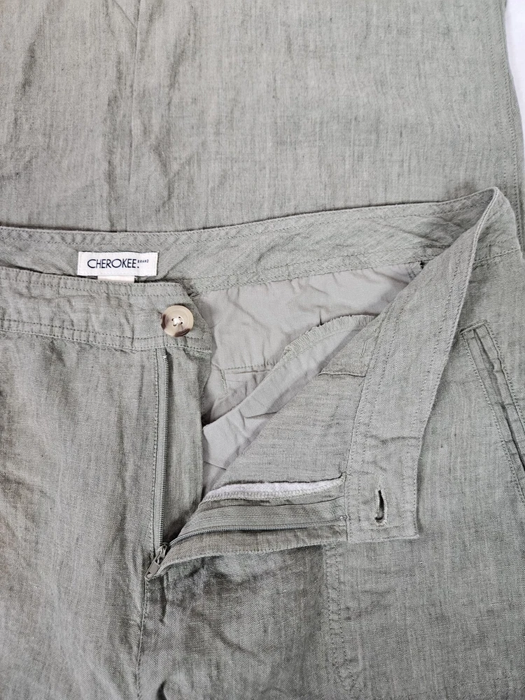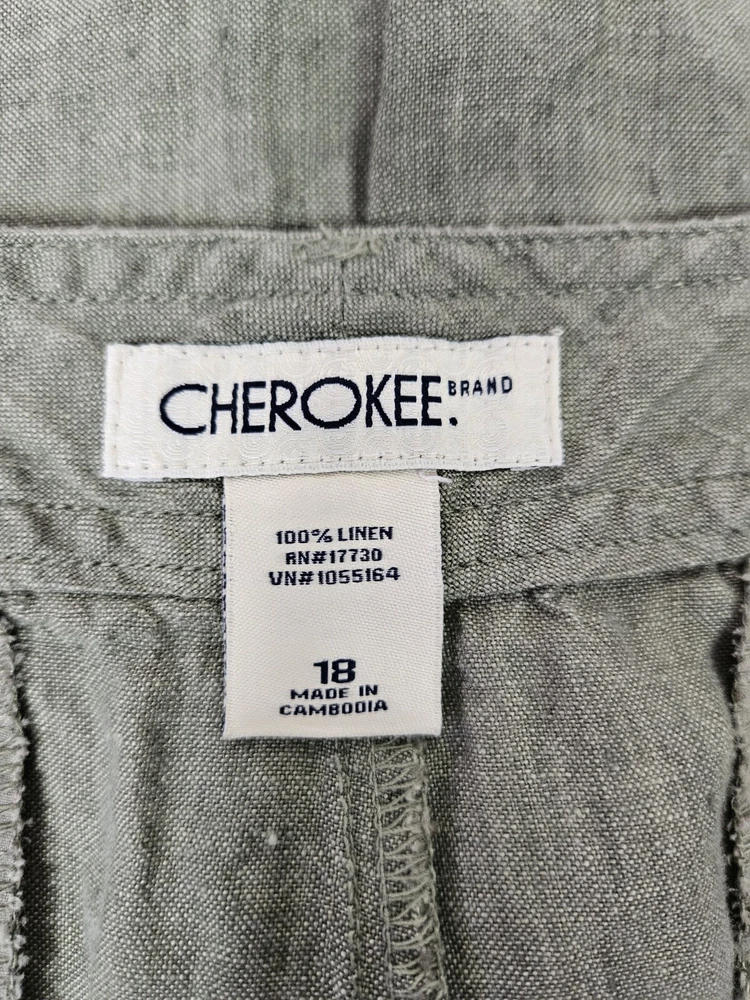 Cherokee Olive Green Linen Capri Pants Size 18 Women's Plus L15 In excellent condition Cherokee Olive Green Linen Capri Pants Size 18 Women's Plus. Features crisp olive green linen fabric, capri pants, single button with zipper closure, 2 front slip pockets, 2 back pockets with flap and button closure, straight leg, mid rise, belt loops, coastal preppy style. Measurements laying flat waist 18.5" front rise 11.5" hips 22.5" inseam 23" Fabric 100% linen This is a pre-owned item that may show signs of wear. In excellent condition, no flaws.