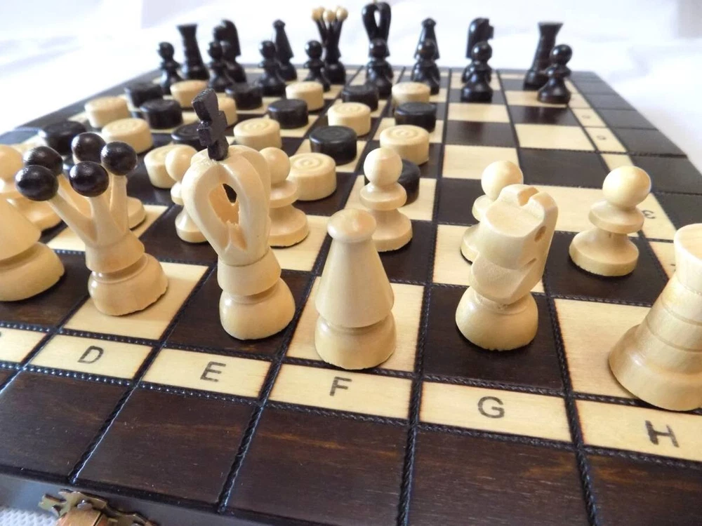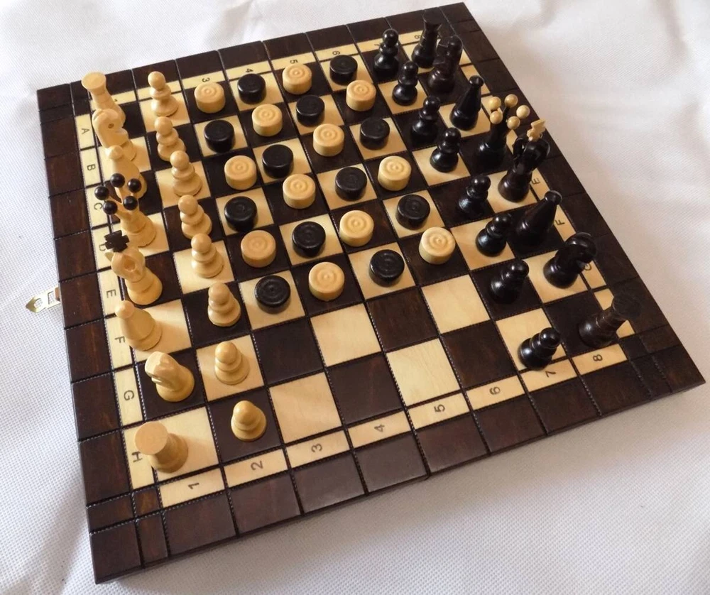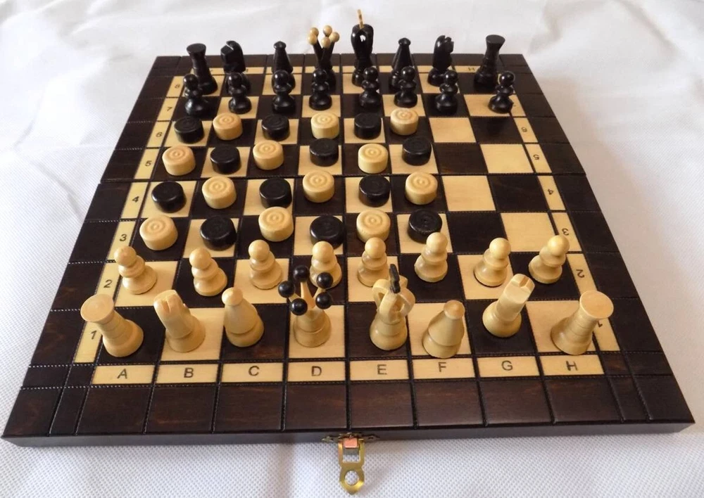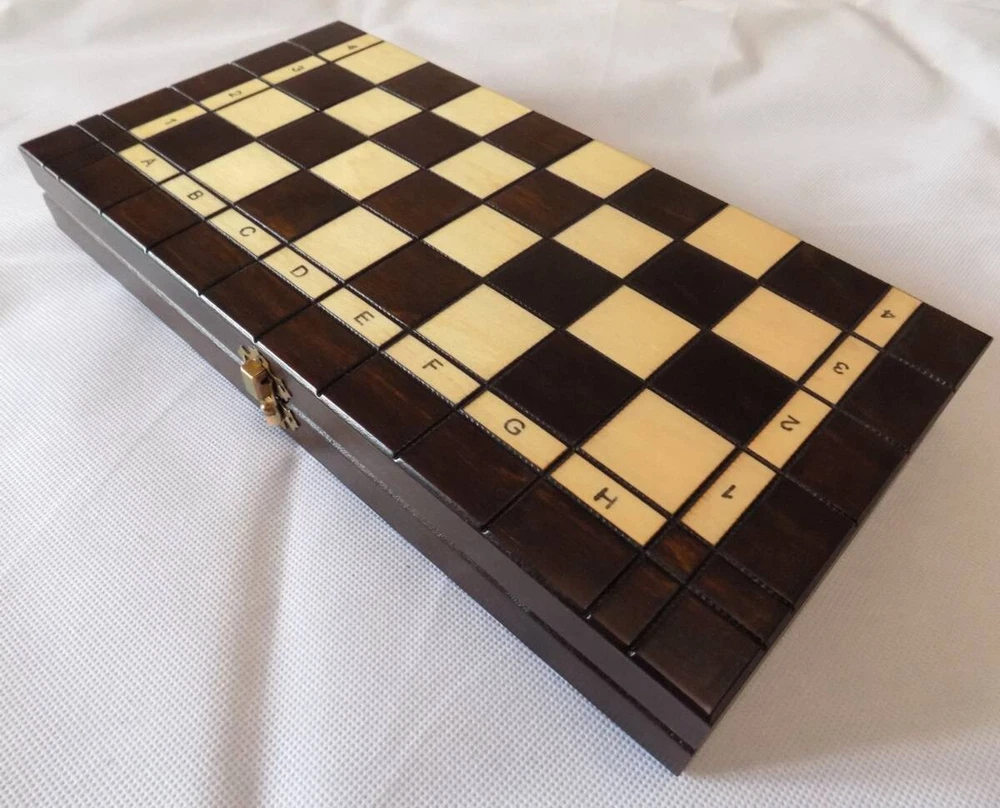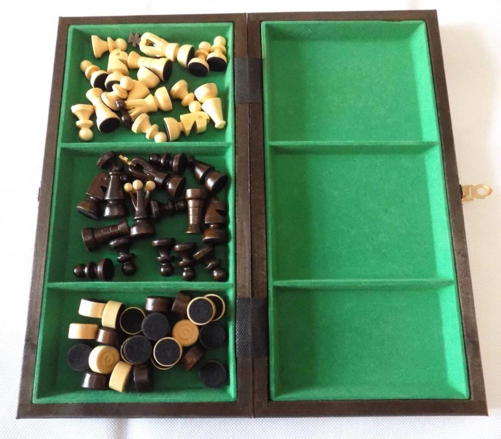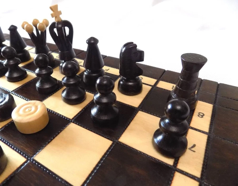 Top quality Chess and checkers game. Wooden board was made from natural wood and ecology clean materials. Game includes everything what you need for playing 2 games. All boards are hand carved and top quality. Board Size: 35 x 35 cm King size 7 cm Weight: 0.800 Kg Condition: New Material: Wood Made in Western Ukraine. Awesome wooden game.