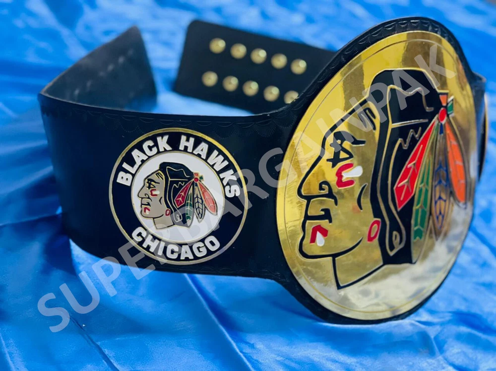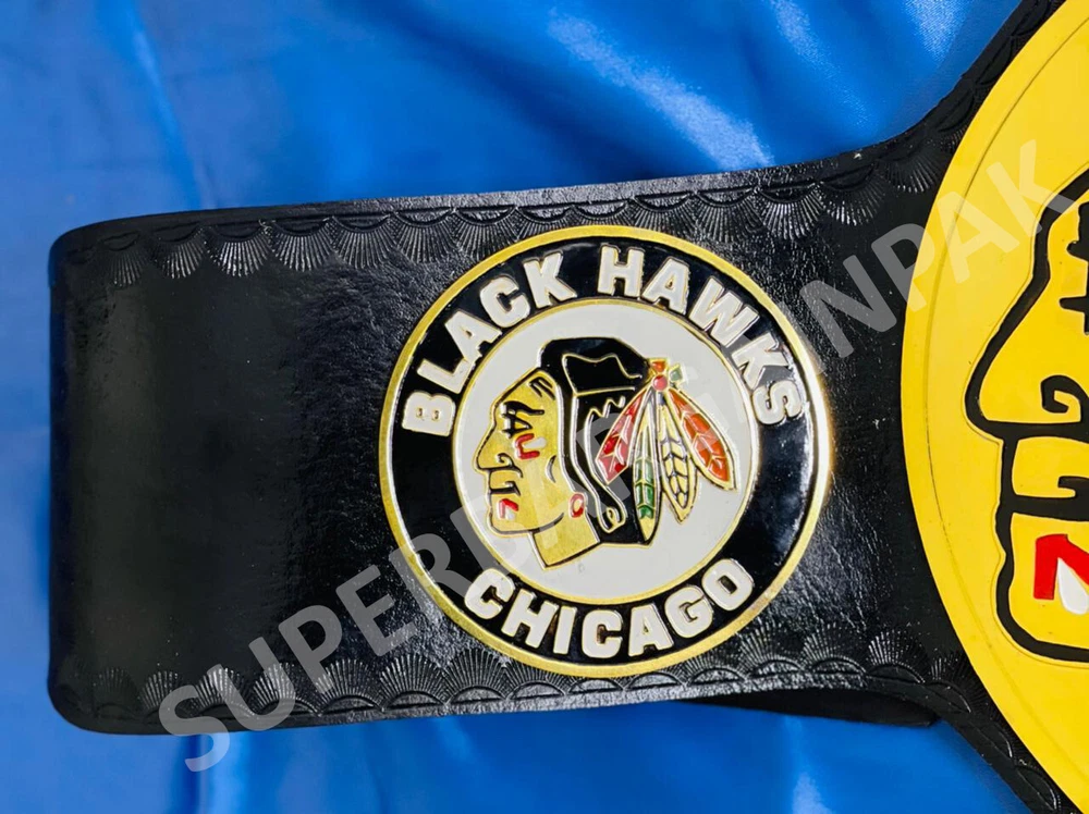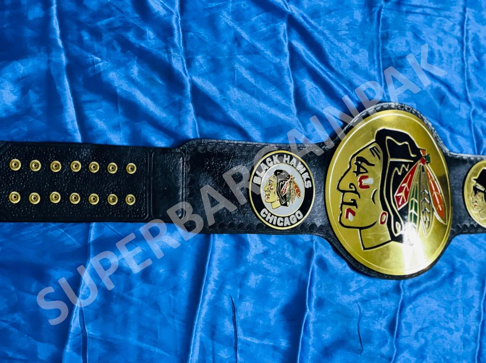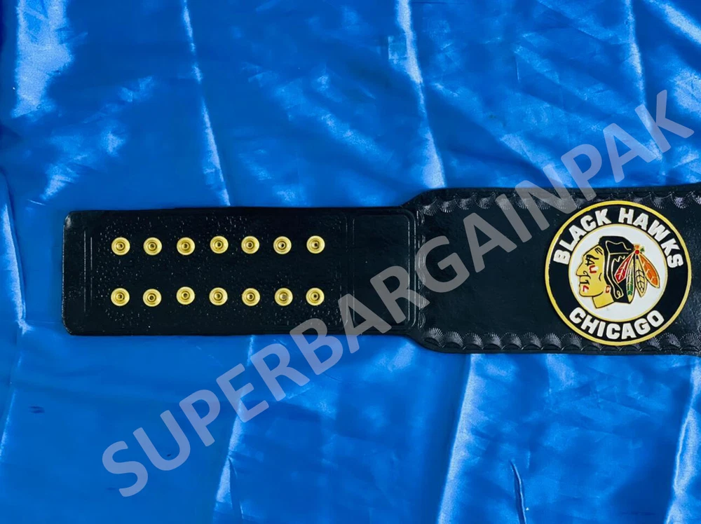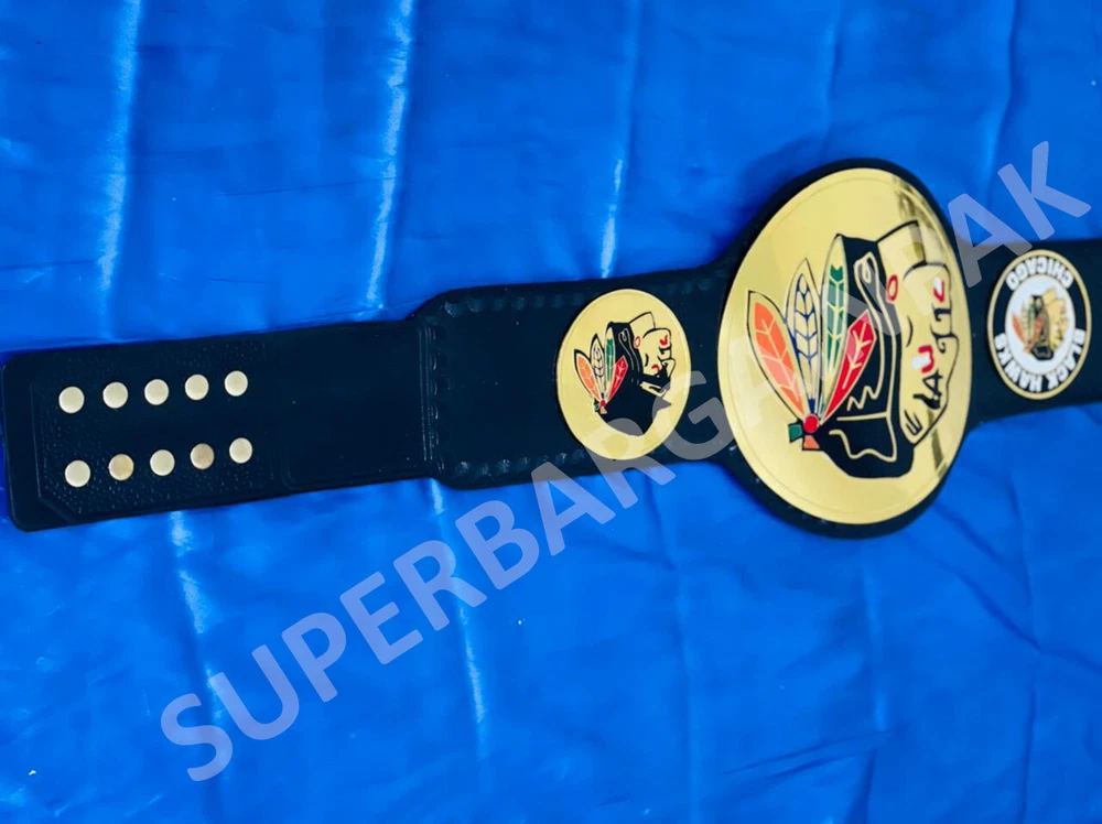 Welcome to our shop ------------------------------------------- We are specialist in manufacturing handmade products:: Our wide range of products include: >>>>Championship Belts WWE | WWF | AEW | UFC | WBC | WCW MINI SIZE ALSO AVAILAVLE FOR CHILD Product Description ** Black Hawk Chicago Ice Hockey Championship Belt Adult size *** Plate Metal: Brass (Zinc available on request with additional cost) Strap: 100% Leather Largest Waist Size: Fits upto 46'' Belt Length: ~50" Weight: 3.57 lbs | 1.61 Kg Plate Thickness: 2mm (4mm Version available on demand with additional cost) ::The belt is well crafted and manufactured to meet the quality demands of fans:: Get your hands on this marvelous piece now! Note: If you need further details kindly inbox us, we will try to be as responsive as possible. ------------------------------------------- Return Policy: Generally we don't have much complains on our products and we make sure to 100% satisfy our clients. We send the product in well Bubble Wrapped packaging so there is highly unlike chance of getting damaged item. In case there is a damage, we will try to give partial refund or you can ask for full refund within 30 days after returning the belt to origin. NOTE: 1. If you have placed the order by mistake or you have purchased a wrong item then we are not going to refund that. 2. Buyer will pay the shipping fee of returning the belt. ------------------------------------------- Happy Shopping! :)