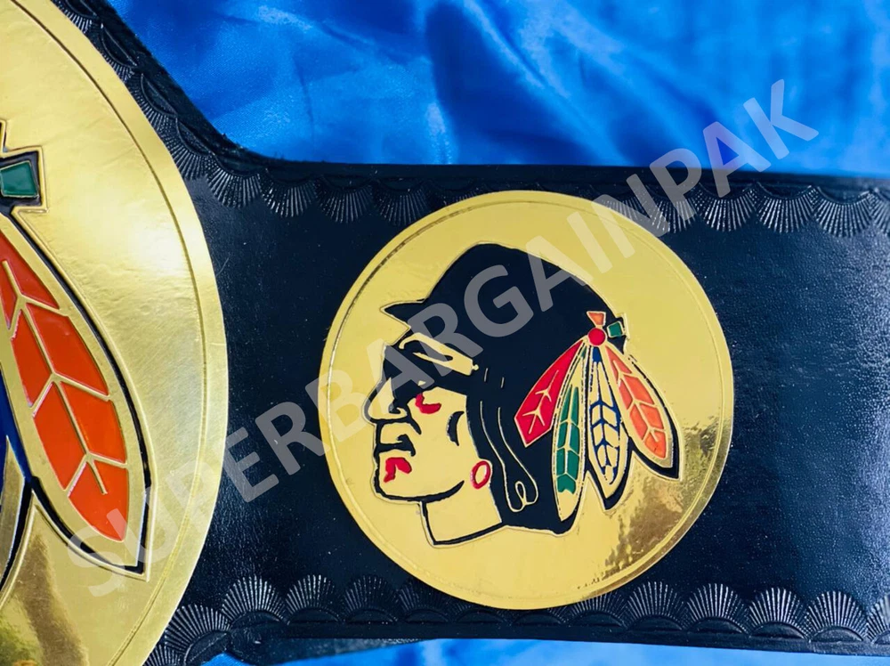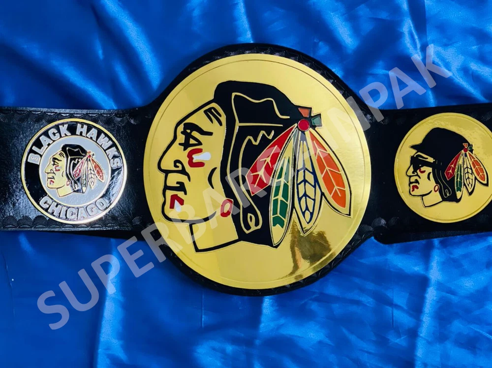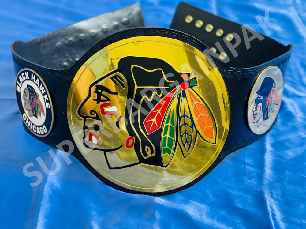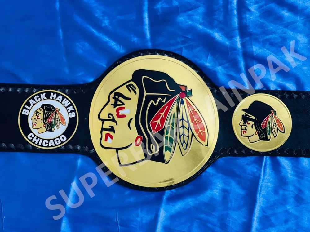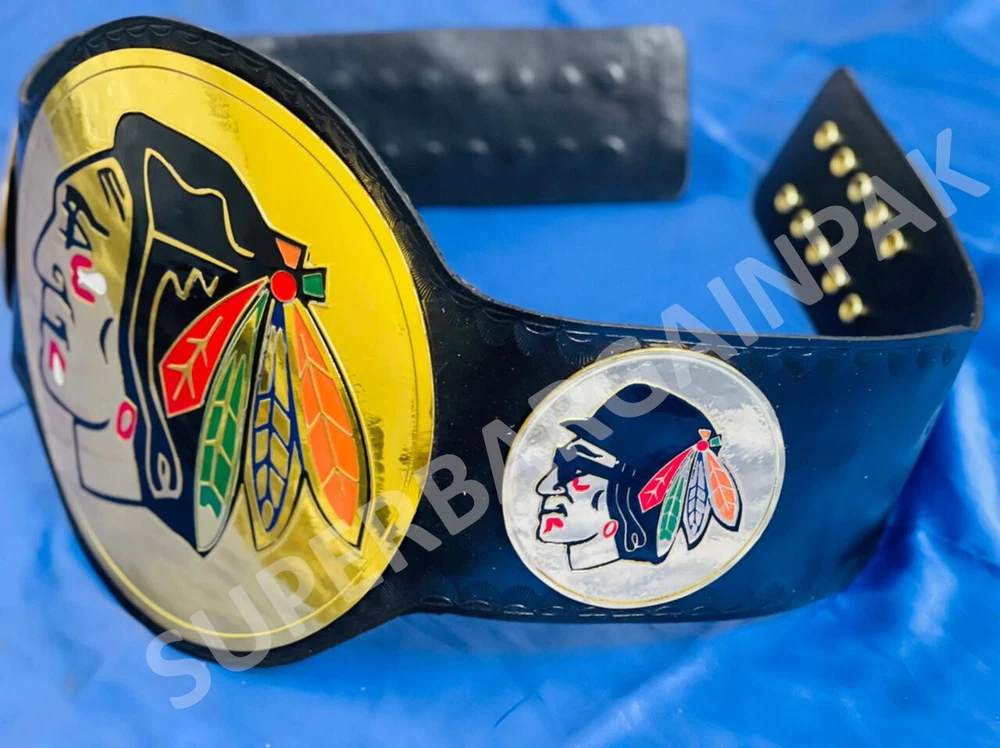 Welcome to our shop ------------------------------------------- We are specialist in manufacturing handmade products:: Our wide range of products include: >>>>Championship Belts WWE | WWF | AEW | UFC | WBC | WCW MINI SIZE ALSO AVAILAVLE FOR CHILD Product Description ** Black Hawk Chicago Ice Hockey Championship Belt Adult size *** Plate Metal: Brass (Zinc available on request with additional cost) Strap: 100% Leather Largest Waist Size: Fits upto 46'' Belt Length: ~50" Weight: 3.57 lbs | 1.61 Kg Plate Thickness: 2mm (4mm Version available on demand with additional cost) ::The belt is well crafted and manufactured to meet the quality demands of fans:: Get your hands on this marvelous piece now! Note: If you need further details kindly inbox us, we will try to be as responsive as possible. ------------------------------------------- Return Policy: Generally we don't have much complains on our products and we make sure to 100% satisfy our clients. We send the product in well Bubble Wrapped packaging so there is highly unlike chance of getting damaged item. In case there is a damage, we will try to give partial refund or you can ask for full refund within 30 days after returning the belt to origin. NOTE: 1. If you have placed the order by mistake or you have purchased a wrong item then we are not going to refund that. 2. Buyer will pay the shipping fee of returning the belt. ------------------------------------------- Happy Shopping! :)