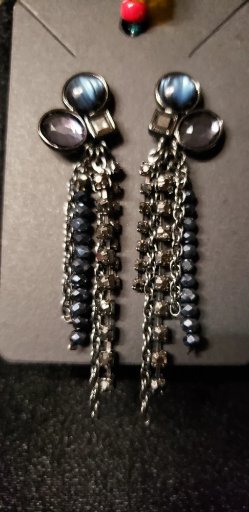 This Chico's Midnight Blue Sparkle Bib Necklace & Matching Earring Set features an asymmetrical bib adorned with faux sapphires in shades of navy blues complimented with hematite colored metal. The necklace is 12 inches long, a 3 inch extension chain, and a lobster closure. This high fashion jewelry set includes a coordinating 3 inch earrings, both signed by Chico's, making it a glamorous choice for occasions like Mother's Day, weddings, birthdays, and more. Perfect for those who appreciate statement pieces with a touch of sparkle and sophistication. Thank you for looking. Please take a look at my other great listings!