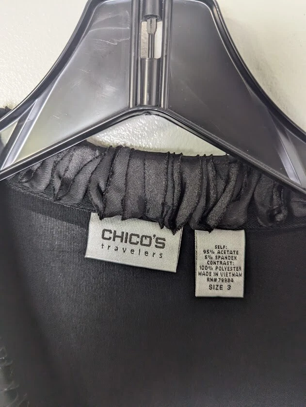 Chicos Traveler Cardigan Womens Black Slinky Knit Long Sleeve Sparkly Clasp sz 3 (Large) Holiday - Wedding - New Year's Measures approximately 24.5" armpit to armpit (see photo for all measurements) 95% Acetate 5% Spandex Good Condition