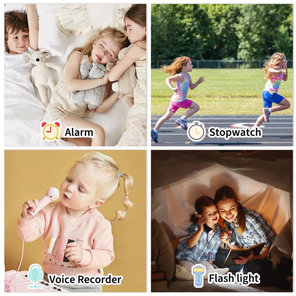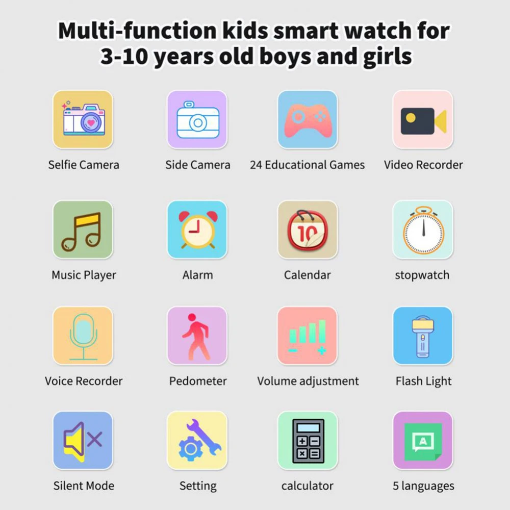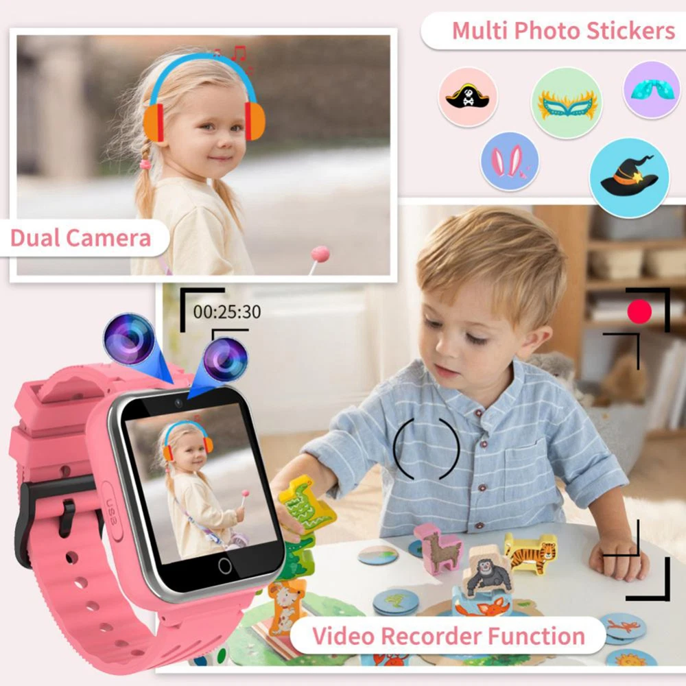 Feature: 1. It supports phone call, games, video recorder, pedometer, music playback, alarm clock, picture taking, stopwatch, calculator, calendar, flashlight, etc., suitable for boys and girls. 2. Lovely appearance, can be a decoration for dressing. 3. Large touching screen and luminous display, convenient to use in day and night. 4. Display the time and date, convenient to check the date and time. 5. There are 24 games which can effectively exercise kids' ability, logical thinking ability and hand eye coordination ability. MP3 music files can be downloaded from PC to the built in memory card. Children can listening to music anytime. Specification: Specifications: Color: pink Screen: 1.54 inch, 240*240p, touch screen Camera: 300,000 pixels Internal memory: 32MB Battery Capacity:: 400mAh Optional Language: English, French, German, Italian, Spanish Package size: 75 * 75 * 60mm Package weight: 100g Package List: 1 * Watch Note: Due to the different display screen and light effect, the actual color of the item might be slightly different from the color showed on the pictures.
