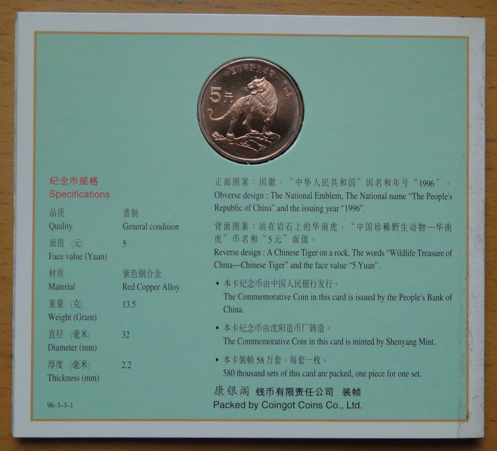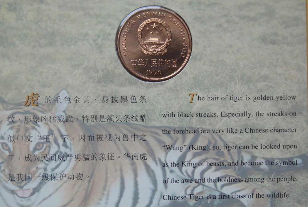 NOW YOU ARE BIDDING ON China Commemorative Coin WILDLIFE TREASURE OF CHINA - CHINESE TIGER Issued by 1996 The pictures are for reference only. All the pictures are taken ourselves, it may has a chromatic aberration by camera or display. We have more than one, we relist the same eBay listing and use the same/old pictures after we sold one item. So you may not receive the same item as in the pictures, however the item you’ll receive will be in the similar condition as in the pictures. We insure the safety of every item. We will ship all items via CHINA POST within 1 business day after the payment is received. We just ship the item to your shipping address on Online Payment. It will take about 15-25 days to arrive for USA and worldwide . We promise that the buyer doesn’t bear any risk on the way, if the package is damaged, lost or stolen on the delivery, we make the full refund or resend same items. We do not want to give you a bad buying experience even when the shipping is out of our control. Buyers who purchased bulk items or multi-items from my store within 3 days, and need to be arranged as combined shipping with charge discounted , p lease make a combined payment. do NOT send individual payments for each item, I will automatic offer a shipping discount. I accept Online Payment only. Import duties, taxes and charges are not included in the item price or shipping charges, these charges are the buyer’s responsibility. THANK YOU FOR VIEWING AND HAPPY BIDDING! GOD BLESS !!!