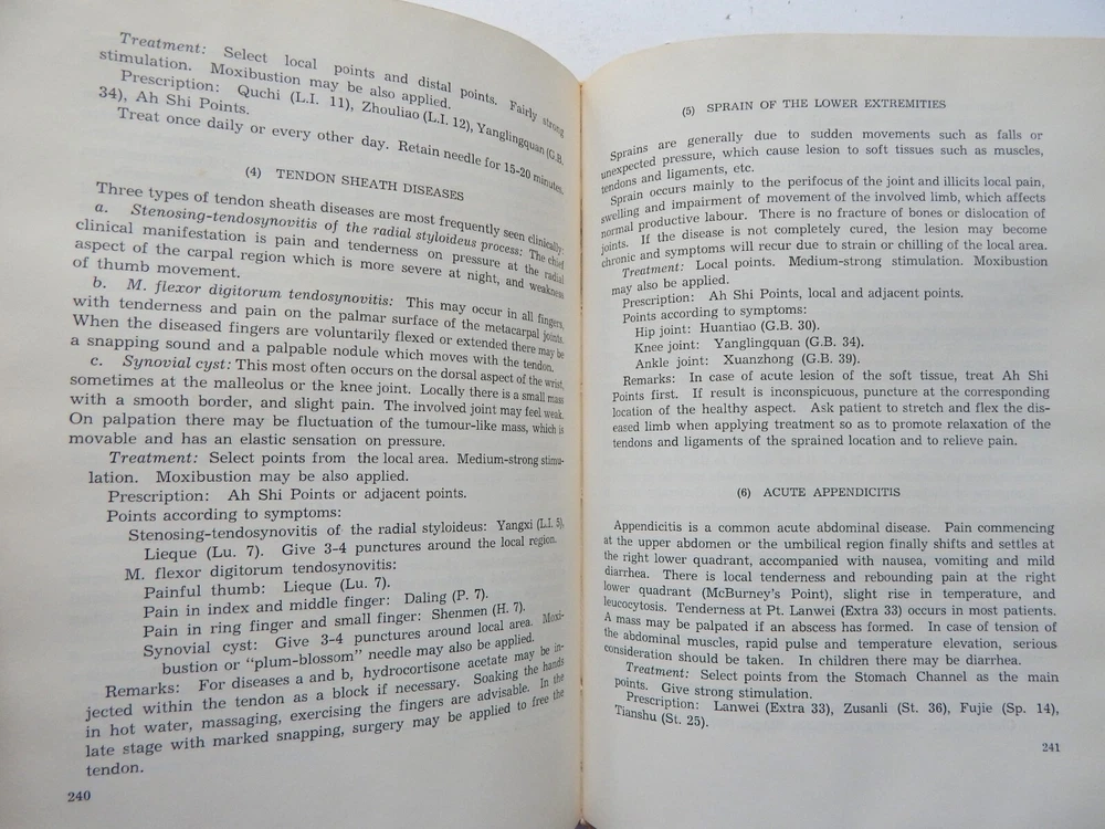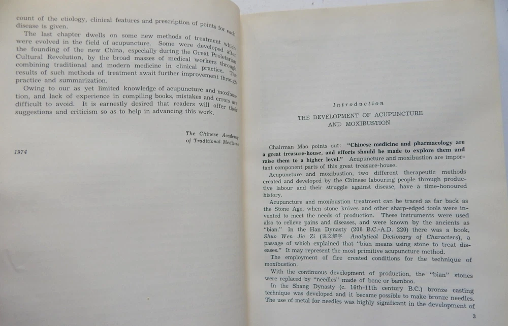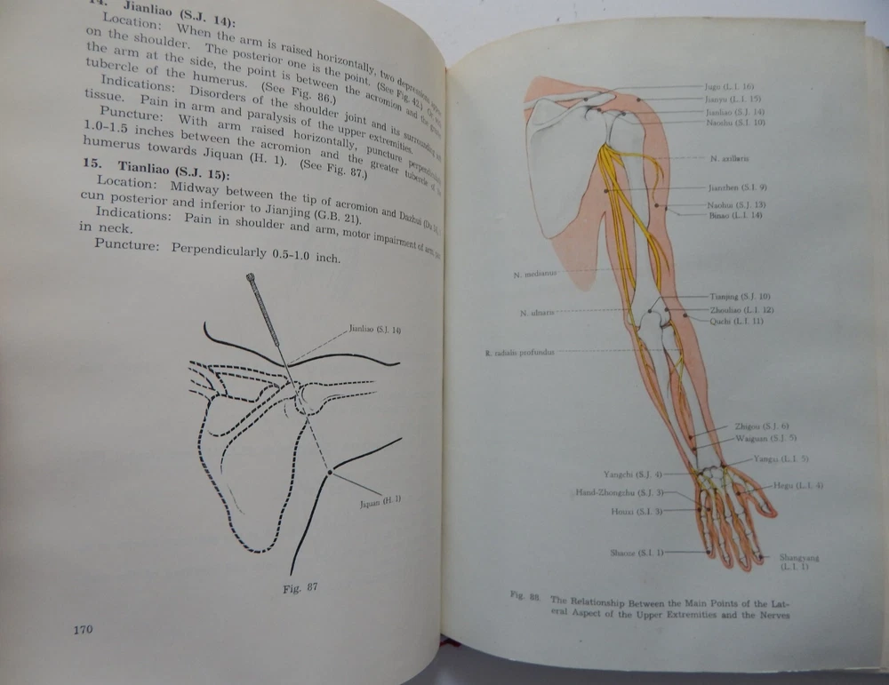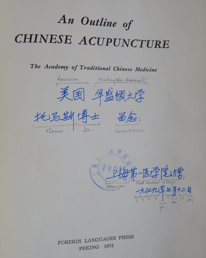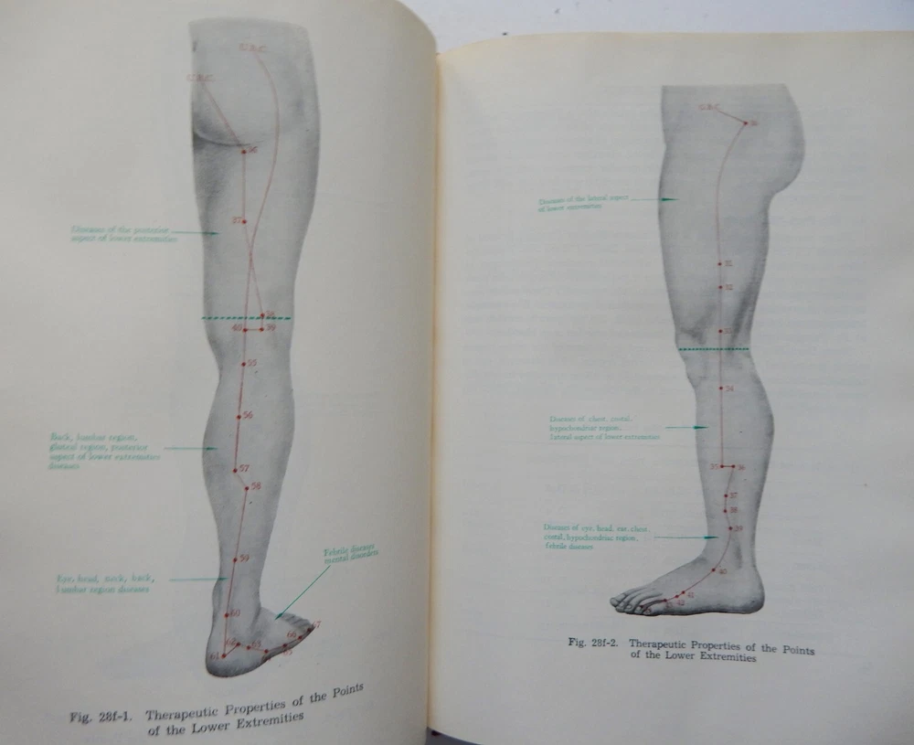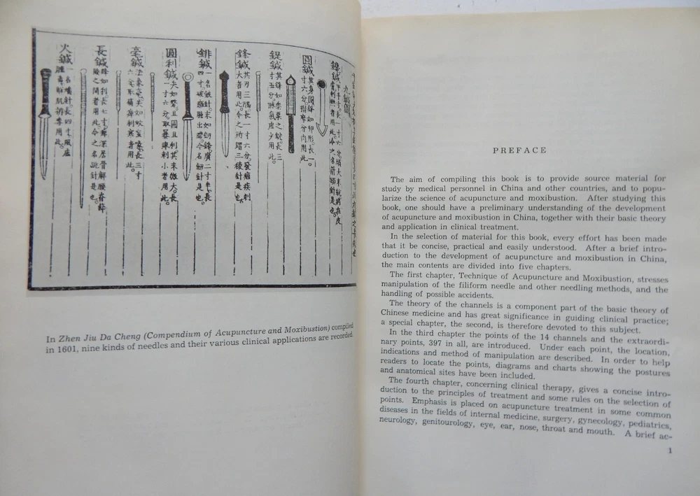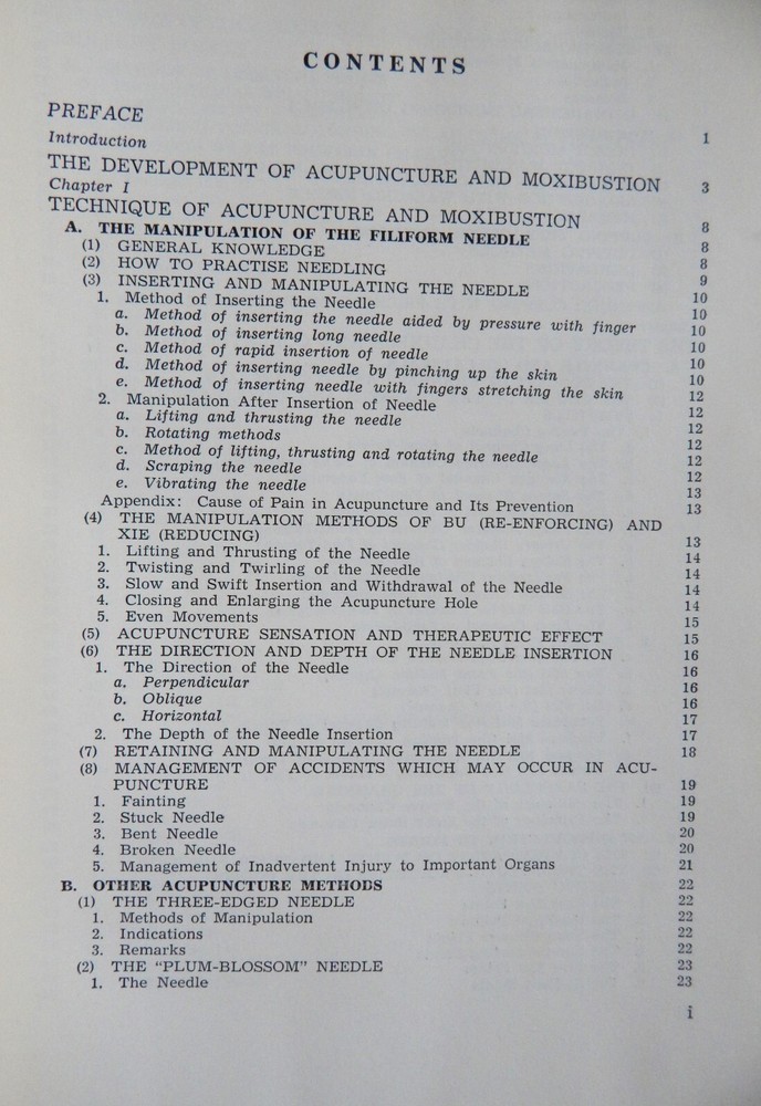 An Outline of Chinese Acupuncture. 1975. English language. Published in the Peoples Republic of China. Included errata sheet attached to the inside of the front cover. Includes a sample acupuncture needle. Ribbon place marker. Many drawings and illustrations. Lists of points throughout the body. See photos.
