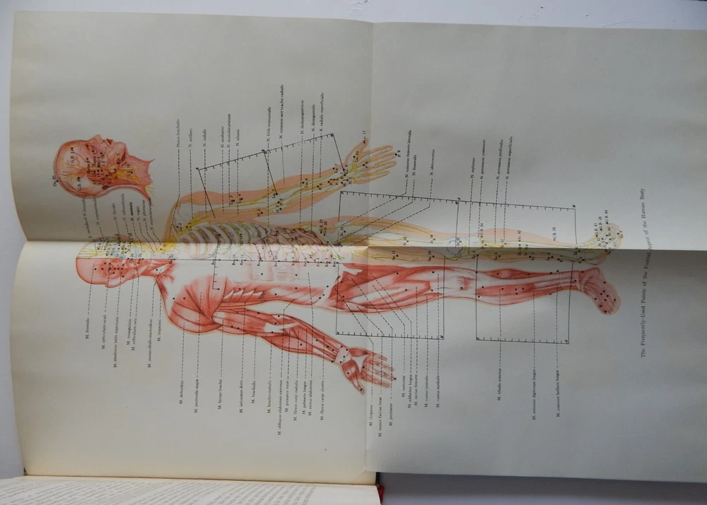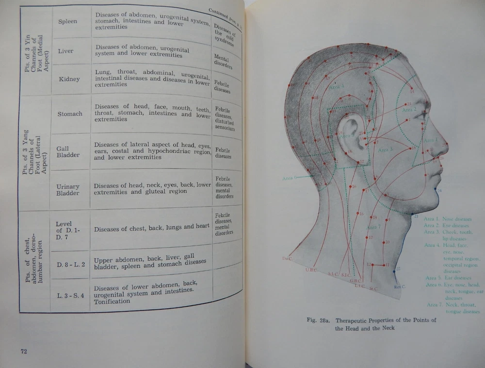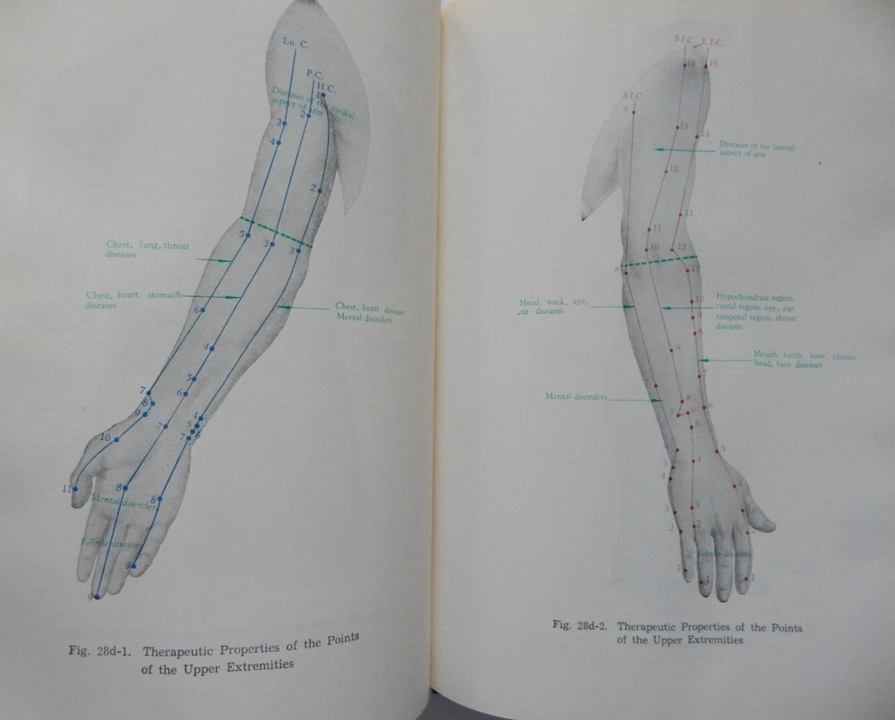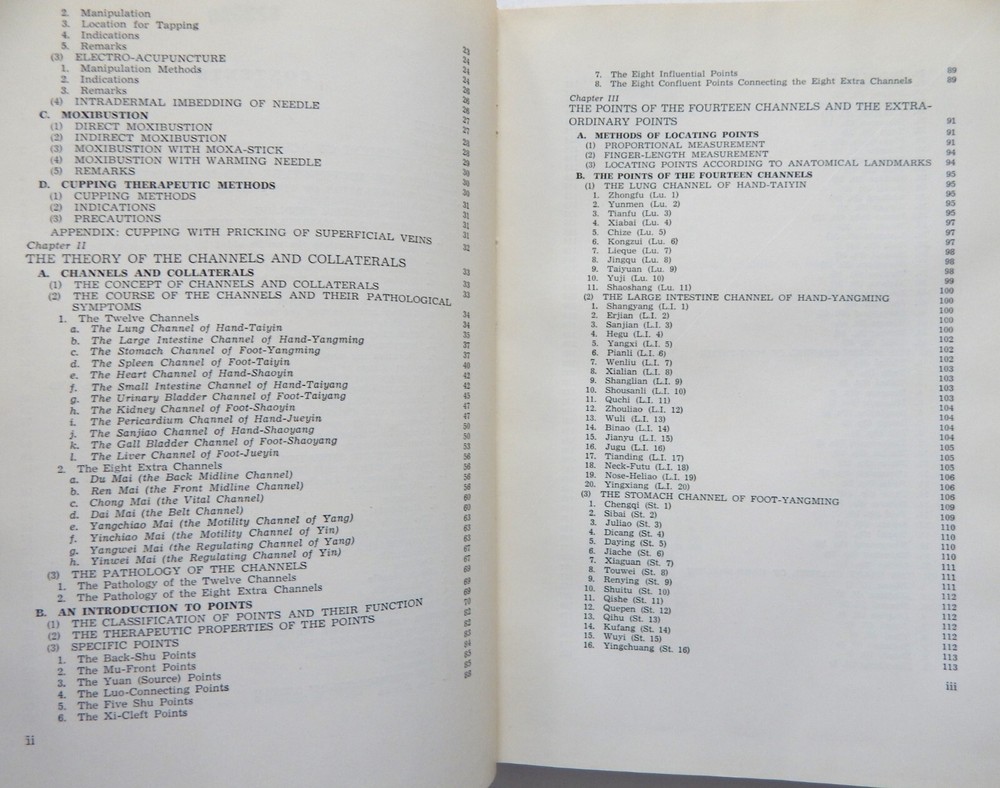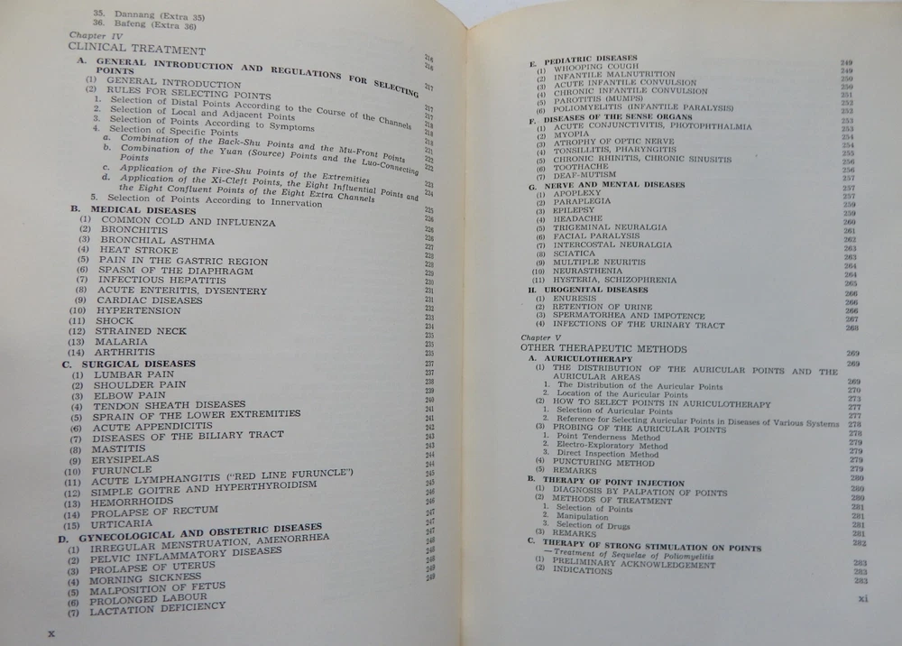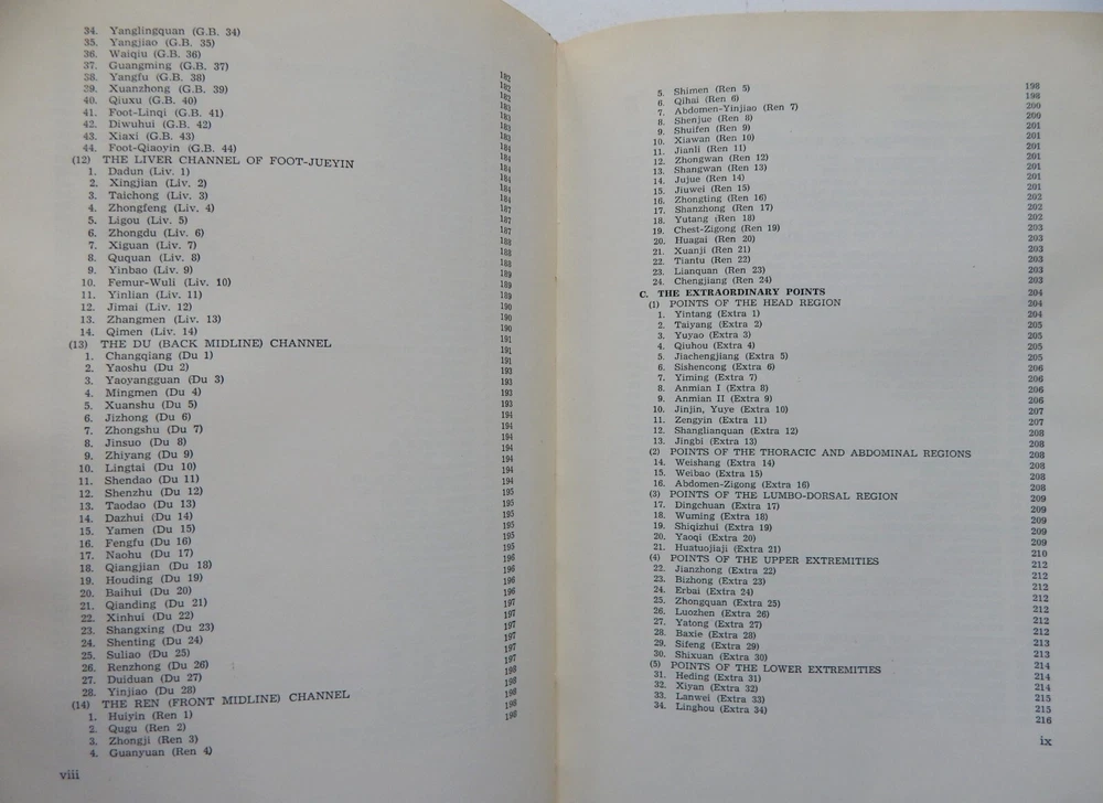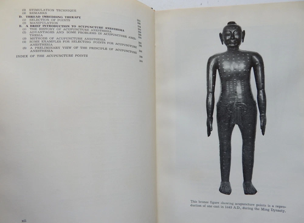 An Outline of Chinese Acupuncture. 1975. English language. Published in the Peoples Republic of China. Included errata sheet attached to the inside of the front cover. Includes a sample acupuncture needle. Ribbon place marker. Many drawings and illustrations. Lists of points throughout the body. See photos.