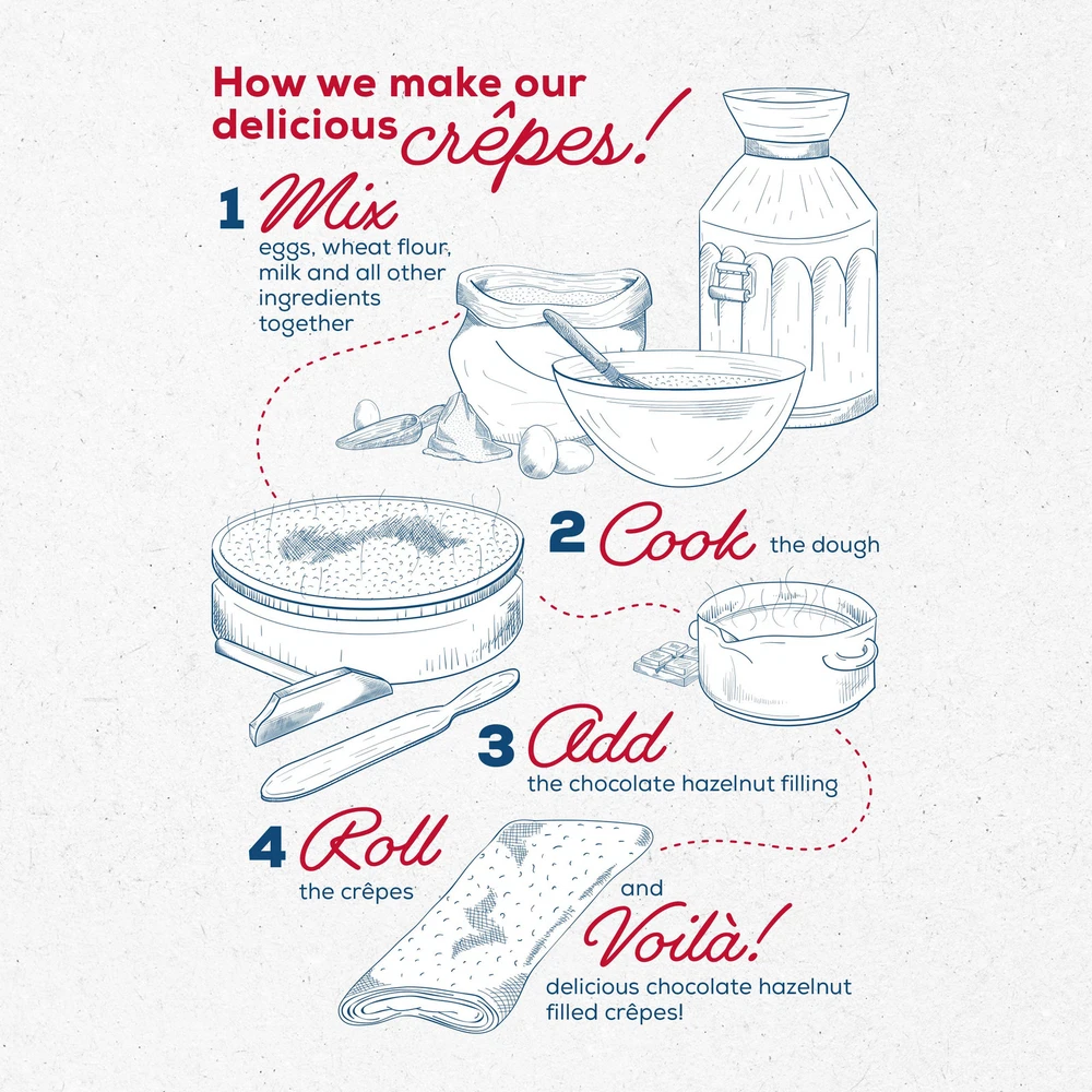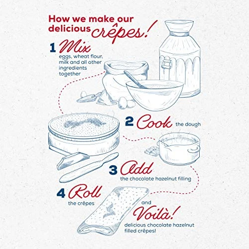 Delicious and authentic french filled crêpes. Behind every chocolate filled crêpe stands a passionate team who uses their “savoir faire” (French for expertise) and passion to transform quality ingredients into authentic snacks. Individually wrapped and ready to eat crêpes. With La Boulangère filled crêpes you don’t need a crêpe maker nor a crêpe mix. Our convenient French crêpes are already filled with tasty and delicious chocolate hazelnut filling. On-the-go convenience for the perfect snack anywhere. Anytime as a snack or for your children's lunchboxes as a special treat, no matter where you are, it is always the right time to enjoy a delicious chocolate hazelnut filled crêpe. A delicious snack for the whole family. The La Boulangère chocolate filled crêpes come in a family size pack of 20 crêpes to share this delicious snack with family, friends and more! Shortlist of ingredients & non-gmo snacks. bakerly rolled and filled crêpes have 45 days of extended shelf life after thaw. They are non-GMO, no high fructose corn syrup, no artificial flavoring, no artificial coloring, no bleached flour and more... Only simple ingredients for everyone to eat without the guilt!