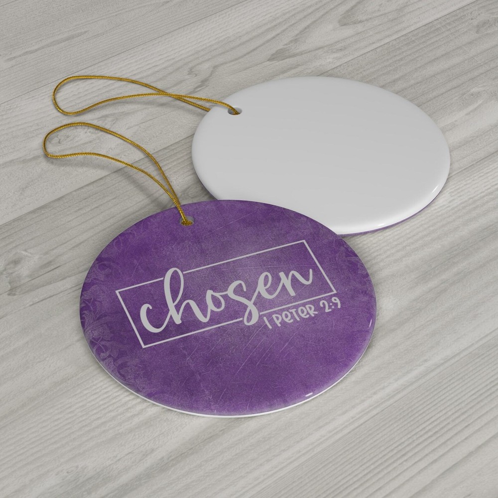 Chosen Ceramic Christmas Ornament Material: Ceramic Color: White Shapes: Circle, star, heart and oval Can be printed on both sides Imprint full-color artwork, photos, or logos Hole for hanging string and hanging string included Printed in the USA