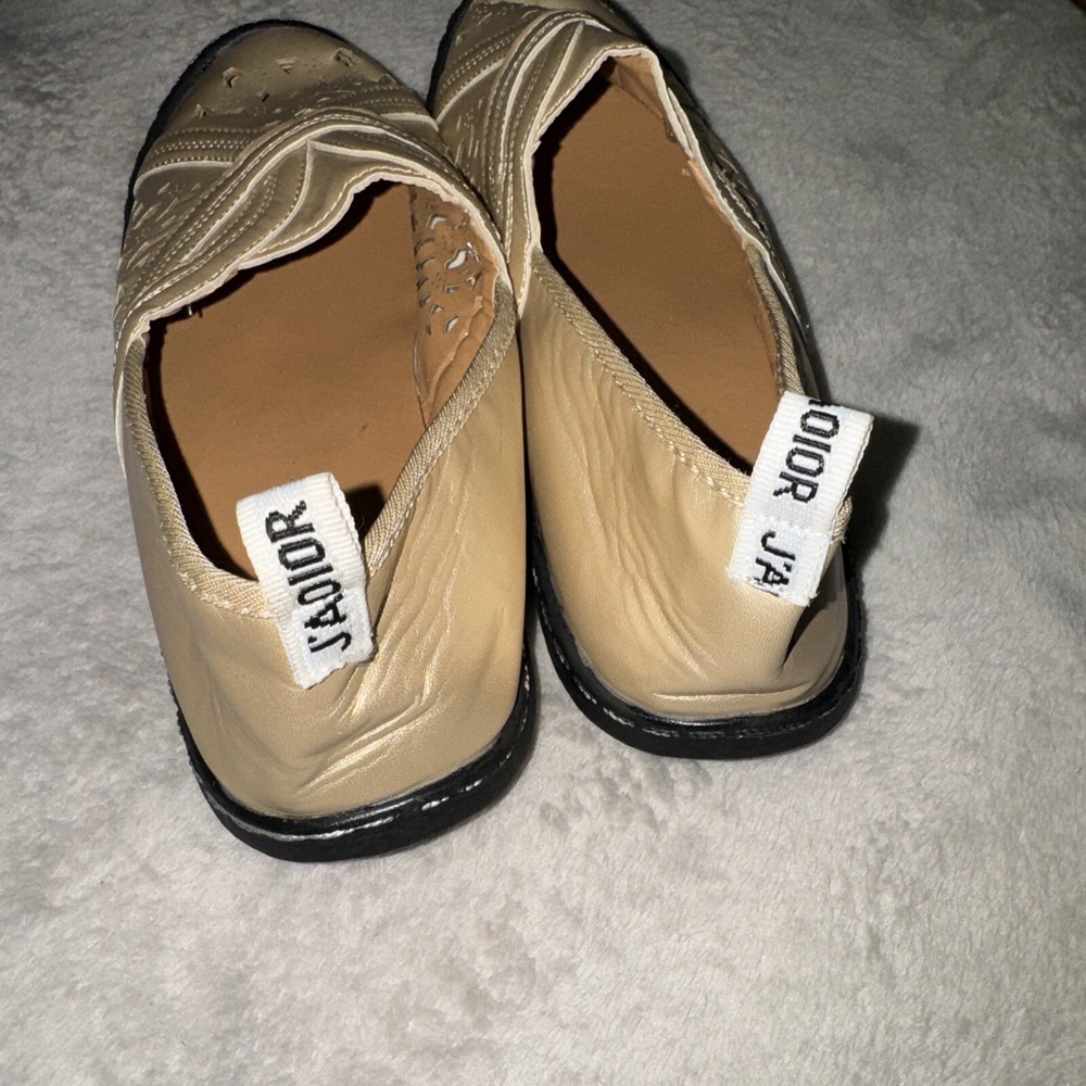 Elevate your shoe game with these stunning J'adior slip-on shoes by Christian Dior. Crafted from high-quality gold metallic leather with laser cut-outs, these flats are perfect for any occasion whether it's casual, party or cocktail, or even travel. The round toe shape and slip-resistant rubber outsole ensure maximum comfort and durability. These shoes are designed for women with a US shoe size of 9 and are perfect for those who love the bohemian theme. The lightweight flat shoes are made with a W shoe width for extra comfort, while the leather insole and upper material make them even more luxurious. Get your hands on these flat shoes today and add a touch of elegance to your outfit.