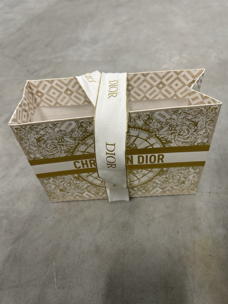 Christian Dior box and bag. I got it with a christmas present but don’t need the bags and box it came in so figured someone else could use it for storage/room decor. straps on bag are ribbon and can be tied, box has a lid and is sturdy