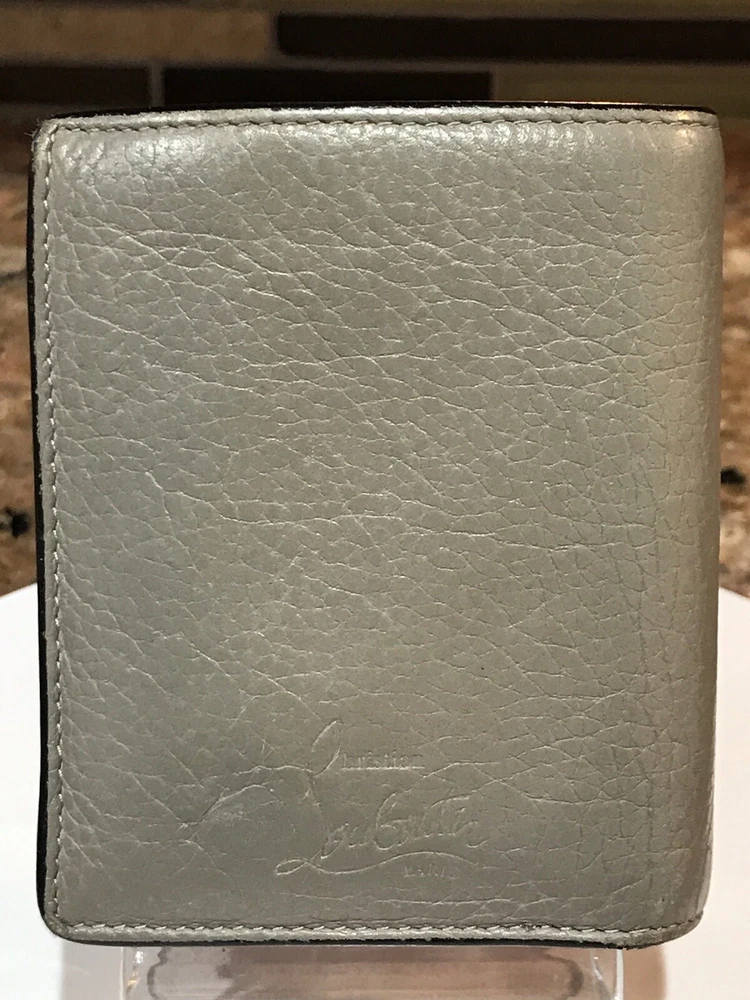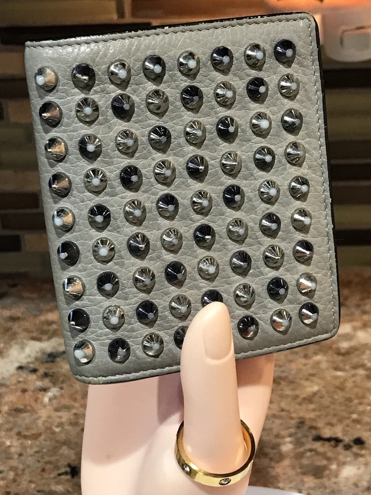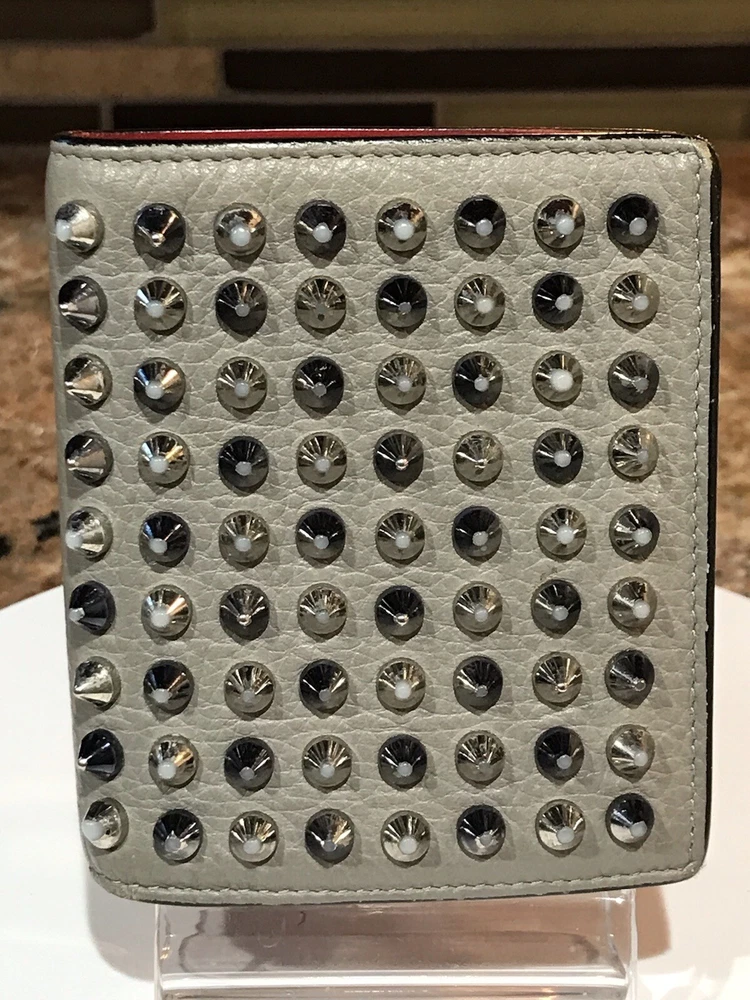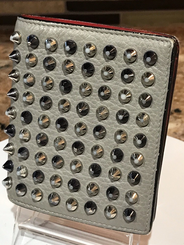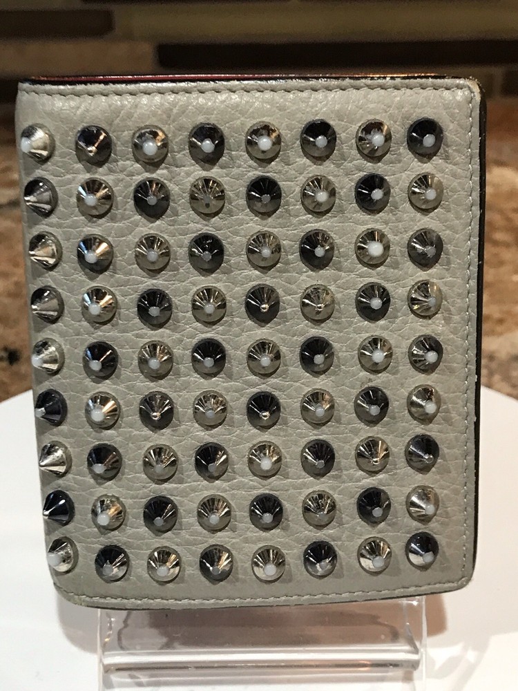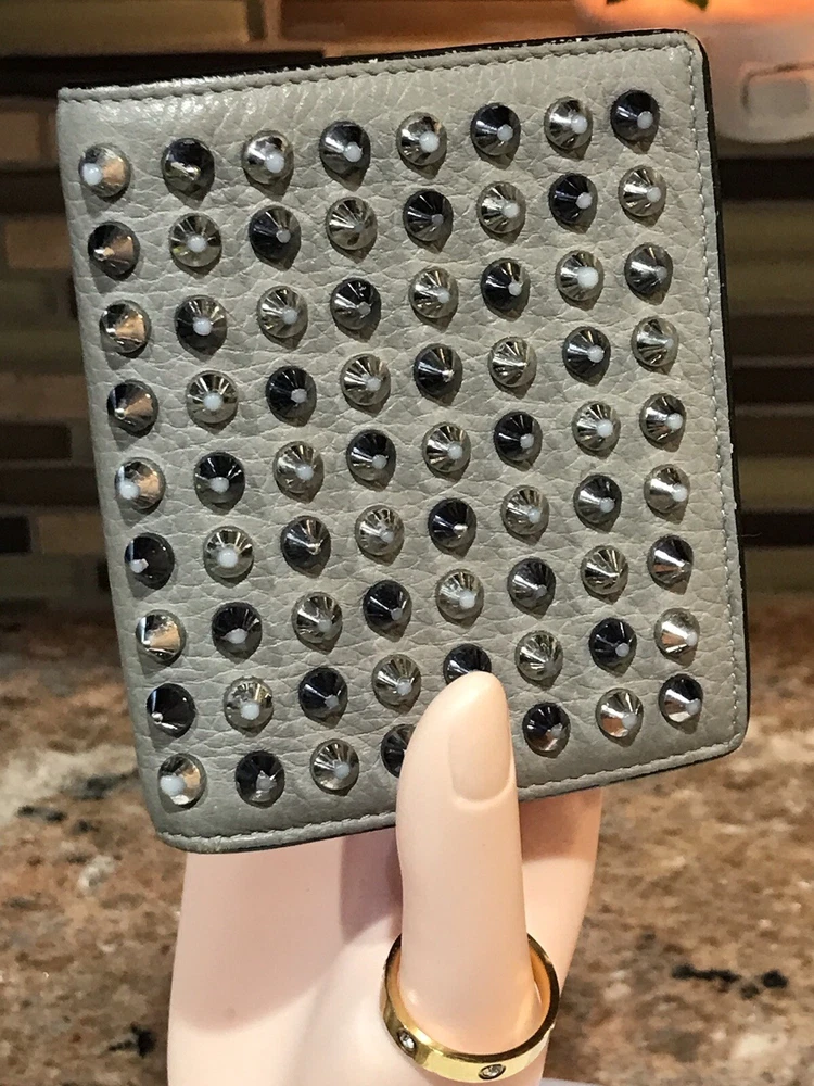 -Condition: Pre-owned ✅ ; in excellent condition 🤩 -Wear on corners; coin residue; minor rubbing on studs -Color: Gray ❤️ -Material: Calfskin Leather -Christian Louboutin Panettone Studs 😍 -Separated compartments -Card Slots -Reasonable offers are welcome 🤗
