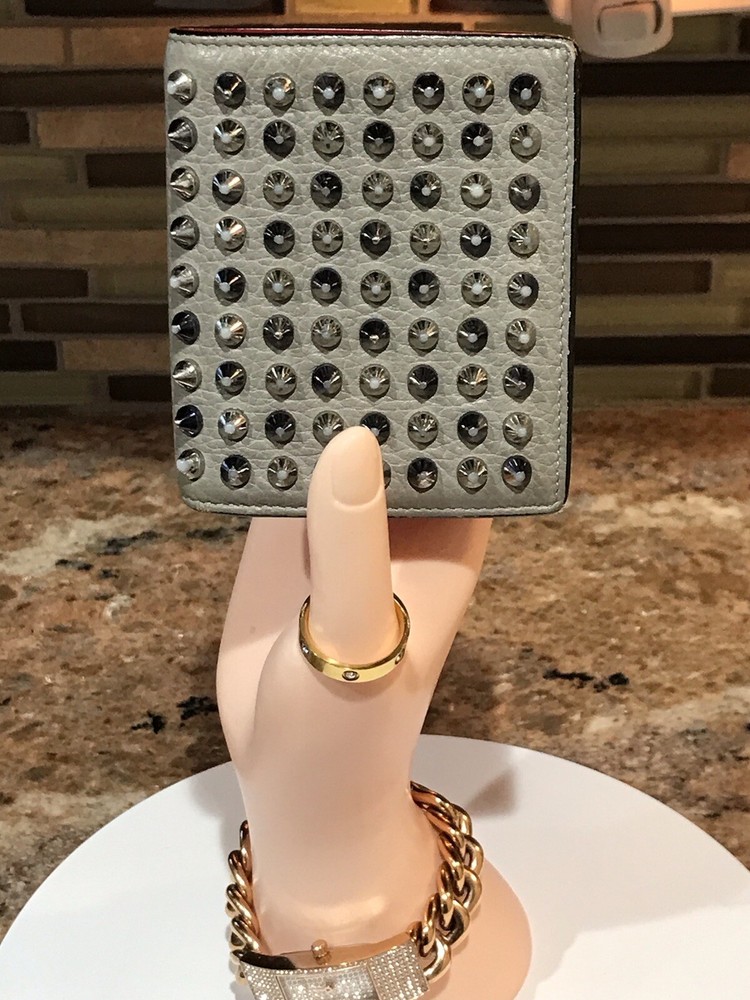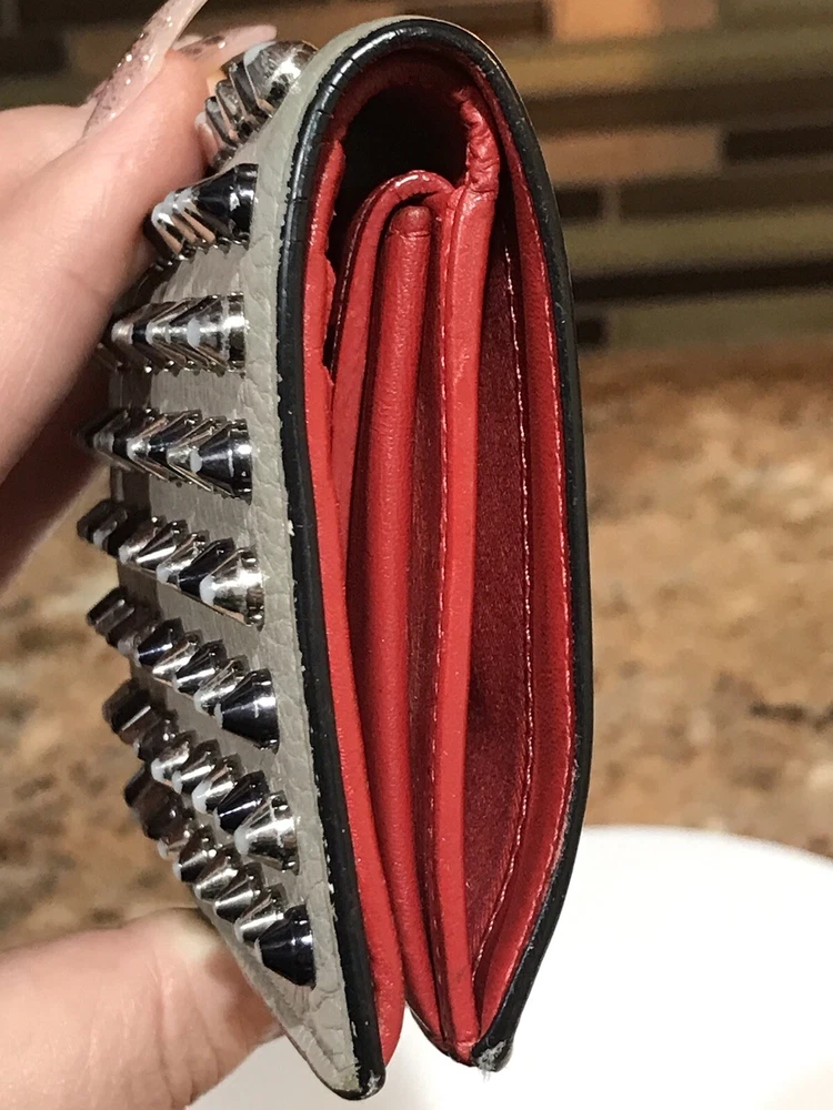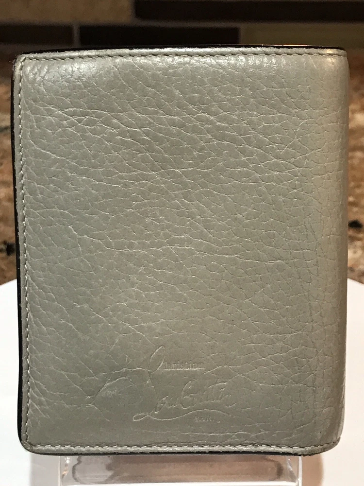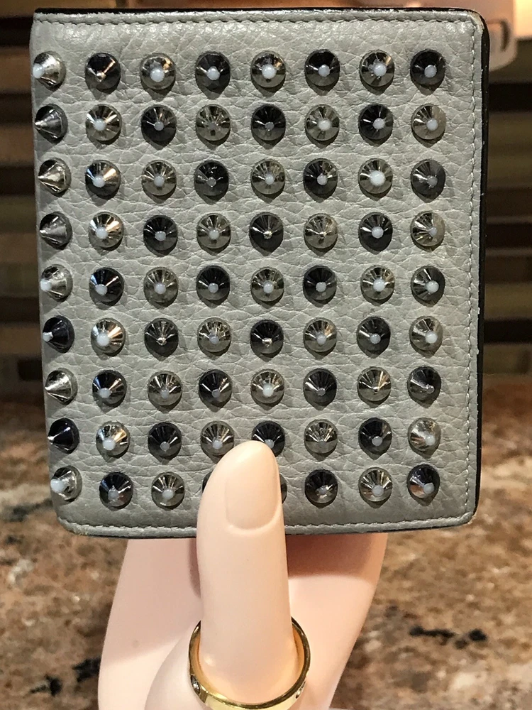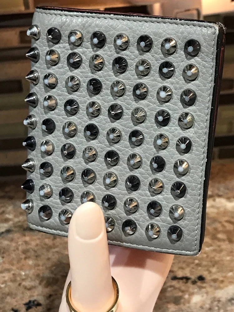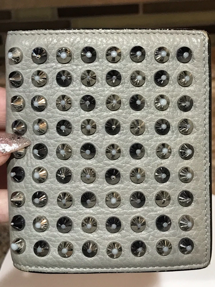 -Condition: Pre-owned ✅ ; in excellent condition 🤩 -Wear on corners; coin residue; minor rubbing on studs -Color: Gray ❤️ -Material: Calfskin Leather -Christian Louboutin Panettone Studs 😍 -Separated compartments -Card Slots -Reasonable offers are welcome 🤗
