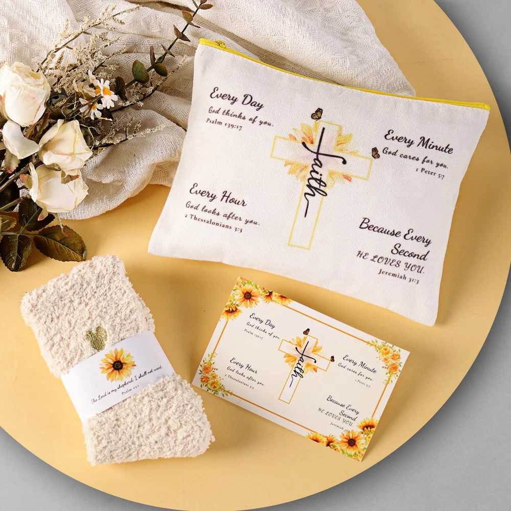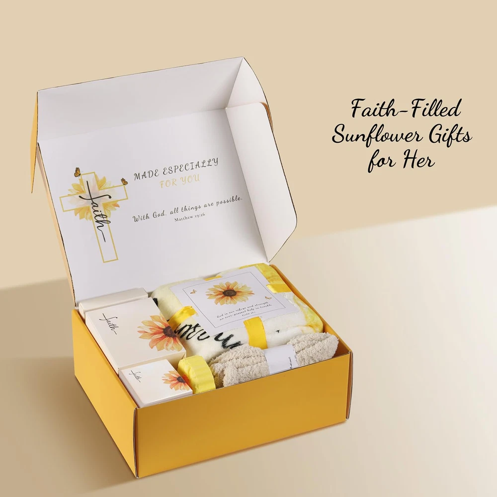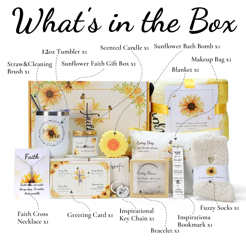 Store New Arrivals Add to Favorite View Feedback Contact Christian Sunflower Gifts for Women,11Pc Religious Faith Gifts,Inspirational Catholic Gifts with Bible Verse for Birthday,Christmas,Get Well Soon Gift Baskets for Mom,Friend,Sister,Mother,Grandma,Wife Description Item model number Gift-01 Unit Count 1 Count Number of Items 11 Country of Origin China Package Information Jar, Bottle Package Dimensions 12.05 x 9.49 x 4.41 inches; 3.17 Pounds Size Large Sunflower Gifts for Women: This beautifully crafted inspirational gift combines the bright charm of sunflowers with uplifting Christian elements; Designed to convey your love and blessings, it’s a thoughtful choice for any special person in your life What You Get: This Christian faith gift includes an insulated tumbler, flannel blanket, stainless steel faith cross necklace, bracelet, bookmark, and key chain, as well as a scented candle, sunflower bath bomb, fuzzy socks, makeup bag, and a greeting card Faith-Filled Messages: Each item features uplifting Bible verses; The sunflower symbolizes light and strength, reminding us to find hope and faith in any challenge; Perfect for religious holidays or daily encouragement, sharing love, hope, and strength Elegant Packaging: The Christian faith gift box is beautifully designed, with each item carefully arranged to create a refined visual effect when opened; every detail is crafted to provide a delightful unboxing experience and memorable moments Perfect for Loved Ones: This sunflower religious gift is ideal for encouraging mom, best friend, sister, grandma, daughter, wife, teacher, aunt, girl, and godmother; it beautifully expresses love and warm wishes, making her feel special and empowered Perfect Gift for Any Occasion: Whether it's Christmas, a birthday, Mother's Day, Thanksgiving, Valentine's Day, an anniversary, a baptism, or retirement; this Christian Catholic gift is a thoughtful choice for expressing care and offering blessings Product Description Sunflower Tumbler Sunflower Blanket Fuzzy Socks, Makeup Bag & Greeting Card Faith Cross Necklace & Inspirational Bracelet Inspirational Bookmark & Key Chain Scented Candle & Sunflower Bath Bomb Sunflower Christian Gifts - Product Features and Details Sunflower Tumbler Made from premium 18/8 stainless steel with double-wall vacuum insulation to keep drinks hot for 6 hours or cold for 9 hours; comes with a leak-proof lid, straw, and cleaning brush for easy use and cleaning Sunflower Blanket This ultra-soft sunflower flannel blanket (300 GSM, 59x39 inches) brings warmth to both body and soul. Its sunflower pattern symbolizes hope and strength, and the fade-resistant fabric ensures lasting comfort. Scented Candle A soy wax candle with a calming lavender fragrance, conveying the warm blessing, “May God's love and blessings be with you always.” Faith Cross Necklace A delicate stainless steel cross necklace, durable and non-tarnishing, constantly reminding the wearer of their steadfast faith. Sunflower Bath Bomb A sunflower bath bomb providing a soothing bath experience, helping her relax and unwind after a busy day. Inspirational Bracelet A beautifully crafted stainless steel bracelet engraved with the scripture "I can do all things through Christ who strengthens me," providing her with endless courage and confidence. Inspirational Bookmark Crafted from high-quality stainless steel, this bookmark features Bible verses engraved with inspirational sayings.Thoughtful gift for book lovers and those seeking faith-based encouragement. Inspirational Key Chain Made from durable stainless steel, this stylish keychain features uplifting phrases and offers a sleek, polished look. It’s designed for daily use and resists rust, corrosion, and tarnishing, making it a lasting reminder of your support and encouragement. Fuzzy Socks A pair of cozy coral fleece socks that provide warmth and comfort, making every step feel like a warm embrace. Makeup Bag This canvas makeup bag (8.8x6.5 inches) combines practical storage with a heartwarming message of divine care and love, making it a meaningful accessory for everyday use. Greeting Card Write your heartfelt message on the card to add a personal touch to the gift, offering comfort and encouragement. Sunflower Faith Gift Box A beautiful gift box filled with items brimming with faith and hope, conveying love and warmth. Custom Christian-Themed Sunflower Gift Box Bring joy and Christian blessings to every woman! LusterStar’s women’s self-care gift box features unique sunflower artwork combined with warm Christian themes. Each item is thoughtfully selected and individually wrapped, avoiding common stock images. Our 11-piece sunshine gift box adds a special touch to your gift, conveying faith and care. Gift differently with LusterStar and offer a unique present that brings true warmth and blessings! ABOUT US We offer the best prices around on high quality products. Our E-store includes media such as books, movies, music and games while offering electronics, toys, sporting apparel, clothing, tools, general home, garden items and more. SHIPPING We are always working hard to ensure your package arrives as soon as possible. Please understand that some factors like weather, high postal traffic, and the performance of shipping companies are outside of our control. We offer free shipping to the lower 48 states and ship within 2 business days of payment, usually sooner. We do not accept P.O. Boxes. Please provide a physical address. For shipping outside of the continental USA, we only use eBay's Global Shipping Program.The item is shipped to KY and then sent to the rest of the world. International customers are responsible for all duties and taxes. Continue to check out in order to calculate costs for shipping the item to your country. Messages regarding eBay's Global Shipping Program MUST be directed at eBay EXCLUSIVELY. RETURNS We offer a 30-Day Return Policy on items which you are not completely satisfied with. You ha