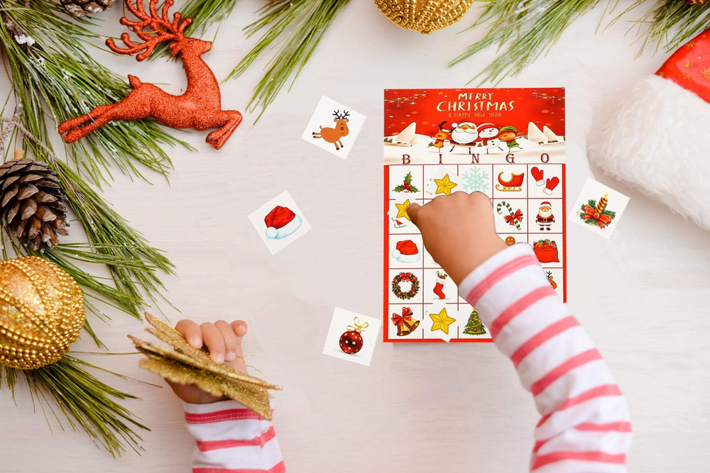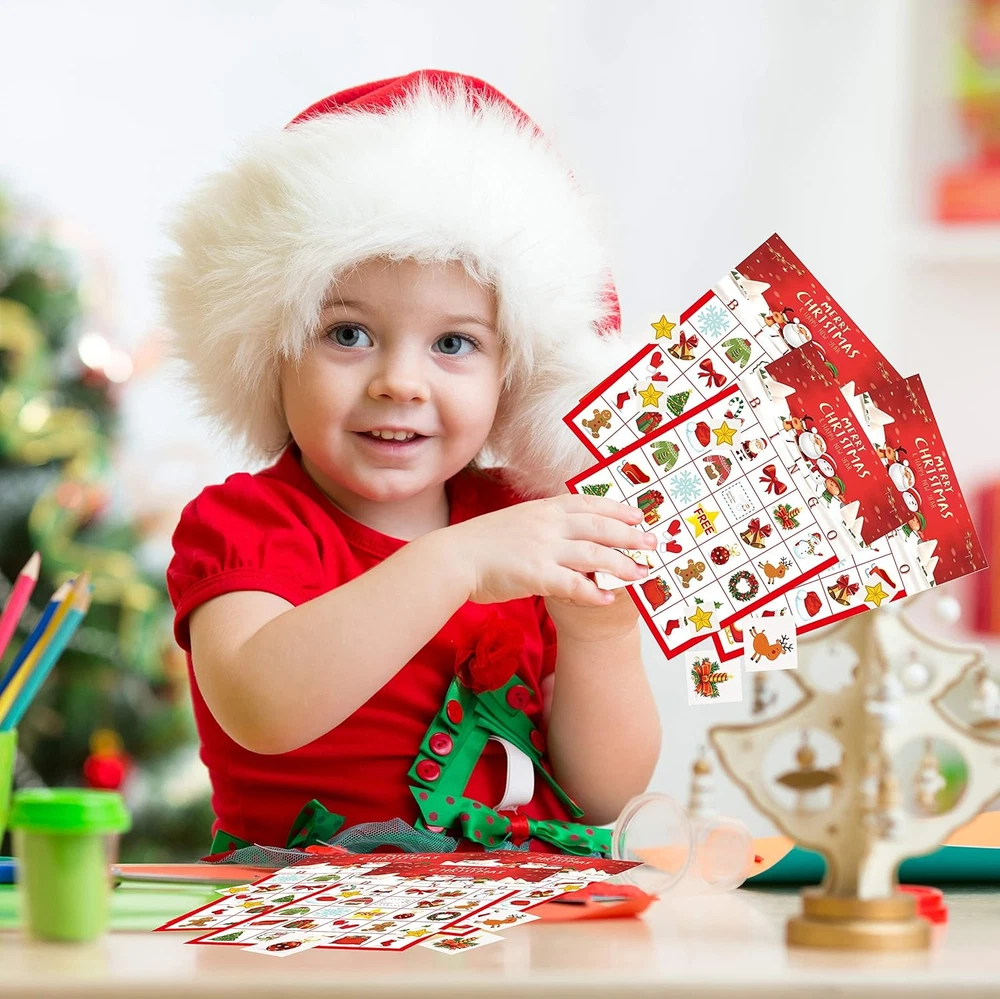 Christmas Games :Include 24 pcs kids bingo player bingo cards, 385 pcs player chips, and 24 pcs caller chips. (easy to tear only by hands or cut by scissors along the hand tearing lines.)Support members to playing ,great family and even mommy time game with your kids. Christmas bingo game is great for Xmas party,classroom party,school party and any events during holiday.Playing bingo game will be a good way for kids to make friends and get families closer. Christmas Crafts - Durable material: Won’t get winkled easily,could be used over and over again. Easy to cut along dotted lines of chip sheets and caller card sheet. Lovely visual and easy understanding rules. Absolutely an awesome gift for kids. The Christmas bingo cards featuring santa clause, deer, xmas tree,stars,candies,snowman and many cute patterns which bring festive atmosphere to your parties. Christmas Crafts for kids:100% free risk purchase:we offer a 90 days money back guarantee service. Product Description If you want to create a funny Christmas party, this Christmas bingo game must be a good choice. HOW TO PLAY? 1. Distribute each player a Christmas bingo card and several player chips. And Caller owns the caller chips. 2. Have each player put a player chip over the free space. 3. The caller would pick one and call out, like santa hat. Then players use the player chips to mark on the player cards. 4. Once a child make a line of 5 pcs ( horizontal, vertical or diagonal, the free space included ), he will yell out BINGO and win the game! Package included: 24 pack Christmas bingo player cards, 11 pack player chips , 2 SHEET Christmas caller chips 24 PACK BINGO CARDS Christmas Player cards measure 5" * 7" Vibrant red colored and unique designed, add festive and funny atmosphere ,bring your Christmas party comes as a hit. So much quantity can meet you needs for big party to great extend. 11 SHEET PLAYER CHIPS CARDS Each one has 35 pcs, totally 385 pcs Player chips measure 0.85" * 0.85" Player chips sheet measures 4.3" * 6.1" Sparkling stars patterns are so cute that favored by kids and adults. 2 SHEET CALLER CARDS Caller card chips measure 1.5"*1.5" Caller cards sheet measure 6" * 4.5" So many unique patterns feature on Christmas element and match patterns on bingo cards perfectly. Dotted line between each chips is so easy to tear without any damage. WIDE APPLICATION Christmas bingo game is available for both kids and adults, great for annual Christmas party ,family gathering and Classroom activities,a good way for kids to make friends and get family member closer.