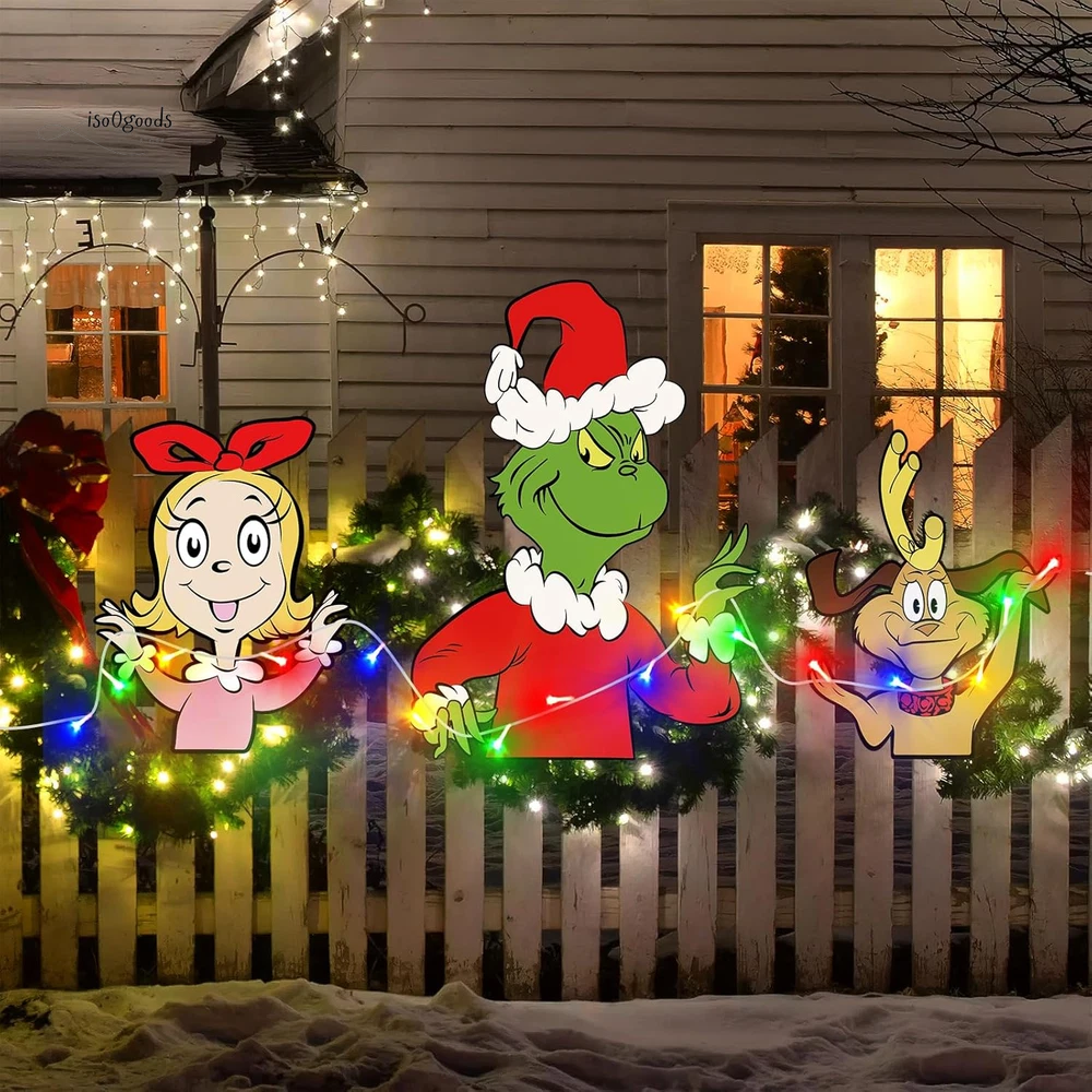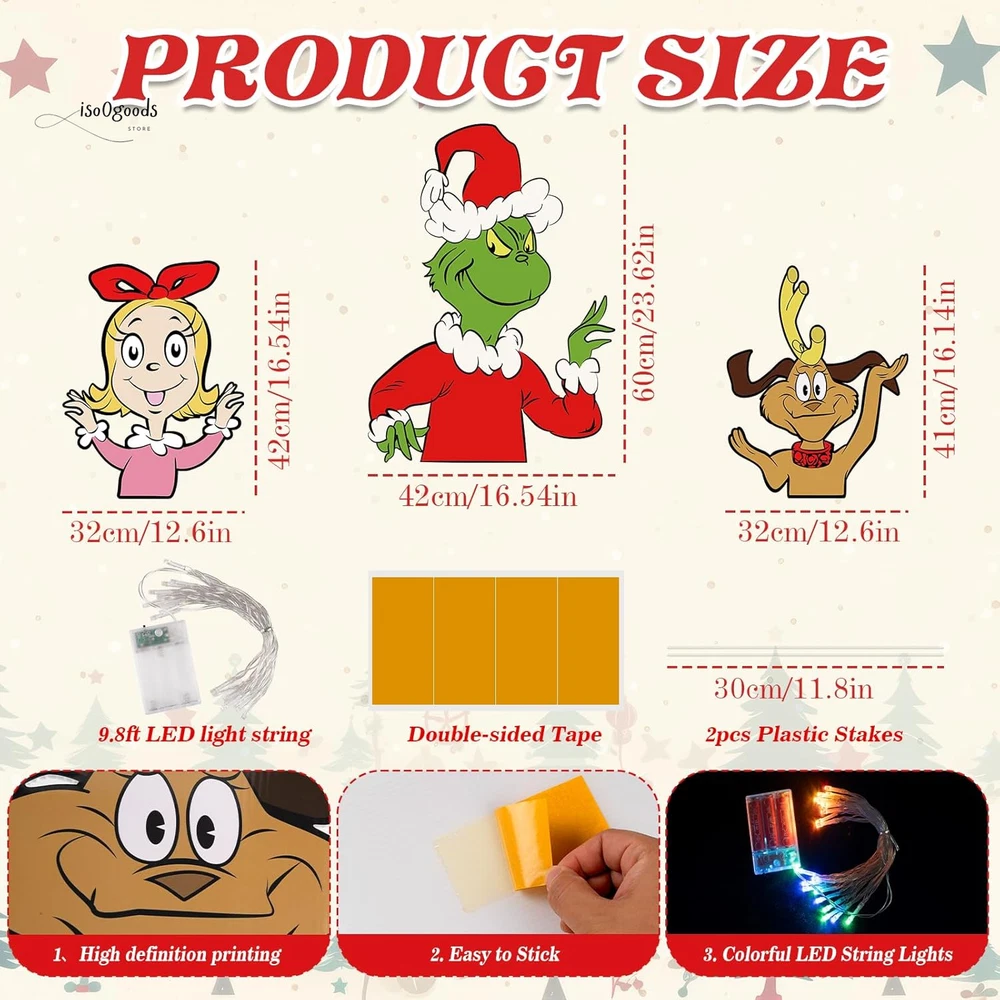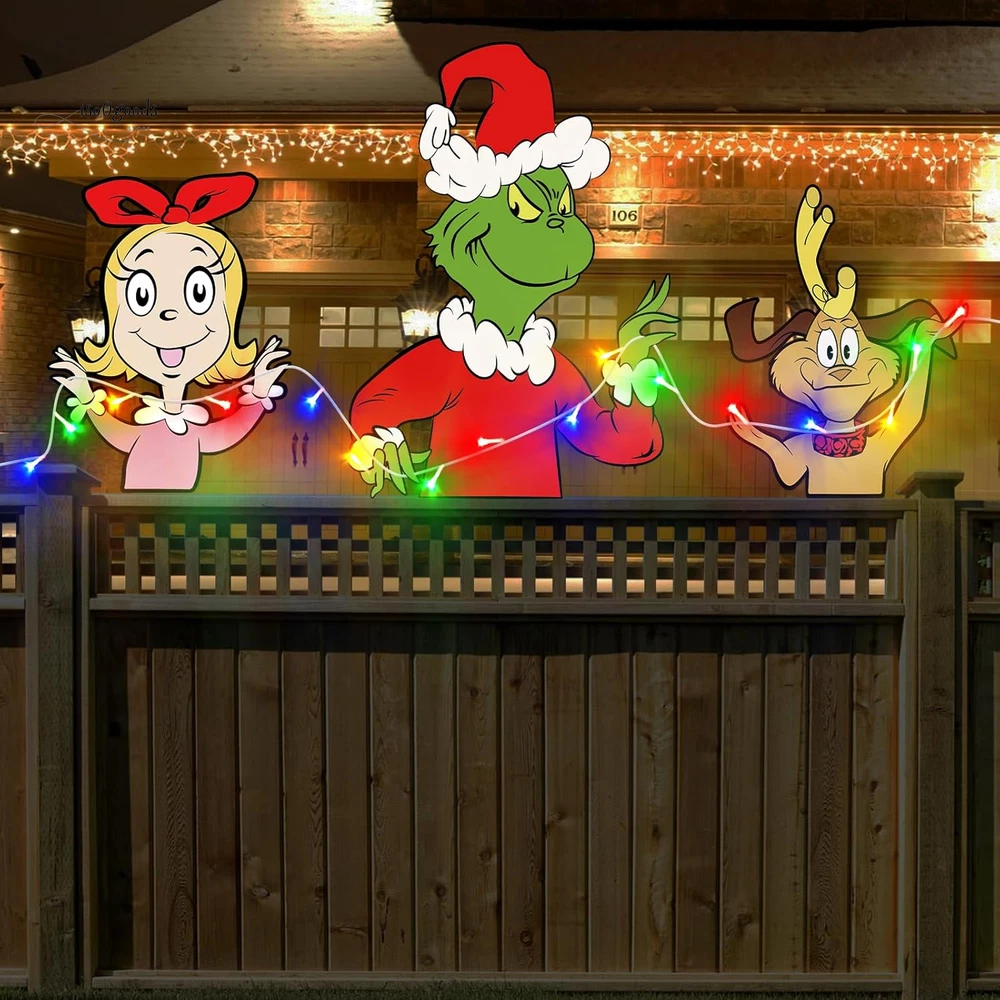 Brighten Up Your Holidays with Festive Christmas Fence Decorations! 🎄✨ 🌟 What’s Included: This complete Christmas yard decoration set is all you need to transform your outdoor space into a festive wonderland! The set includes: 4 Large Decorative Boards 2 Sturdy Plastic Stakes 1 Sheet of Strong Adhesive Tape 9.8ft LED String Lights (battery-powered; 3 AA batteries required, not included) Perfect for creating a vibrant and eye-catching Christmas display that your neighbors and guests will love! 💎 Premium Quality Materials: Made from durable 1000GSM corrugated plastic cardboard with clear, vivid printing. Waterproof and weatherproof to withstand snow, rain, and wind. Designed to last, so you can use them year after year! 🎅 Versatile Christmas Outdoor Decorations: These charming decorations are ideal for: Fences, Yards, Gardens, and Patios Walls, Windows, Porches, and Trees Even as a Christmas tree topper ! The cheerful green gnome and monster designs make them perfect for Christmas, birthdays, weddings, or any festive occasion. They’re a fun and unique way to welcome your guests and spread holiday cheer! ✨ Impressive Size & Design: Large and bold for maximum impact: 12.6" x 16.54" (max dog and girl signs) 16.54" x 23.62" (green monster sign) Eye-catching designs ensure your yard will stand out in the neighborhood. 💡 Bright LED Lights: Includes a colorful 9.8ft LED string light to illuminate your decorations at night. Adds a warm and festive glow to brighten up those chilly winter evenings. Bend and shape the lights for a custom look that’s uniquely yours! 🔧 Easy to Assemble & Install: Simply insert the plastic stakes into the holes of the green monster yard sign. Use the strong adhesive tape to secure the boards to any surface. Wrap the LED lights around the signs for a magical finishing touch. 🌨️ Sturdy & Weatherproof: Built to withstand tough outdoor conditions, including snow and rain. Ensures your decorations stay securely in place throughout the season. 🎁 Perfect for Family Fun: These large, colorful decorations are designed with families in mind. Delightful designs bring joy to kids and adults alike, making your outdoor space the perfect spot for holiday gatherings. ❤️ Customer Support You Can Count On: We’re dedicated to providing top-quality products and outstanding service. If you have any questions or concerns about your Christmas fence decorations, don’t hesitate to reach out—we’re here to help! Transform your outdoor space into a festive holiday showcase with these durable, easy-to-use Christmas fence decorations . Add sparkle, charm, and fun to your holiday season today! 🎄✨