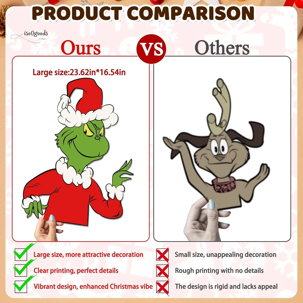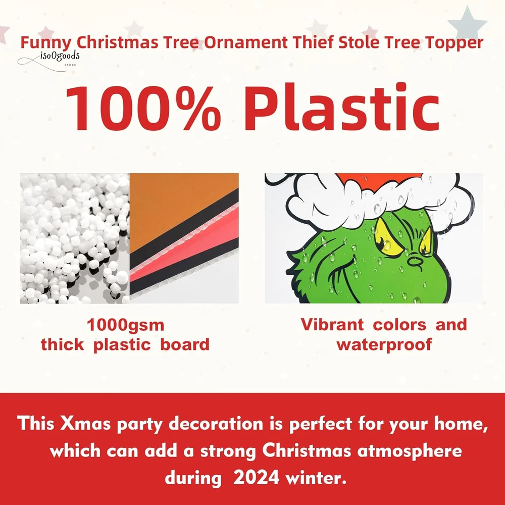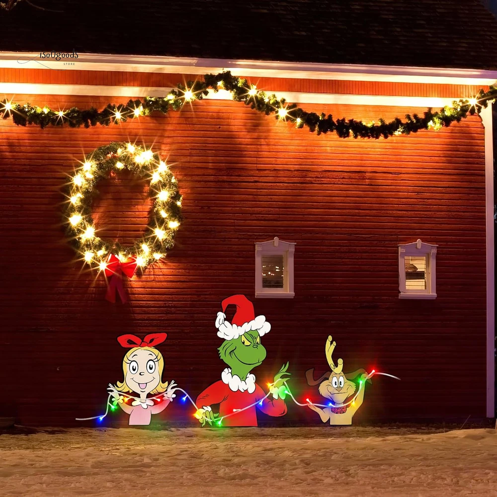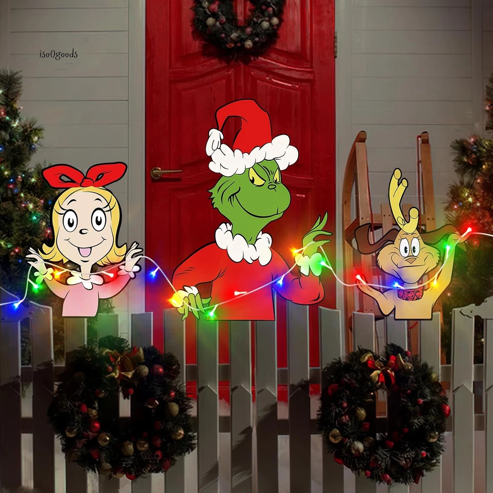 Brighten Up Your Holidays with Festive Christmas Fence Decorations! 🎄✨ 🌟 What’s Included: This complete Christmas yard decoration set is all you need to transform your outdoor space into a festive wonderland! The set includes: 4 Large Decorative Boards 2 Sturdy Plastic Stakes 1 Sheet of Strong Adhesive Tape 9.8ft LED String Lights (battery-powered; 3 AA batteries required, not included) Perfect for creating a vibrant and eye-catching Christmas display that your neighbors and guests will love! 💎 Premium Quality Materials: Made from durable 1000GSM corrugated plastic cardboard with clear, vivid printing. Waterproof and weatherproof to withstand snow, rain, and wind. Designed to last, so you can use them year after year! 🎅 Versatile Christmas Outdoor Decorations: These charming decorations are ideal for: Fences, Yards, Gardens, and Patios Walls, Windows, Porches, and Trees Even as a Christmas tree topper ! The cheerful green gnome and monster designs make them perfect for Christmas, birthdays, weddings, or any festive occasion. They’re a fun and unique way to welcome your guests and spread holiday cheer! ✨ Impressive Size & Design: Large and bold for maximum impact: 12.6" x 16.54" (max dog and girl signs) 16.54" x 23.62" (green monster sign) Eye-catching designs ensure your yard will stand out in the neighborhood. 💡 Bright LED Lights: Includes a colorful 9.8ft LED string light to illuminate your decorations at night. Adds a warm and festive glow to brighten up those chilly winter evenings. Bend and shape the lights for a custom look that’s uniquely yours! 🔧 Easy to Assemble & Install: Simply insert the plastic stakes into the holes of the green monster yard sign. Use the strong adhesive tape to secure the boards to any surface. Wrap the LED lights around the signs for a magical finishing touch. 🌨️ Sturdy & Weatherproof: Built to withstand tough outdoor conditions, including snow and rain. Ensures your decorations stay securely in place throughout the season. 🎁 Perfect for Family Fun: These large, colorful decorations are designed with families in mind. Delightful designs bring joy to kids and adults alike, making your outdoor space the perfect spot for holiday gatherings. ❤️ Customer Support You Can Count On: We’re dedicated to providing top-quality products and outstanding service. If you have any questions or concerns about your Christmas fence decorations, don’t hesitate to reach out—we’re here to help! Transform your outdoor space into a festive holiday showcase with these durable, easy-to-use Christmas fence decorations . Add sparkle, charm, and fun to your holiday season today! 🎄✨