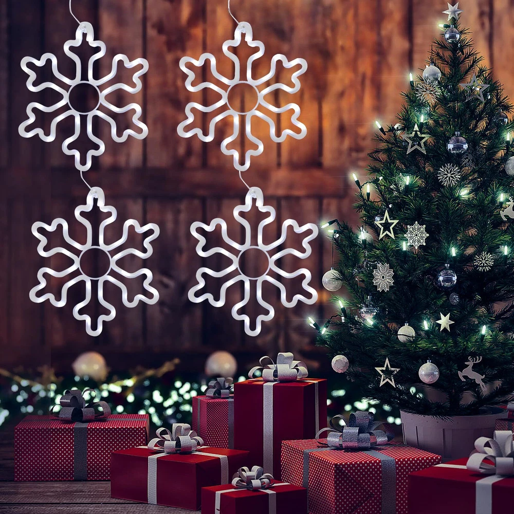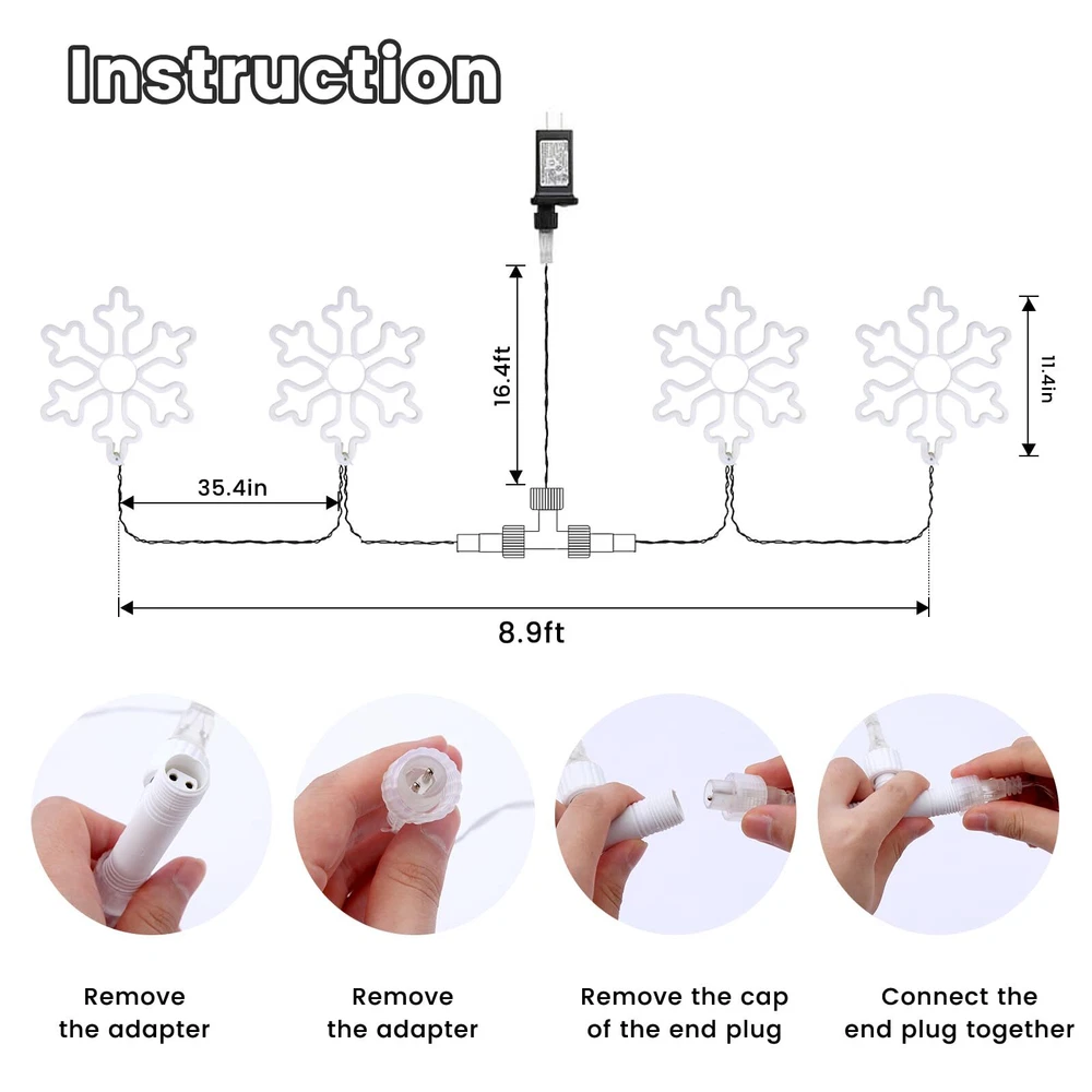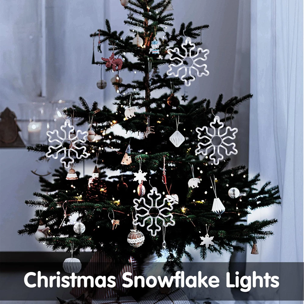 Christmas Decorations snowflake Lights, 4pcs snowflake LED Lights for Christmas Tree and Holiday Seasonal Decoration This christmas snowflake lights work great with christmas trees,windows and outdoor christmas decorations. You can also hang the snowflake lights under the eaves, gutter or porch, place them on fences and stair posts, illuminate windows, arrange on bedroom shelves or furniture, etc. Light up Your Christmas with this snowflake string lights! Perfect indoor outdoor decoration for Christmas tree, wedding, New Year, holiday, birthday, party, festival, bedroom, backdrops, porch, patio, house, stage, etc. Specification: - Total number of bulbs: 144 - Total number of bulbs on each snowflake: 36 led - Size: Snowflake Dia 11.4inch,, plug cable length 5m/16.4ft - Voltage: 29V safe low voltage (Includes UL plug-in transformer) - Power source: Plug-in electric - IP44 Waterproof. NOTE:Please press and hold the round button on the controller until the green light disappears .The timing function is canceled !!! 【About Christmas Decorations Snowflake Lights】The diameter of the snowflake is 11.4inch.There are 36 small led lights on each snowflake.4 pieces snowflake lights with 144LEDs . Plug cable length:16.4ft. Light up Your Christmas with this Christmas snowflake string lights!NOTE:Please press and hold the round button on the controller until the green light disappears .The timing function is canceled !!! 【8 Lighting Modes&Timer and Waterproof】: The christms decorations snowflake lights have 8 different lighting modes: steady on,combination, in waves, sequential, slo-glo, chasing/flash, slow fade and twinkle/flash. IP44 waterproof lighted christmas decorations are perfect for indoor and outdoor decorations. 【Application】: Offers decorative led christmas snowflake lights for party,buildings, wedding ,windows, walkways, patios, gardens, fences, porches, restaurants, clubs, bar etc.High flexibility, temperature sustainability, and UV resistance 【Use Safely &Easy to Installation 】29V low voltage plug with UL certified to ensure safety use.Plug and unplug the power directly to turn on and off.Easy to be hung on a tree or roof to make a decoration to your yard.When you installation, Just hanging the big snowflake on an exterior wall, tree or eaves.It’s great for party,yard indoor outdoor christmas decorations. 【RELIABLE 1 YEAR CUSTOMER SERVICE】If you're unsatisfied with this Christmas snowflake lights for any reason, please feel free to contact us and we will give you a satisfactory solution.