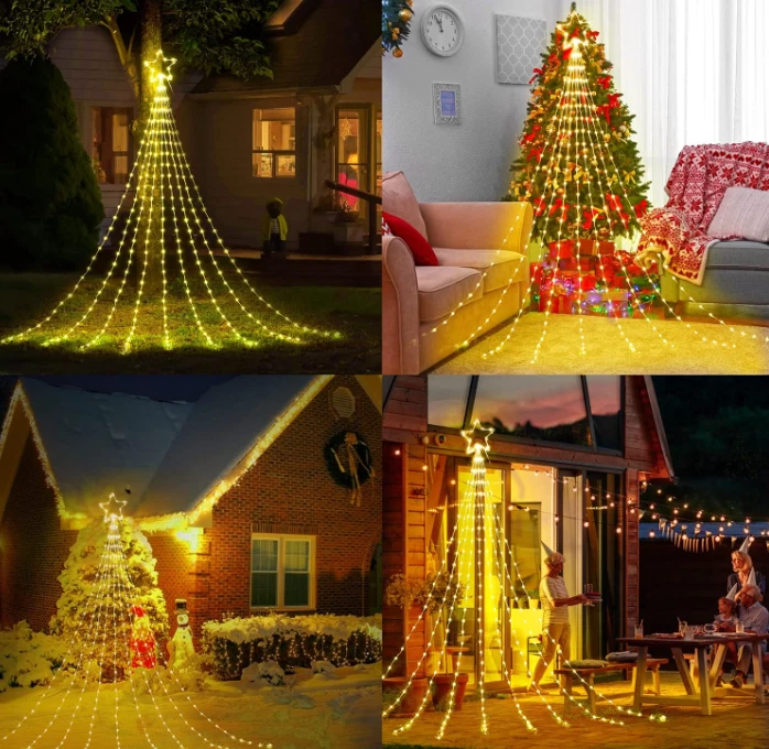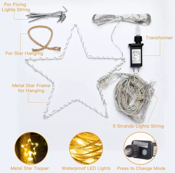 Christmas Decorations Star String Lights 344 LED 11.8ft 9 Strands Waterfall Tree Magical and Cozy Decor: Transform your home into a cozy winter wonderland with our Christmas tree decoration lights. The 11-inch topper star and 9 strings of warm white lights, each 11.8 feet long, add a touch of elegance to your holiday decor. Plus, with 1 hanging string and 9 ground spikes, these lights are perfect for versatile outdoor decorating. Versatile Indoor and Outdoor Use: IP44 waterproof and perfect for outdoor spaces like yards, fences, and plazas, as well as indoor spaces such as hotels, restaurants, cafes, and malls. Illuminate any space and create a festive ambiance for any occasion. Multiple Lighting Modes: Choose from 8 adjustable lighting modes, including combination, in waves, sequential, slow glow, chasing/flash, slow/fade, twinkle/flash, steady on. Press mode button selects 8 different modes to satisfy your diverse needs. Safe and Convenient: Our lights come with a timer function - holding the press button on the adapter for about 3 seconds to set the 6 hours on and 18 hours off timer. These lights are touchable at low temperatures and come with a press-and-hold adapter button, ensuring they are safe to use. Great Gift for Any Occasion: These Christmas lights are easy to assemble and store, making them a perfect gift for any occasion. From New Year's to weddings, holidays, and anniversaries, give a festive gift that will bring joy and warmth to any home. Your loved ones will treasure this thoughtful and practical gift for years to come. SPECIFICATIONS: Star Topper: 11 inches LED quantity: 290 LED lifespan: 30000H Light spacing length: 3.9 inches Lead cord length: 16.4 feet Light color: warm white Color temperature: 2850K Waterproof grade: IP44 Ground spike: 9 pieces Power input: 120V~60Hz, 0.20A Power output: DC30V, 0.20A 8 Working Modes: 1.Combination 2.In Waves 3.Sequential 4.Slow glow 5.Chasing/flash 6.Slow/fade 7.Twinkle/flash 8.Steady on Package Includes: 1 x Star Topper String Lights 9 x Ground Stake 1 x Hanging String 1 x User’s Manual ORDER NOW for giving your home, holiday or party for fully showing! Terms of Sale and Feedback: Feedback is very important to us and eBay. If you are satisfied with our transaction, please take a moment to leave positive feedback. YOUR satisfaction is our number one priority! If there are any problems, PLEASE contact us BEFORE leaving a neutral or negative rating so we can resolve any concerns. We PROMISE that we can make you happy if you give us a fair chance.