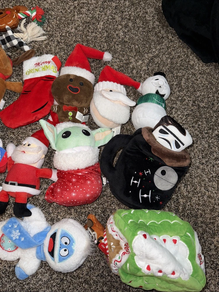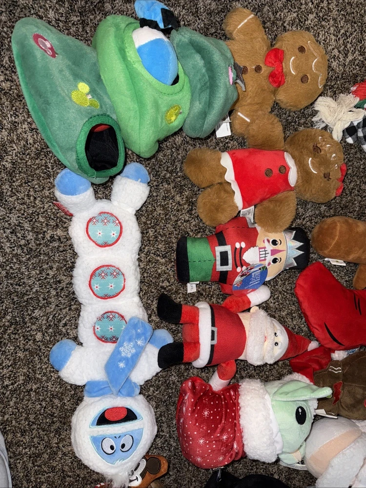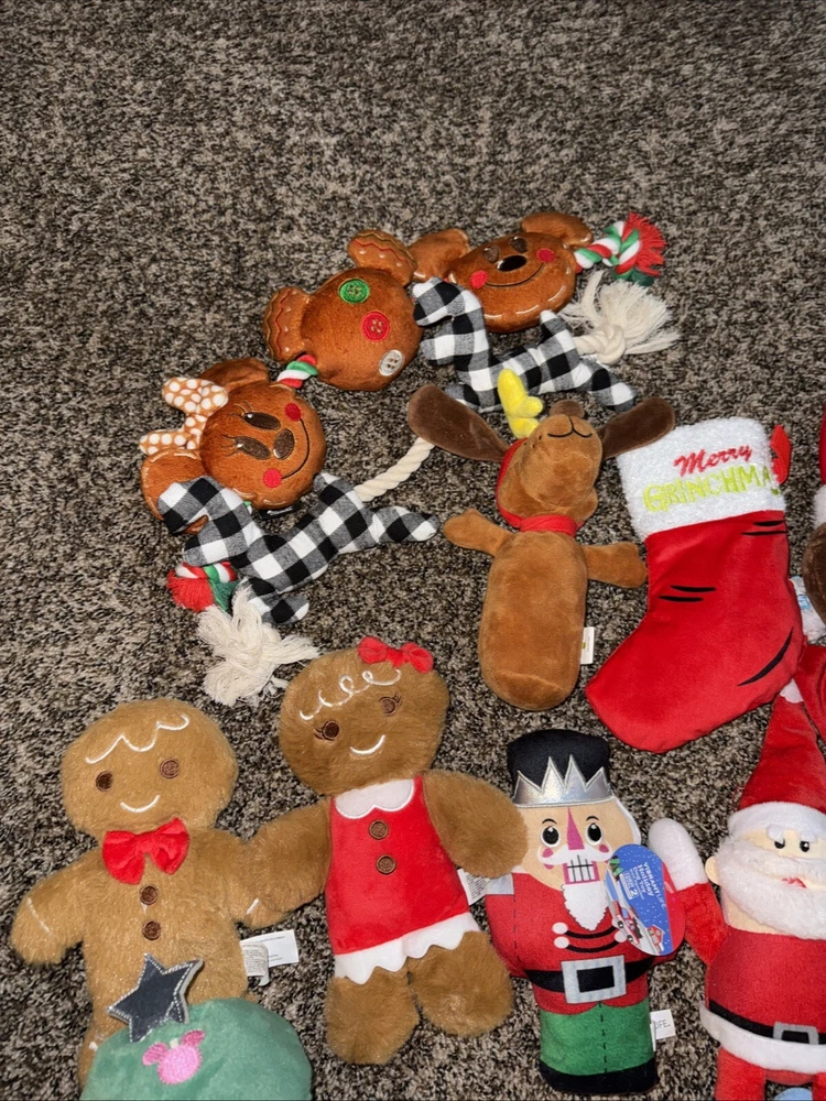 This is a lot of 16 Christmas dog toys, designed for medium-sized dogs. They are about 10 inches or more in size. They are in good condition as they contain no rips, tears, or stains. The toys are made of plush material and feature multiple brands. The lot includes hide and seek toys, squeaky toys, crinkle toys, rope toys, and interactive toys. Brands included are Bark, Go Dog, Chewy, and more. The assortment of stuffed toys is sure to provide entertainment and fun for your furry friend during the holiday season.
