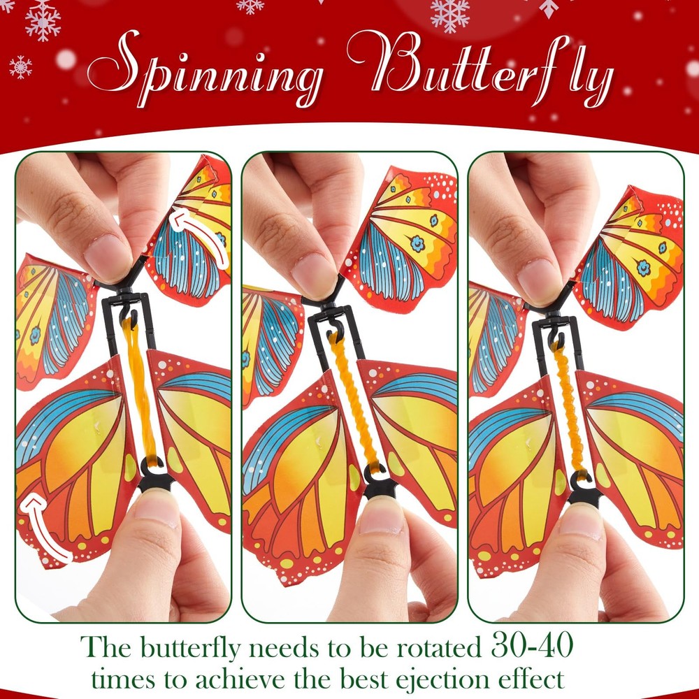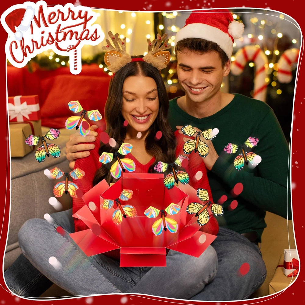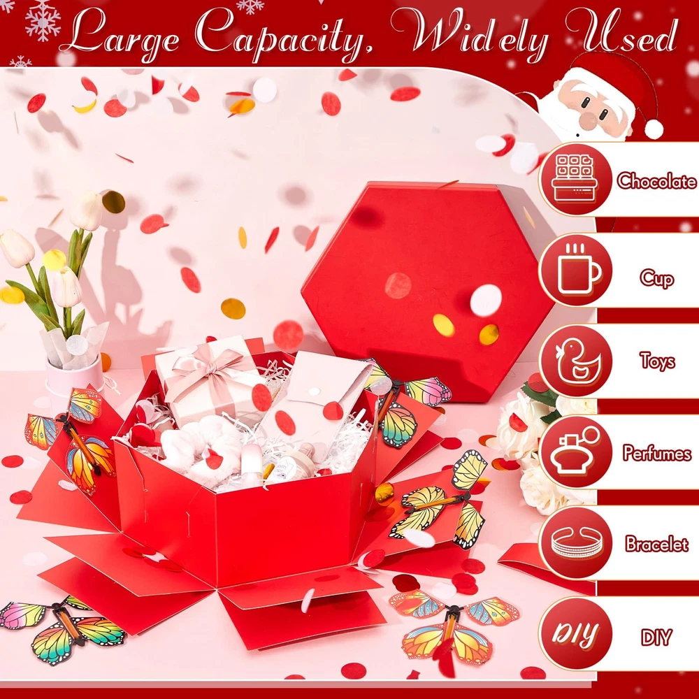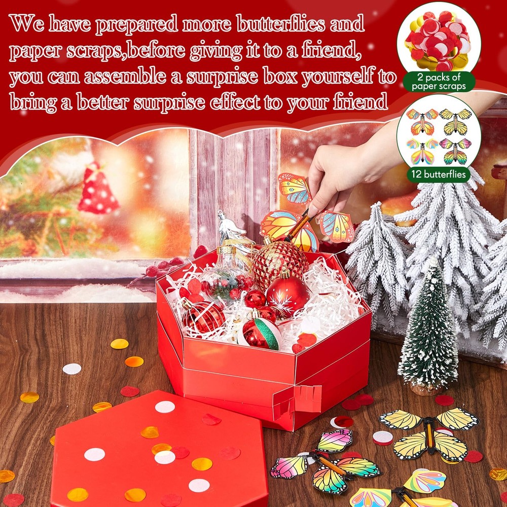 Features: Record beautiful moments: Whether it's your partner's birthday, your friend's special day, your parent's celebration ,a friend's festive occasion, or Christmas day.this DIY surprise gift box promises a creative and entertaining surprise experience, capturing their surprised expressions. Exquisitely crafted box: Crafted with attention to detail, this DIY explosion gift box is exquisite, radiating joy and surprise with its pleasing aesthetics. Besides, it's easy to assemble, adding to your convenience. Specifications: Material: card paper, rubber bands Color: red Size: Box: about 5.7 x 5.7 x 4.6 inches Ribbon: about 0.98 inches Package includes: 1 x Butterfly explosion gift box 12 x Ejecting butterflies 2 x Bag of colorful confetti 1 x Ribbon 1 x Double sided tape Notes: Manual measurement, please allow slight errors on size. The color may exist a slight difference due to different screen displays. Small parts included, please keep them away from little kids to avoid swallowing risk. Suitable for people over 14 years old, and it's recommended to use under the supervision of adults in case of choking risk Easy to Assemble: take a butterfly box, start rotating the rubber band, after about 30-40 times, put the rotating butterfly into the inner layer of the box, and so on, put the butterflies around, sprinkle some colorful confetti, and then close the lid; We also provide instructions to make it easier; Please note: twist the catapult butterfly to the appropriate number of turns for a surprising explosion and flying effect Delightful Surprise: this butterfly surprise gift box includes 1 red explosion gift box, 12 ejecting butterflies, 2 bags of colorful confetti, a roll of ribbon and a double sided tape, suitable for sparking joy and excitement, providing a wonderful unboxing experience; Rich colors, it leaves a lasting impression Easy to DIY: featuring a red design, the butterfly surprise gift box keeps its surprise element intact; You can tape the memory-filled photos on the surprise gift box and writing words. The center of the gift box provides you with a large space where you can place a sweet little cake, beautiful flowers, cute little dolls and other gifts, offering ample room for your tokens of love Quality Material: our flying butterfly box is constructed from card paper; The ejection butterflies are powered by safe rubber bands, making the entire product safe and user friendly; Please note: twist the catapult butterfly to the appropriate number of turns for a surprising explosion and flying effect Versatile Gift: the explosion gift box is a versatile present, suitable for creating an ambiance of surprise; It's an ideal choice for colleagues, family, and loved ones for Christmas,birthdays, anniversaries, Valentine's Day, Mother's Day, Father's Day and many other celebrations
