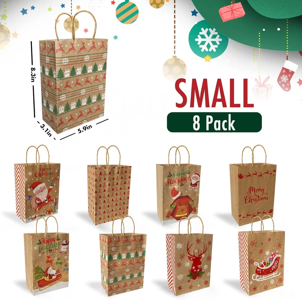 Store New Arrivals Add to Favorite View Feedback Contact Christmas Gift Bags 24 Pack, Christmas Kraft Paper Bags Bulk with Handles 24 Styles, Assorted Sizes Bag Set with 50 Tags, Xmas Holiday Paper Bags & Goody Bags, Favor Bags (8 Large, 8 Medium, 8 Small) Description Unit Count 24.0 Count Number of Items 24 Color Red, Green, White Product Dimensions 12.9"L x 10.2"W x 4.7"H Material Paper Country of Origin China Package Dimensions 16.54 x 13.5 x 2.83 inches Item Weight 1.85 pounds Theme Patterns Occasion Christmas Brand Bavcieu Cartoon Character Santa Claus Included Components Christmas Gift Bags, Gift Tags 【Great Value 24 Pack】Christmas Kraft Paper Bags includes 24-count Christmas Gift Bags and Extra 50-count Gift Tags. Christmas gift bags Designed with handles, is very convenient to carry. And the decoration of the bag with the tags is more beautiful and the festive atmosphere is stronger. 【24 Different Patterns Design】24 Pack Christmas Gift Bags with 24 patterns. There are many classical Christmas elements, including Santa Claus, reindeer, snowman, Christmas tree, pine, Christmas socks, bells, merry Christmas, snow wreath, etc. 【3 Sizes of Christmas Gift Bags】Christmas Gift Bags has Assorted Sizes. Large: 12.9" L x 10.2" W x 4.7" H (8 Pack), Medium: 10.6" L x 8.3" W x4.3" H ( 8 Pack), Small: 8.3" L x 5.9" W x 3.1" H (8 Pack). 【Premium Materials】Christmas gift bags are made of Upgraded thickening Premium Kraft Paper bags, durable, unbreakable, sturdy, and can be reused. Brown paper bags look textured and are more advanced and environmentally friendly than plastic bags. 【Multiple Uses】Christmas paper bags with handles are perfect for items such as mugs, scents, small dolls, and picture frames. Gift bags can be used as Christmas gift bags or Christmas decorations, but also as everyday shopping bags, both convenient and environmentally friendly. Product Description If you have any questions about product, please tell us. We will provide you with a satisfactory solution within 24 hours. Package Included: Christmas gift bag (Large x 8) Christmas gift bag (Medium x 8) Christmas gift bag (Small x 8) Gift Tag & Gift Tags Rope x 50 Bavcieu 24 Pack Christmas Gift Bags are perfect for Xmas or other festive occasions. It's a great choice for packing gifts for family and friends. 24 Pack Christmas Gift Bags Size 1- Large:12.9" L x 10.2" W x 4.7" H (8 Pack) Size 2- Medium:10.6" L x 8.3" W x4.3" H ( 8 Pack) Size 3- Small:8.3"L x 5.9" W x 3.1" H (8 Pack) 50 Pack Gift Tags Tag 1- Rectangle:12.9" L x 10.2" W x 4.7" H (35 Pack) Tag 2- Round:10.6" L x 8.3" W x 4.3" H ( 10 Pack) Tag 3- Strip:8.3" L x 5.9" W x 3.1" H (5 Pack) Rope:9.8" W/PCS (50 Pack) Each size contains 8 different patterns, 3 sizes have a total of 24 patterns. Share Happiness Christmas gift bags consist of 24 different patterns of gift bags, Every pattern is unique, It is easy to distinguish and give your family or Friends a different surprise. Various Occasions Christmas kraft paper bags with tags are great for Christmas party favors, home, office, classroom, Christmas tree, holiday, festival, wedding, baby shower, and birthday decorations, to create a Christmas ambiance. Perfect Capacity Christmas gift bags have 3 size match all your special packing requests, you can use them to hold Xmas gifts perfectly like toys, candies, shoes, gift cards, wine, scarf, A4 size or larger books, and so on. ABOUT US We offer the best prices around on high quality products. Our E-store includes media such as books, movies, music and games while offering electronics, toys, sporting apparel, clothing, tools, general home, garden items and more. SHIPPING We are always working hard to ensure your package arrives as soon as possible. Please understand that some factors like weather, high postal traffic, and the performance of shipping companies are outside of our control. We offer free shipping to the lower 48 states and ship within 2 business days of payment, usually sooner. We do not accept P.O. Boxes. Please provide a physical address. RETURNS We offer a 30-Day Return Policy on items which you are not completely satisfied with. You have the option for a full-refund or an exchange of the item. No returns are available on items shipped outside of the USA. PAYMENT We accept PayPal. CONTACT US This page content is yet to come Please ad us to your favorite seller and visit again later Thank You CUSTOMER SATISFACTION We try our very best to make sure every customer is completely satisfied. If there's a problem, message us! We're happy to help.