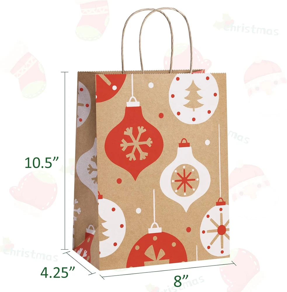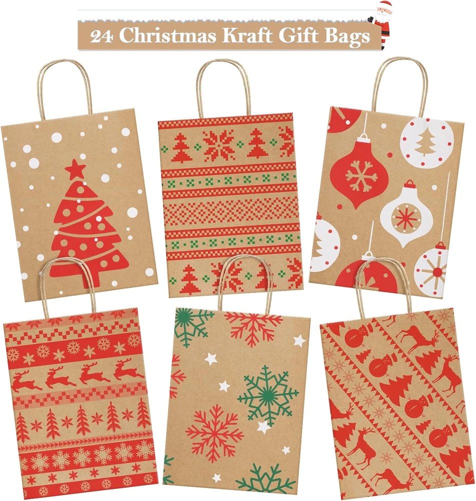 24 Gift Bags Provide 6 Assorted Christmas Designs. Red and green pattern elements provide a strong holiday atmosphere, making it super ideal to hold special presents for Christmas holiday. Suitable for wrapping gifts to your neighbors, teachers, families, friends, customers and so on. Gift Bags Medium Size. 8x4.25x10.5". These Christmas paper bags are perfect for Christmas parties or gifts decoration, Christmas gifts or gift boxes wrapping, Christmas Trees, Classrooms, Party Favors. Attractive design and sturdy material. A good Christmas paper gift bag option. Premium Christmas Kraft Gift Bags. Holding up to 8lbs, these sturdy kraft gift bags are made of 110g basis weight paper and have well constructed paper twist handles. No stray glue any where and the flat solid bottom can make it stand easily. Eco-friendly Christmas Paper Bags. These brown Xmax gift bags are made of Recycled Paper. FSC COMPLIANT. BagDream kraft Christmas gift bags are RECYCLABLE, no peculiar smell and look classier as gifts bags. Shopping Worry-free. We never want to make our valued customers disappointed. If there's any reasons you’re not happy with our Christmas gift bags, just email us and we’ll fix it up asap. Please keep these santa bags to avoid the hassle of shipping them back. Product Description BagDream 8X4.25X10.5" Christmas Gift Bags 24PCS Dust-Free Production Crafted in a specialized dust-free workshop, ensuring the highest quality for every paper bag. Load-Bearing Strength Each batch undergoes rigorous load-bearing tests, guaranteeing reliable performance with every use. Precision Craftsmanship Featuring imported adhesive on the bottom and handles, our paper bags are engineered for exceptional durability and strength. Christmas Paper Gift Bags Details Package of X-mas brown gift bags: 6 patterns and 4 bags per pattern. You will get pack of 24pcs gift bags. Paper bags with handles: 110g basis weight. Made of Recycled Paper with a serrated top edge. Christmas paper gift bags: Red and green color elements provide a strong holiday atmosphere, making it super ideal to hold special presents for Christmas holiday. Perfect for Christmas gift bags or party favor bags.