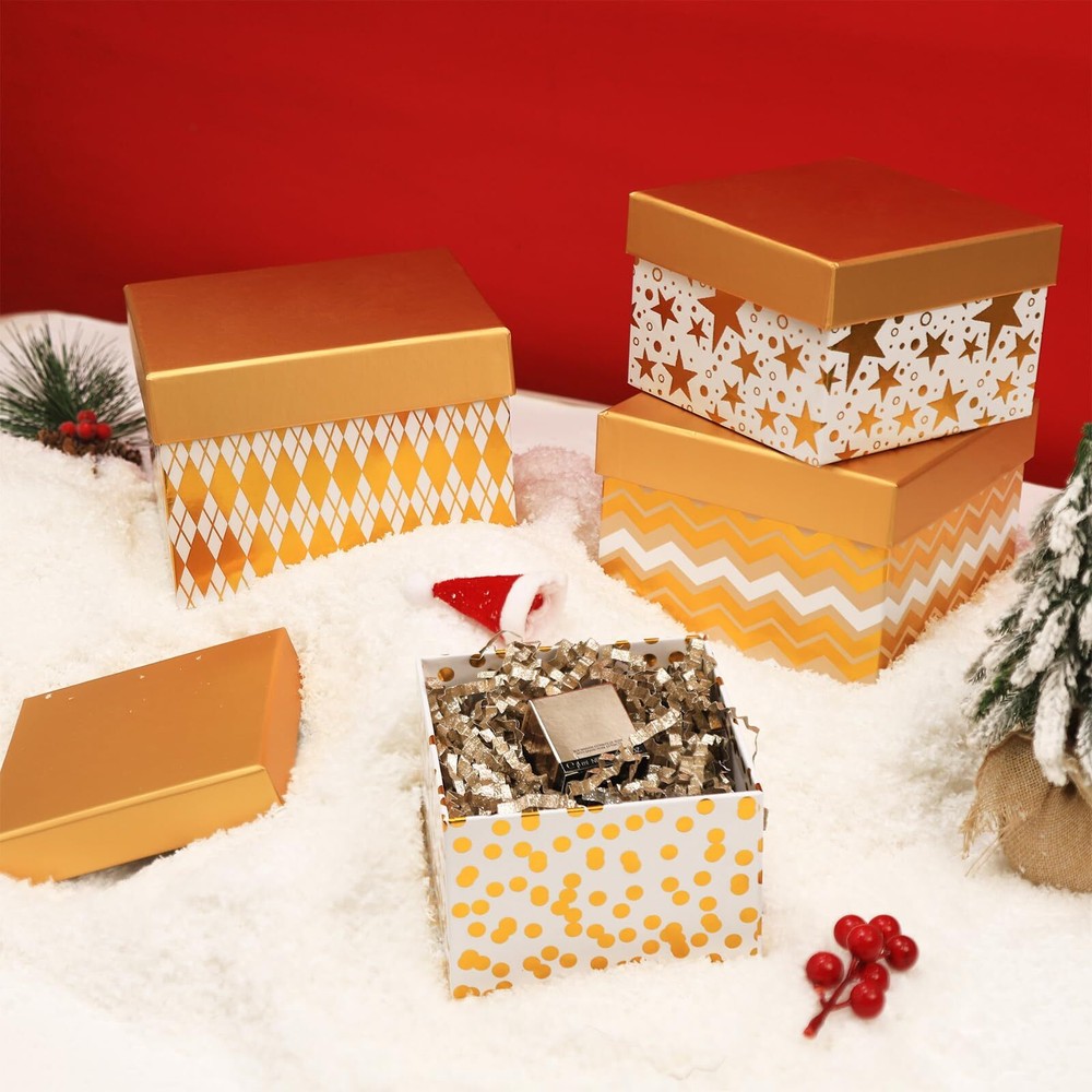 eBay Product Listing Welcome to Your Favorite My Store Your satisfaction is our top priority – Shop confidently 4PCS Christmas Nesting Gift Boxes Set, Metallic Gold Foil Geometry Flat Square Cardboard Nested Box w/Lid, for Gift Wrapping Xmas New Year, Assorted Size Item Gallery Item Description DECORATIVE HOLIDAY STORAGE ORGANIZER BOXES - Set of 4. Gold Foil Finish, flat square shape with lid, stackable nesting gift box tower. Size range from XL to S, 7.1'', 6.3'', 5.9'', 5.3'', great for any small to medium gifts like books, candles, jewelry, cosmetics, small toys, home decor, apparel, scarf, and candies. READY TO GIFT, NO WRAPPING NEEDED VALUE PACK - The boxes each have a unique geometric shape:Stars, Polka Dots, Diamonds & Stripes, and they perfectly complement one another when assembled together. Can be stacked into a tower of gifts. Just put your gifts into these lovely boxes, get ready to wow your loved ones. It is a great Christmas gift box combo and gift packaging for families, women, kids, and senior citizens. READY TO USE, VALUE PACK GIFT BOX SET - Versatile premium gift packaging. Make your gift wrapping effortless to wow loved ones. Durable and reusable paper box set is excellent for elevating events and parties like thanksgiving, weddings, bridal showers, baby showers, birthdays, Christmas, Valentine's day, New Year, Easter, mother's day, anniversaries, housewarming. LOW CARBON IMPACT MATERIAL. Our philosophy is to create every product with sustainability in mind. Our materials are mostly made from recyclable paper, wood, and fabrics. We always prioritize fair pay to our staff and integrity in our supply chain. JOY IN GIFTING. Our lifelong love for pretty paper, colors, and textures the launch of , a bespoke gift-wrapping brand intended to share their passion for the art of gift wrapping with the world, A female-led small business in southern California dedicated to the art of gift-wrapping and aiming to bring joy to gift-givers. Special Features 4PCS Christmas Nesting Gift Boxes Set, Gold Foil Geometry Flat Square Cardboard Nested Box w/ Lid, for Gift Wrapping Xmas New Year, Assorted Size Our Guarantee To You We offer fast shipping, free delivery, and 100% customer satisfaction guarantee. Not satisfied? Return your item for free within 30 days. 30-Day Free Returns Shipping Details Items will be sent to your eBay address. Please verify before purchasing. Typical delivery within 3-7 business days. Professional shipping services used for all orders. We ship to the continental US (48 states only). Unable to deliver to Alaska, Hawaii, or territories. No APO/FPO or PO Box deliveries available. We use eco-friendly packaging Payment Options We accept these secure payment methods: All transactions securely processed through eBay's payment system. Simple Returns 30-Day Satisfaction Promise Contact us through eBay messages within 30 days of delivery. We'll provide return instructions and our address. Return the item in its original condition. We'll process your refund within 48 hours of receiving the item. Get In Touch Have questions about your order? Contact us through eBay messaging for prompt assistance. We typically respond within 24 hours.